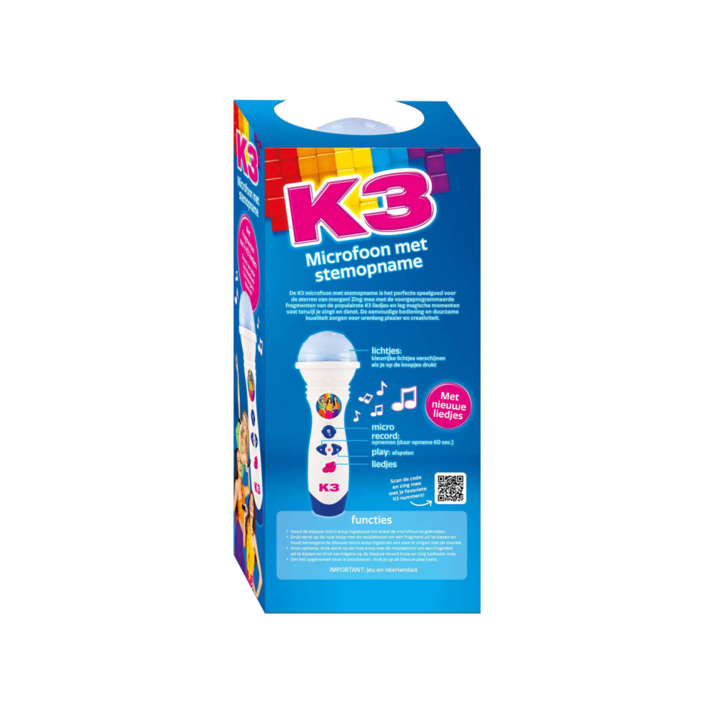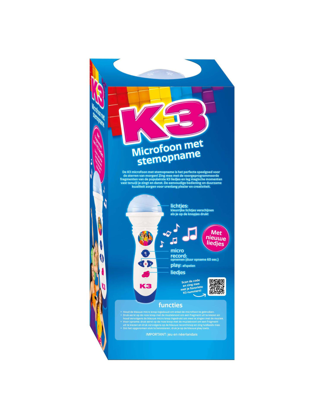 De K3 microfoon met stemopname is het perfecte speelgoed voor de sterren van morgen! Zing mee met de voorgeprogrammeerde fragmenten van de populairste K3 liedjes en leg magische momenten vast terwijl je zingt en danst. De eenvoudige bediening en duurzame kwaliteit zorgen voor urenlang plezier en creativiteit.