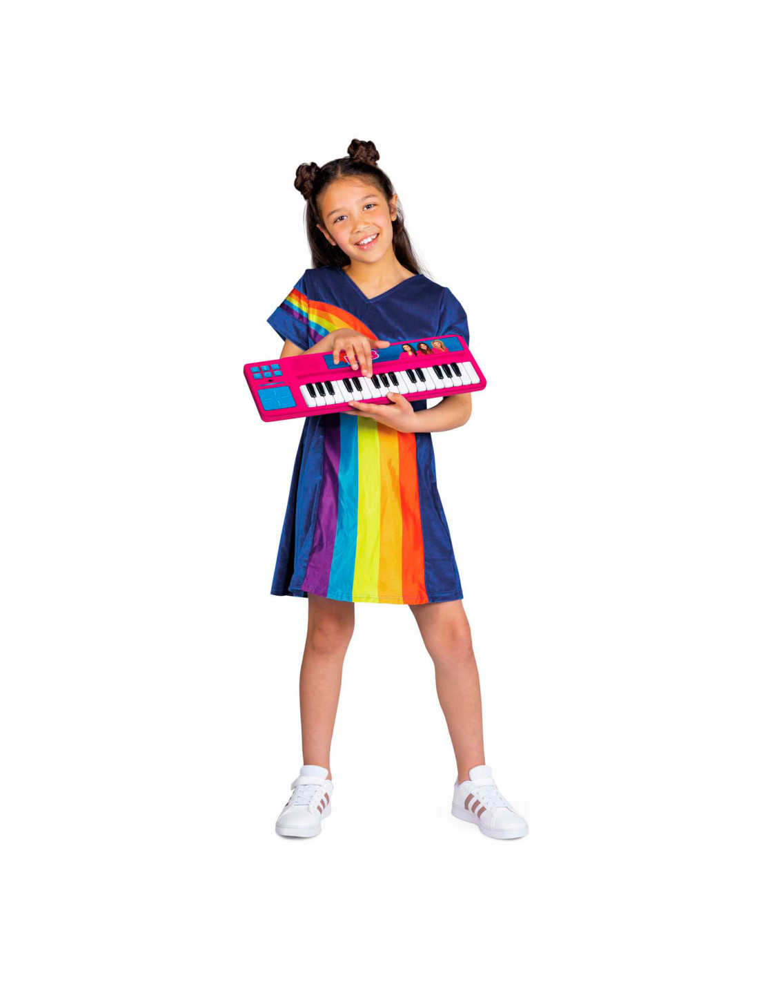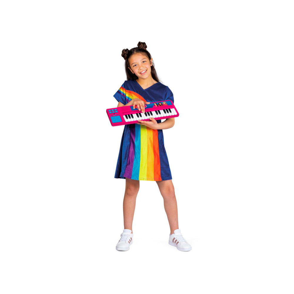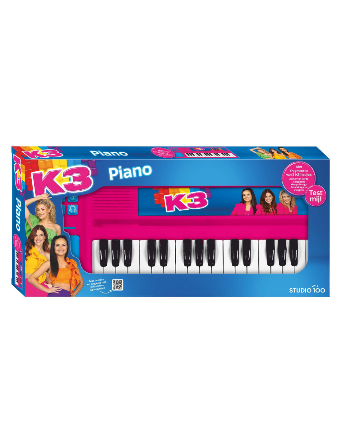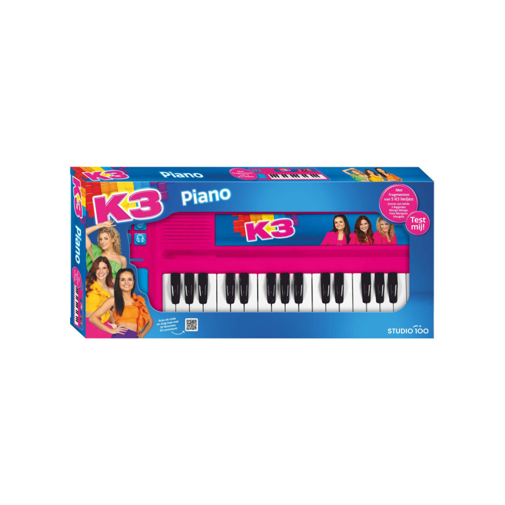"Welkom, welkom in de wereld van de K3 muziek! Met deze coole K3 piano kunnen jonge muzikanten hun creativiteit tot leven brengen en een liefde voor muziek ontwikkelen! Met geprogrammeerde fragmenten van de mooiste K3 liedjes en de stemmen van Julia, Hanne en Marthe! - Componeer met deze piano met hoofdtelefoon-aansluiting je eigen K3 nummers. - Inclusief 3x AAA 1,5V batterijen. - Met fragmenten van 5 K3 liedjes: Zomer van liefde, 3 Biggetjes, Mango Mango, Fata Morgana en Vleugels. - Met aansluiting voor hoofdtelefoon. - Schakelt automatisch naar off mode als deze 3 minuten niet wordt gebruikt. - Bevat een knop om van toonaard te wisselen. - Bevat een knop om achtergrondgeluiden toe te voegen. - Bevat een knop met verschillende aanmoedigingen door de meiden van K3. - Inclusief drumpad die van toonaard kan veranderen. - Inclusief tablethouder. - Vanaf 3 jaar. **Extra:** Scan de QR-code op de verpakking en zing mee met je favoriete K3 nummers! "