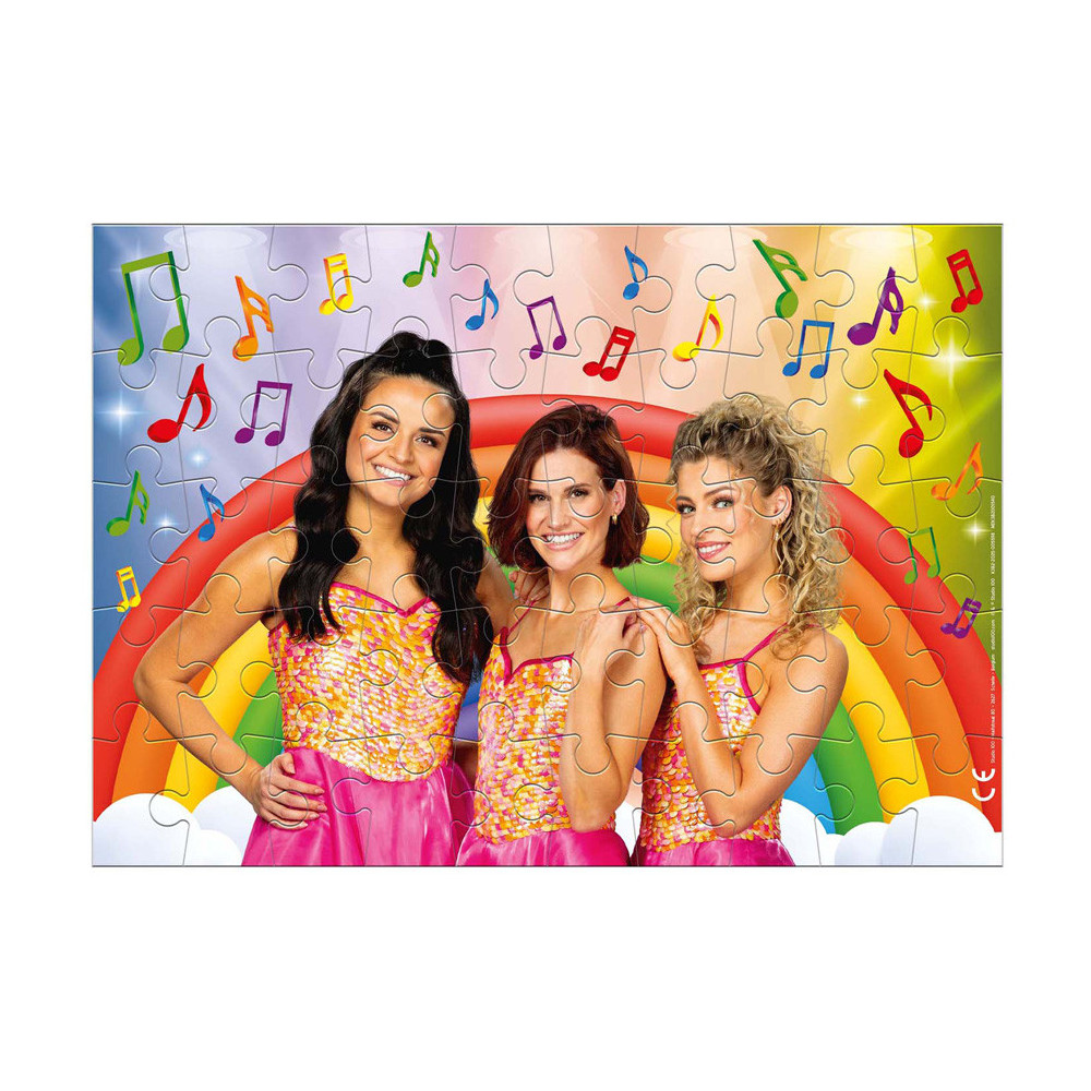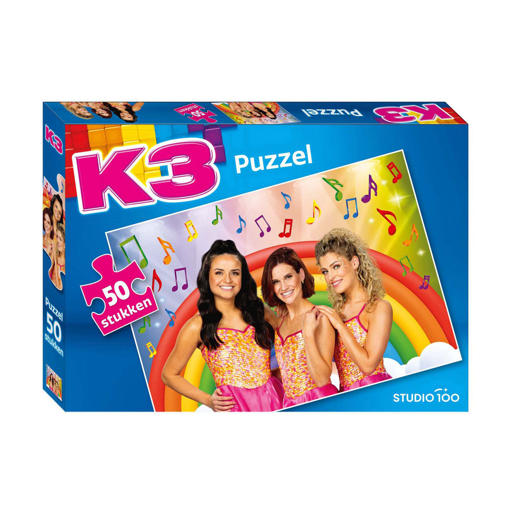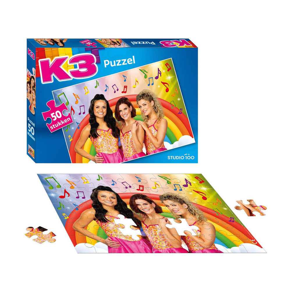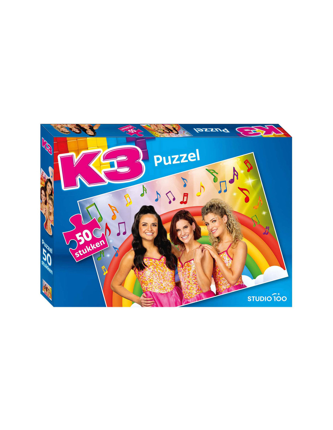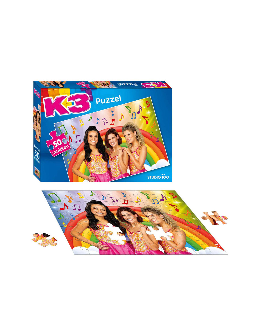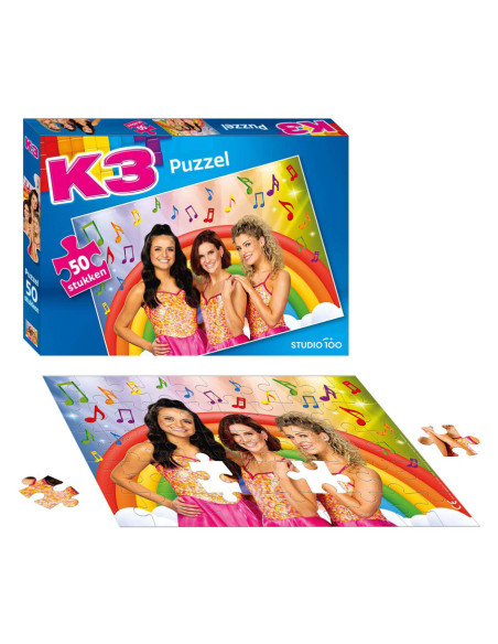 De K3 puzzel met 50 stukjes van karton met een kleurrijke afbeelding van de K3-meisjes in hun jurk uit 'Het lied van de Zeemeermin'. Geschikt voor kinderen vanaf 4 jaar.