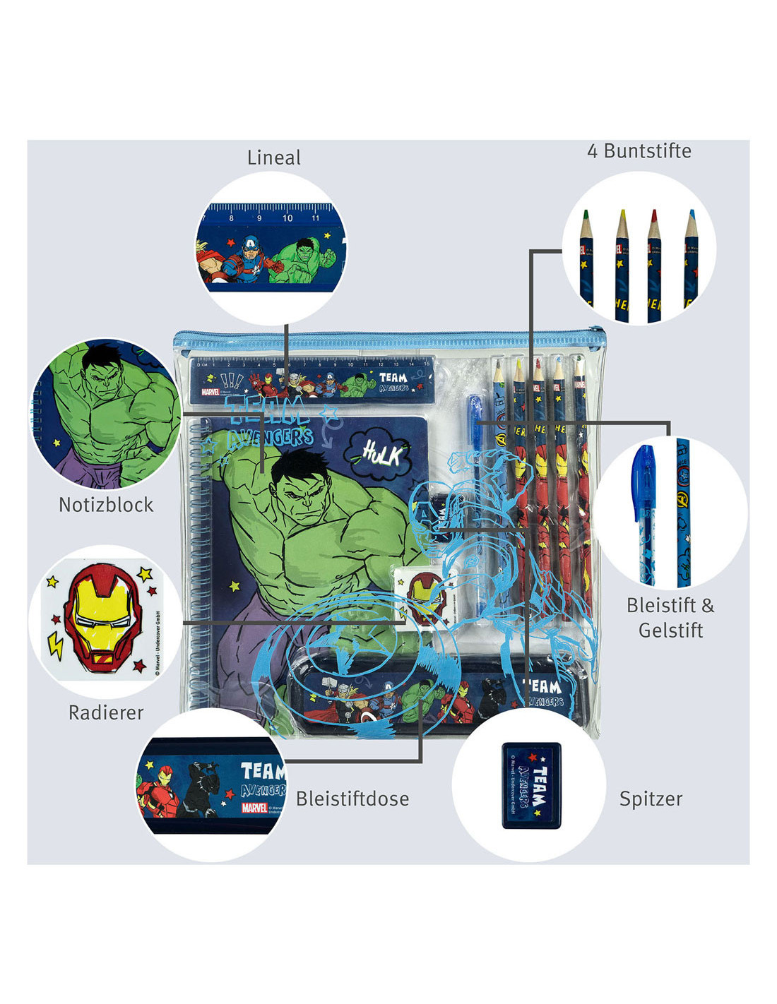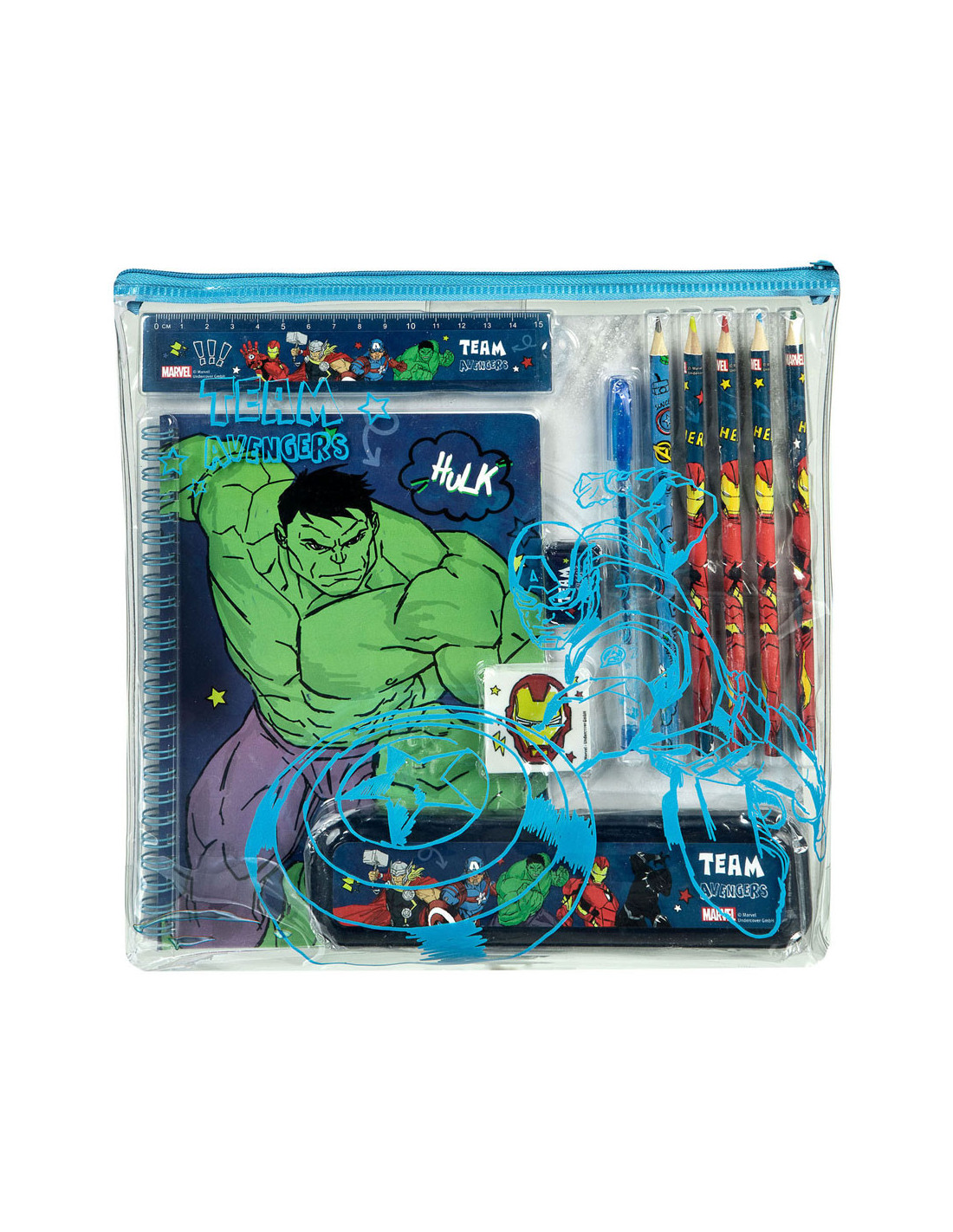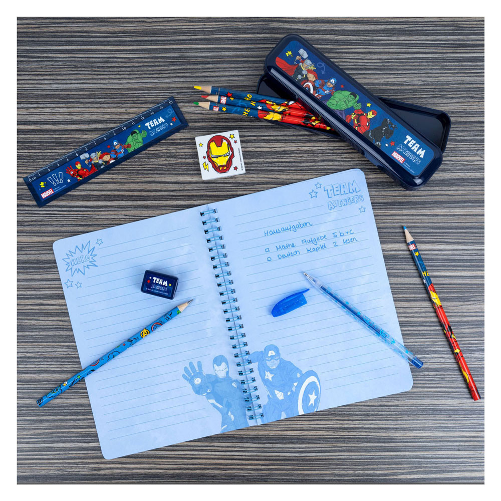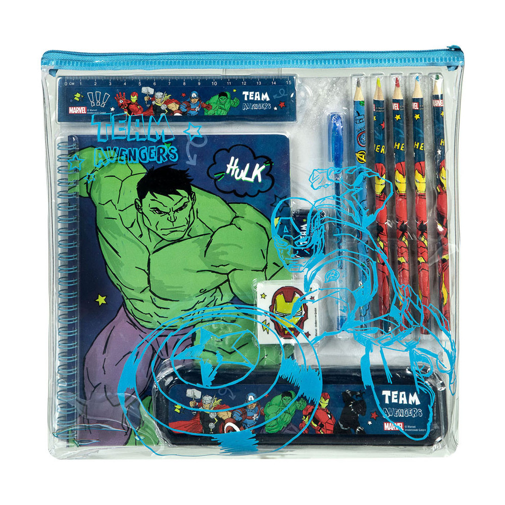 Transparant PVC-etui vol schrijfwaren van De Avengers. Inhoud: