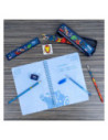 notitieset notitieblok, pennenbakje, potlood, 4 kleurpotloden, gelpen, gum, puntenslijper, liniaal. Geschikt vanaf 3 jaar.