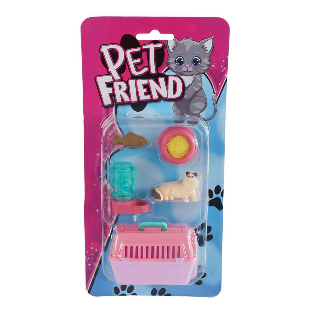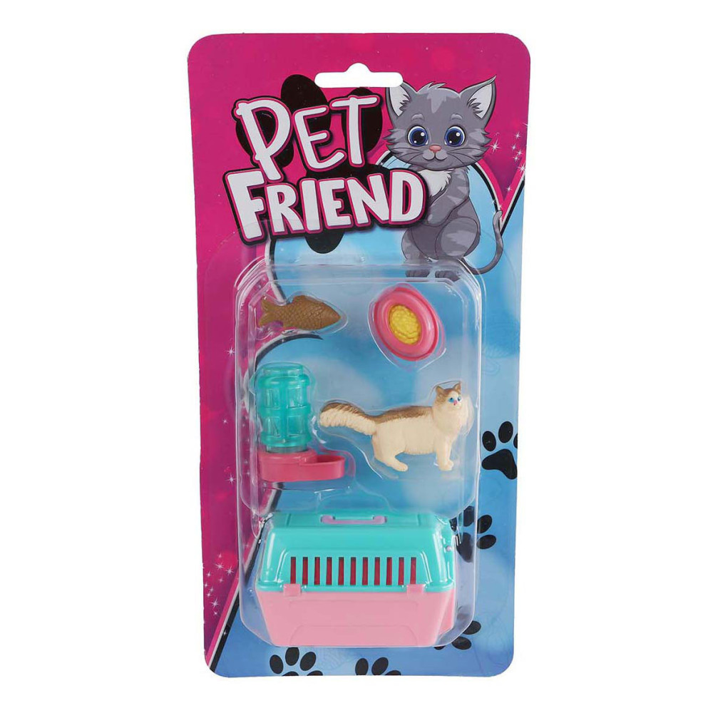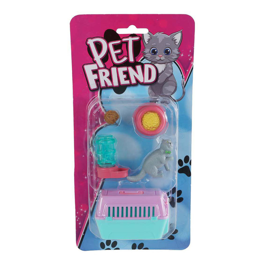 Kat en reismandje met accessoires. Afmeting kat: 7,5 cm.