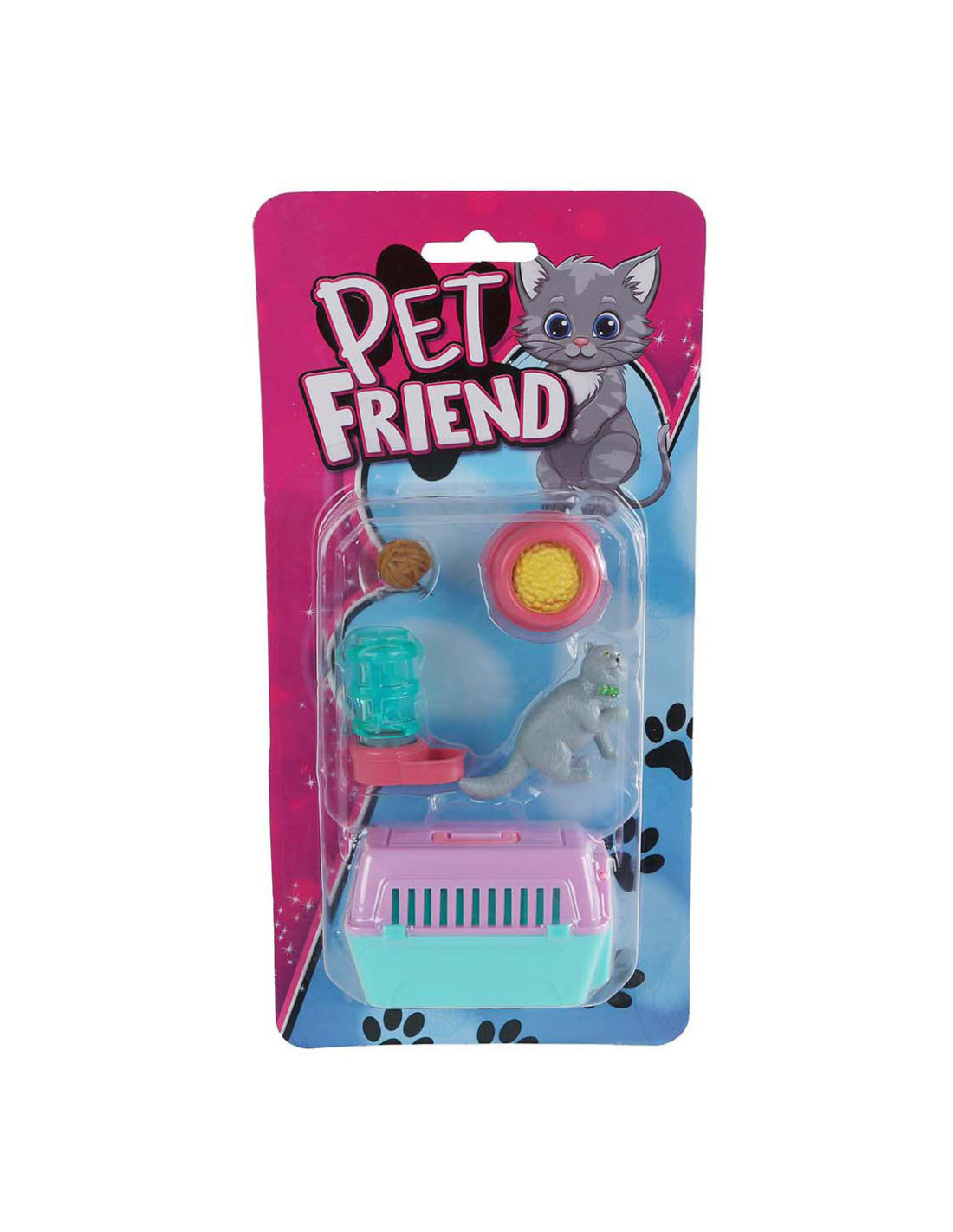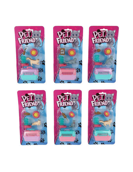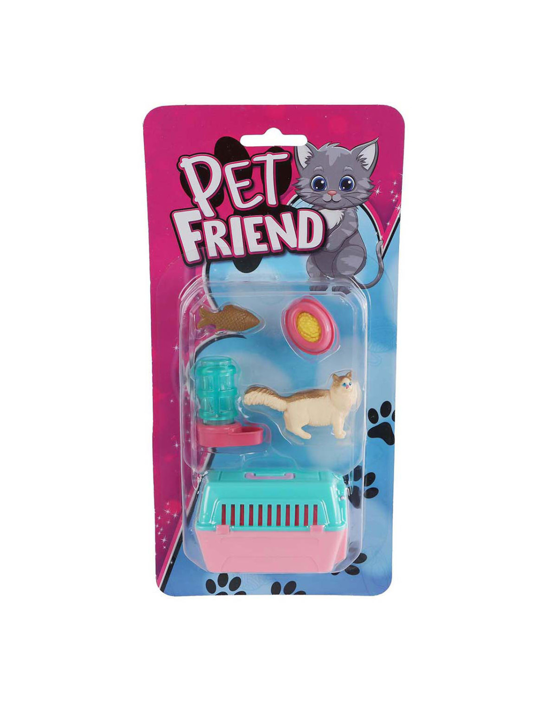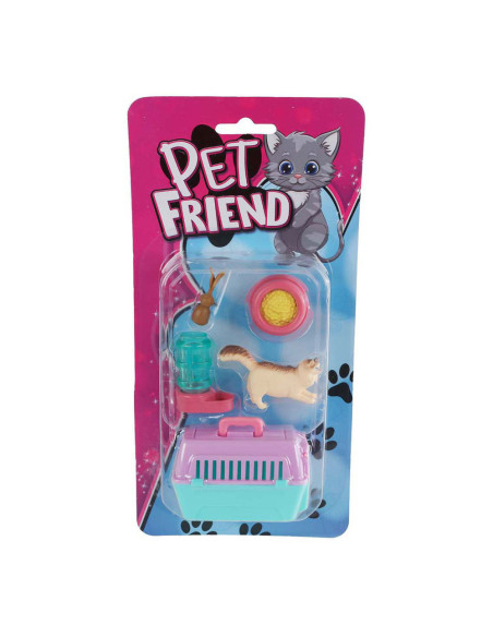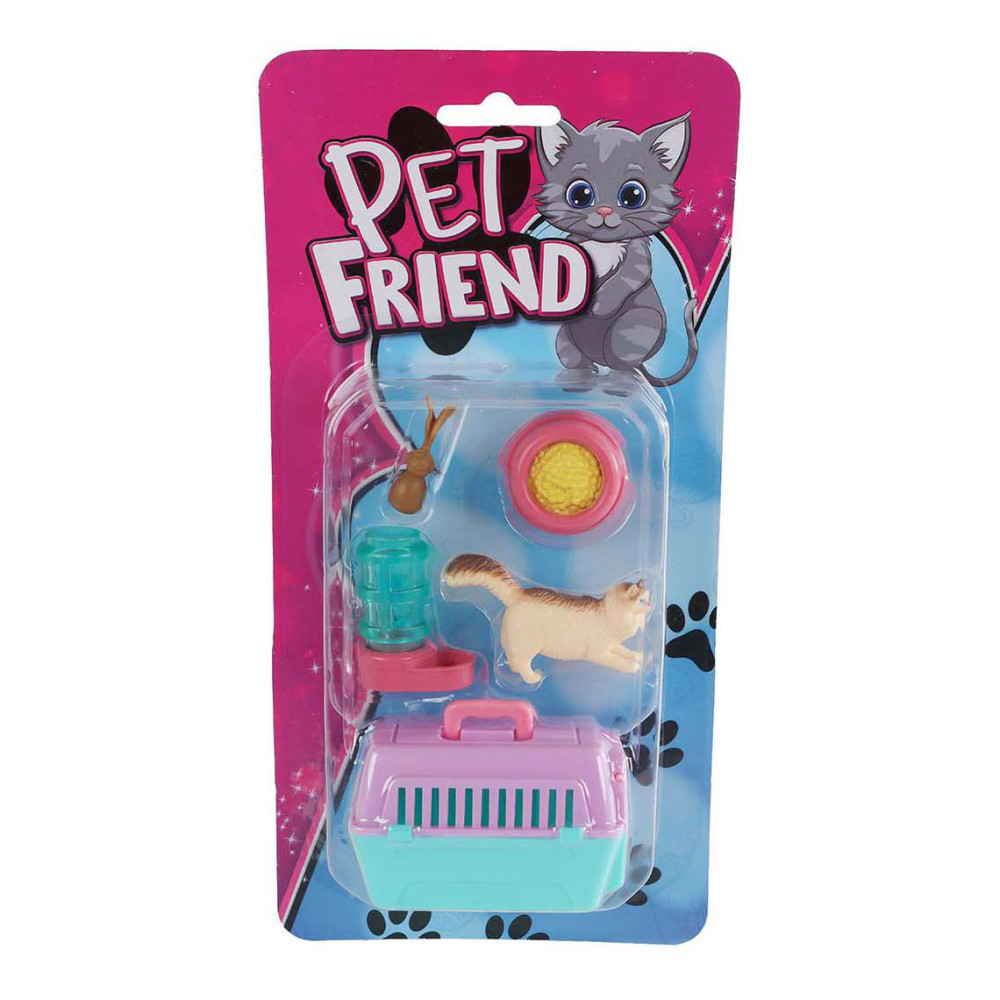 Kat en reismandje met accessoires. Afmeting kat: 7,5 cm.