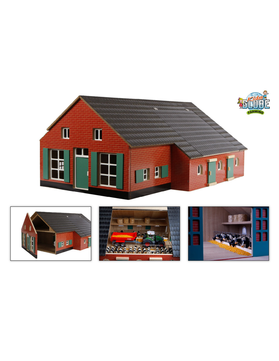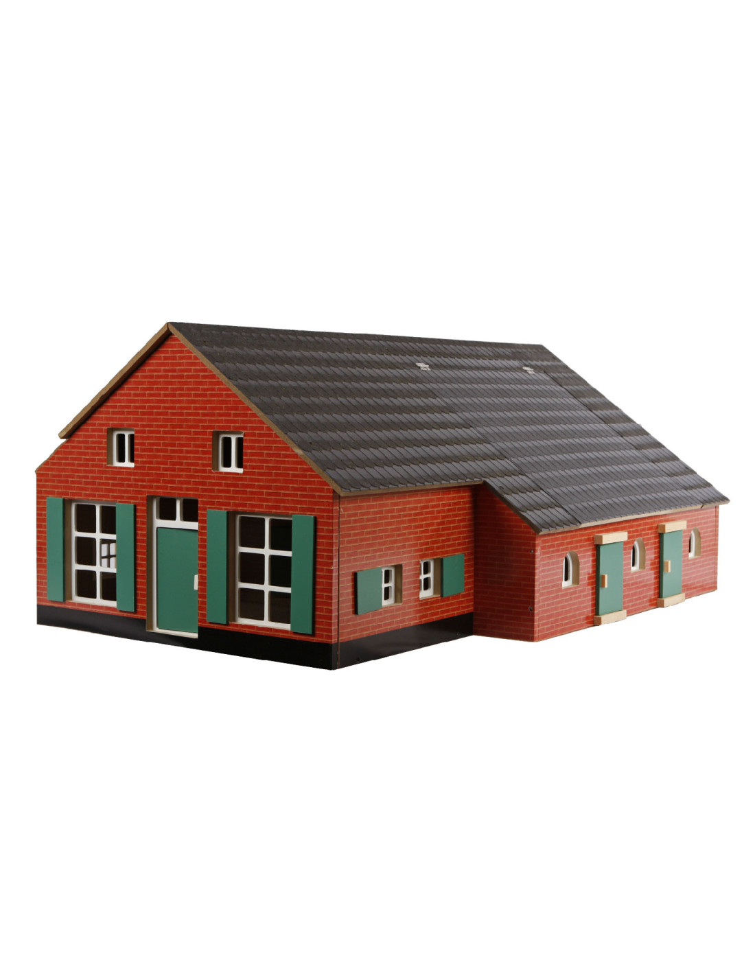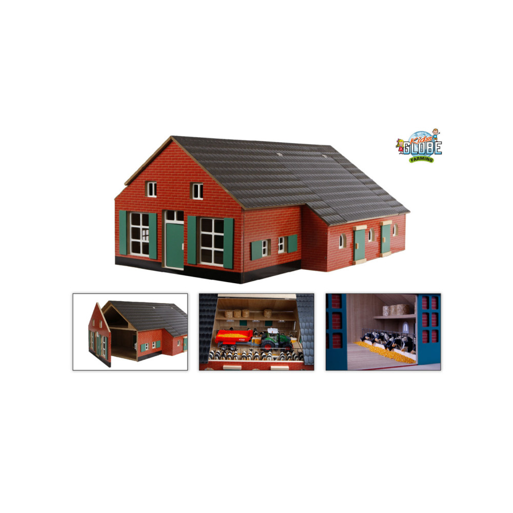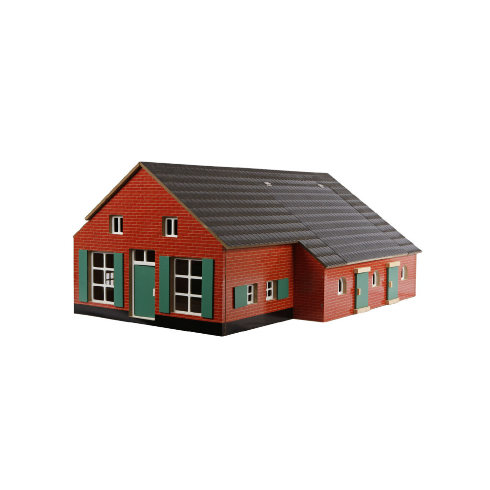 In deze Boerderij met Woonhuis en Stal zou je toch willen wonen. Het woongedeelte kan geopend worden door de voorpui open te schuiven. Het woongedeelte heeft 1 kamer met trap die naar de zolder leidt. Via de deur in het woongedeelte kom je in de grote stal.Het dak kan door middel van een klep open zodat je ook zo bij de stal kunt. Verder hebben de woonboerderij en de stal nog raampjes die open- en dicht kunnen. Aan de achterkant van de stal zijn er 2 grote schuifdeuren waar trekkers door naar buiten en binnen kunnen rijden, ook heeft de stal een zolder om bijvoorbeeld hooibalen op te bergen. De woonboerderij en stal zijn gemaakt van solide hout, bevatten kleine details en zien er hierdoor levensecht uit. Schaal 1:32. Wordt geleverd zonder accessoires.
