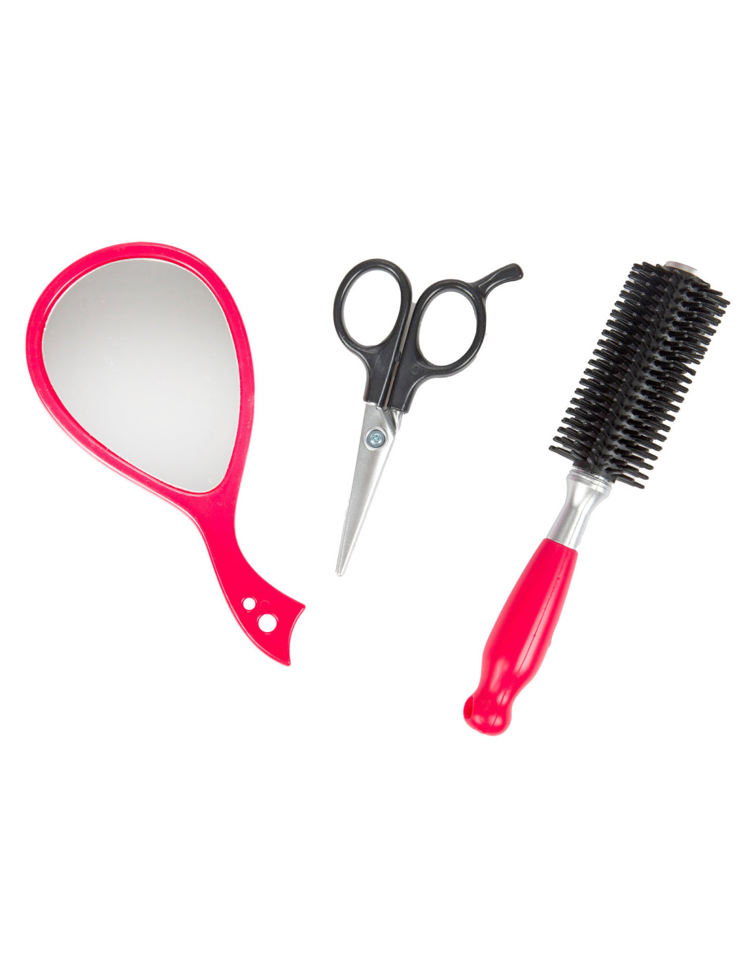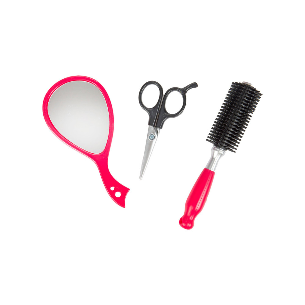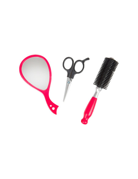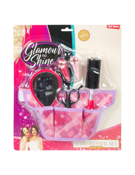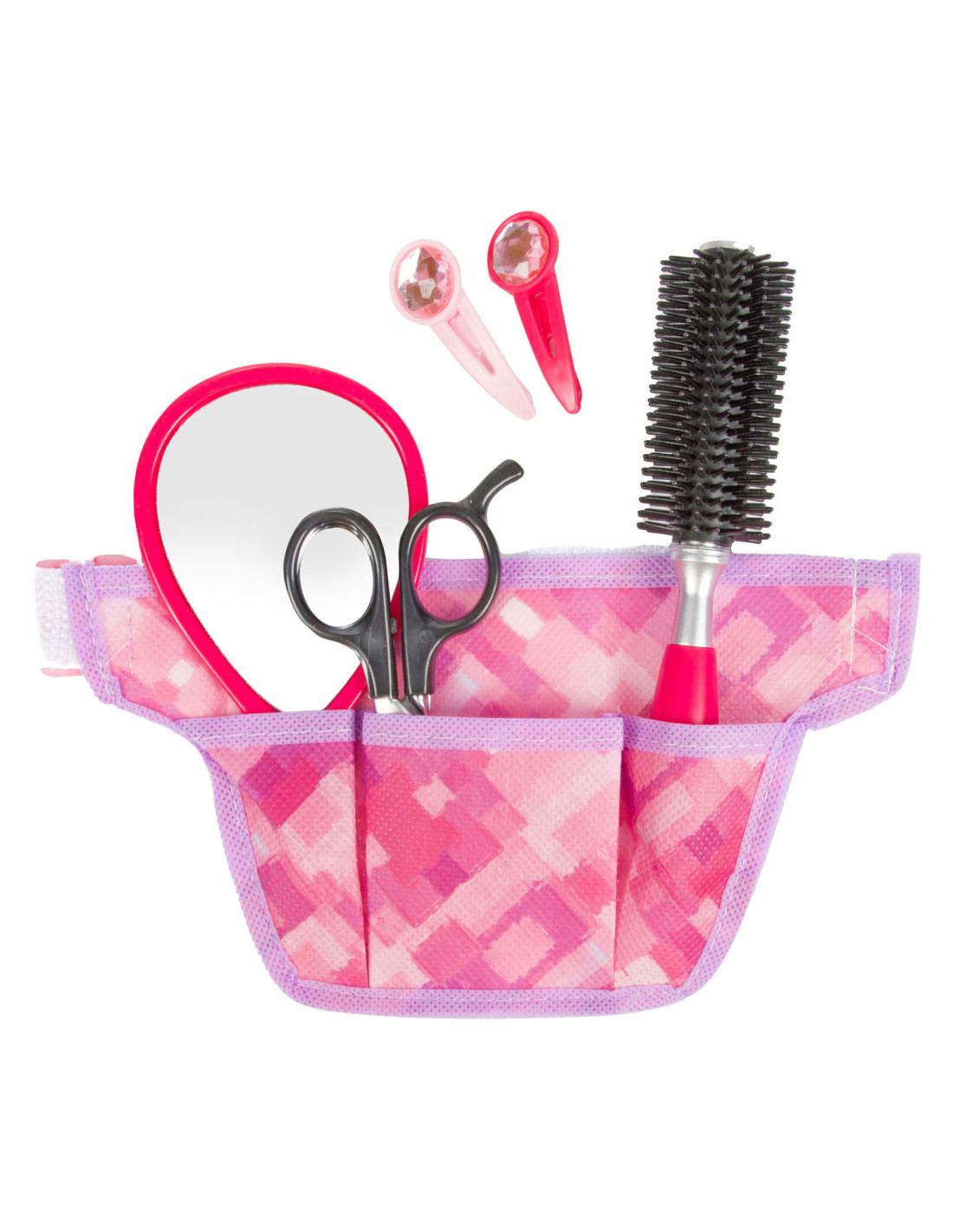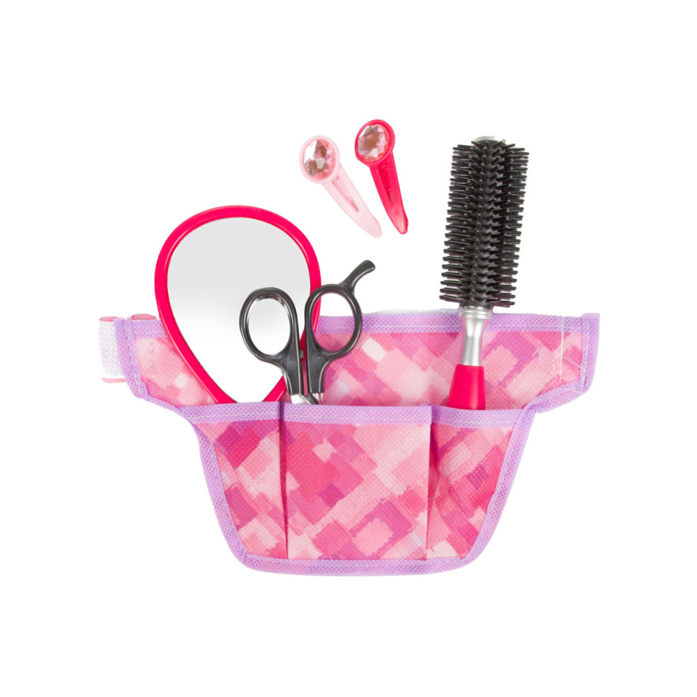 Roze heuptasje met kappersaccessoires: spiegel, schaar, borstel en 2 haarclips. Geschikt voor kinderen van 3 jaar en ouder.