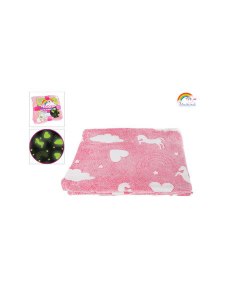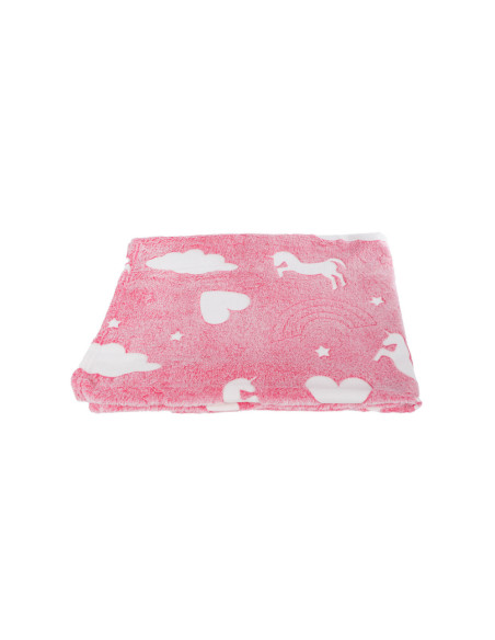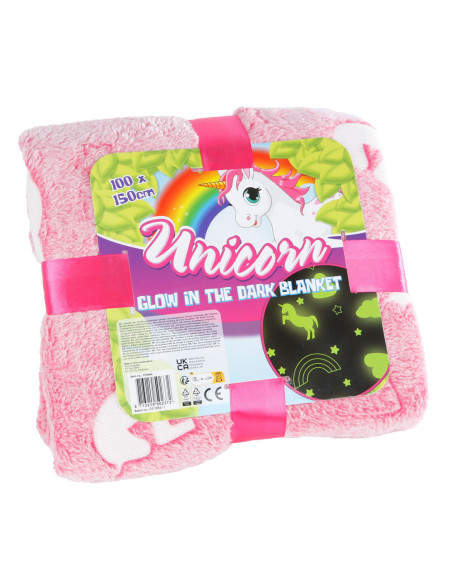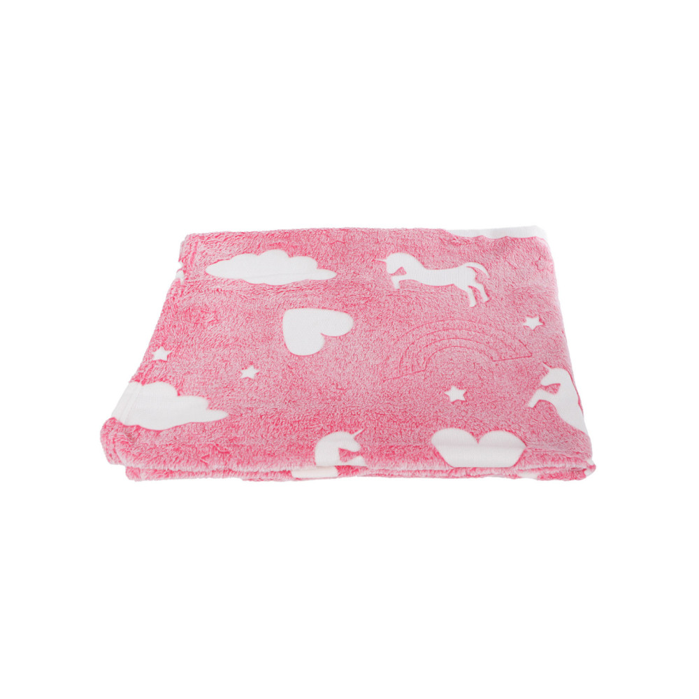 Zachte, roze deken met eenhoornprint en glow in the dark effect. Afmetingen: 100 x 150 centimeter.
