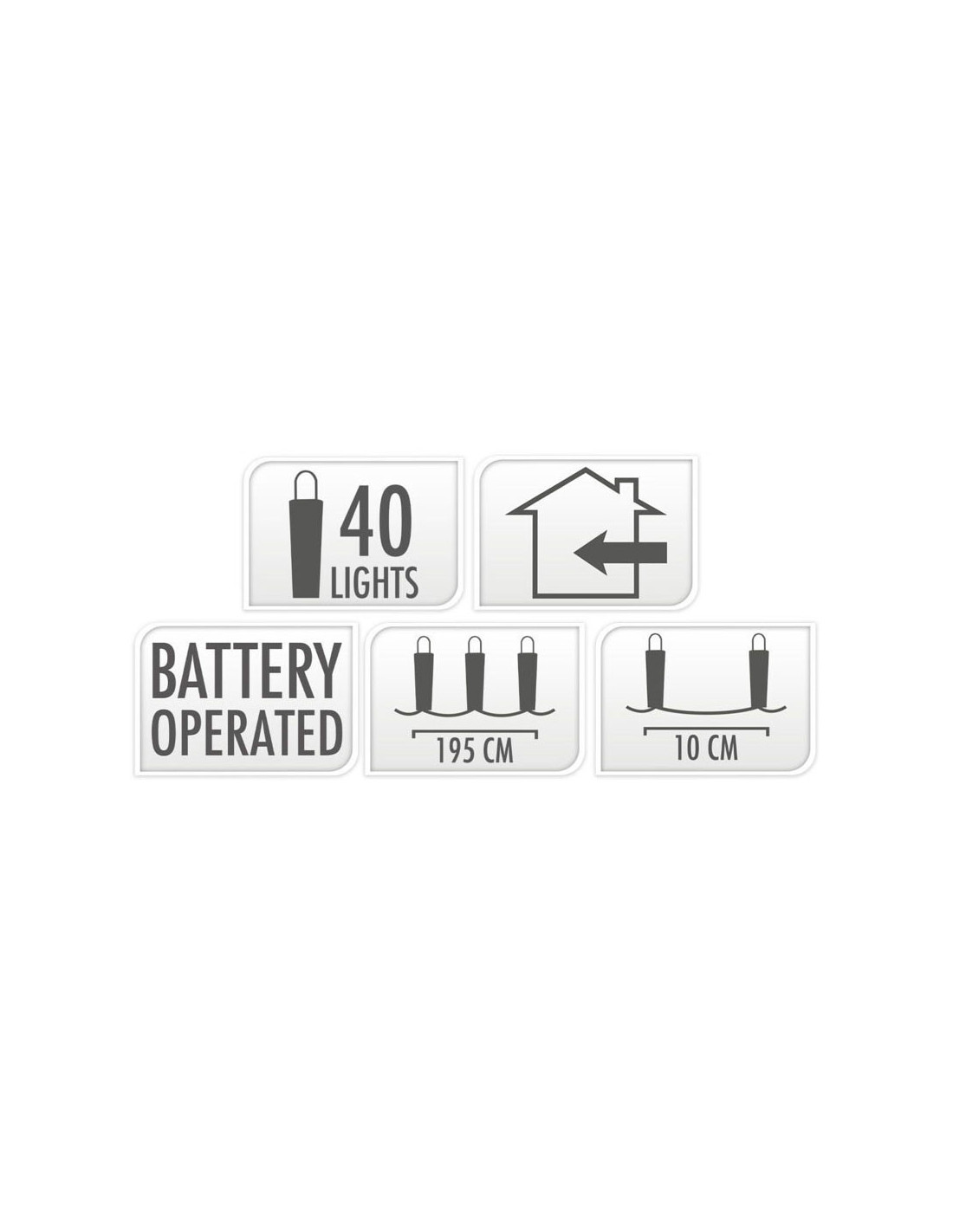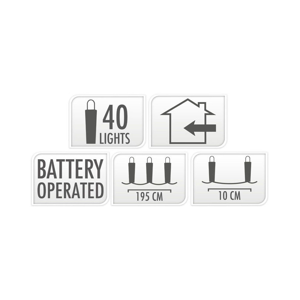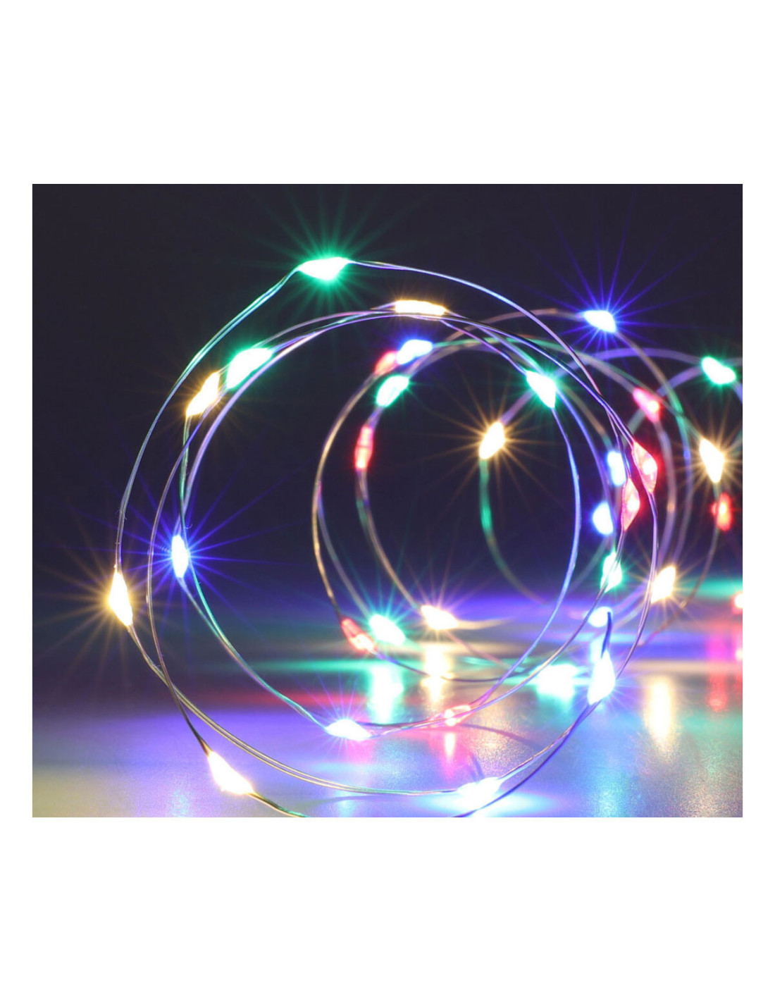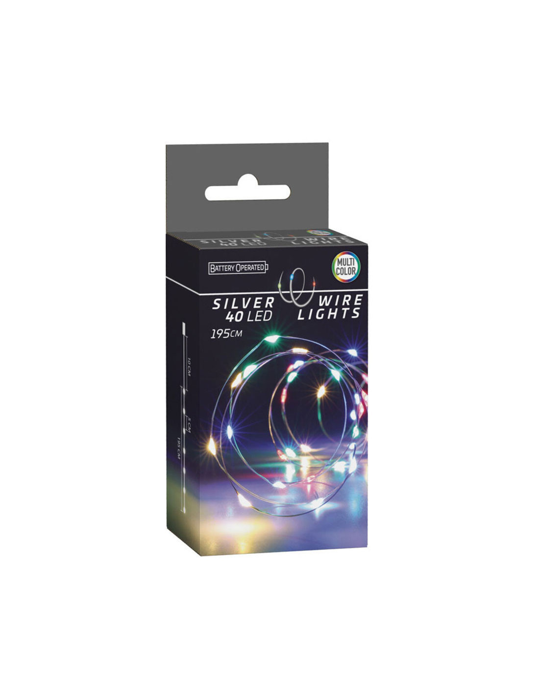 Zilverdraad met 40 gekleurde ledlichtjes. Het buigzame snoer is 195 centimeter lang en werkt op batterijen (3 AA niet inbegrepen). Geschikt voor gebruik binnenshuis.