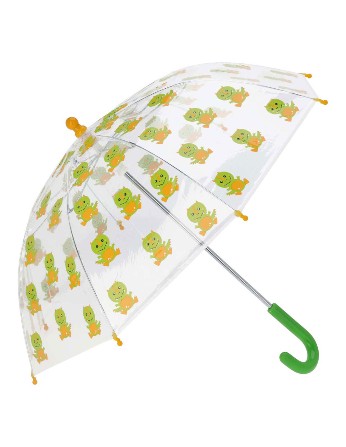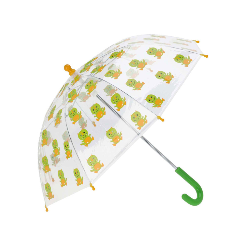 Transparante kinderparaplu met groen handvat en dinopatroon.