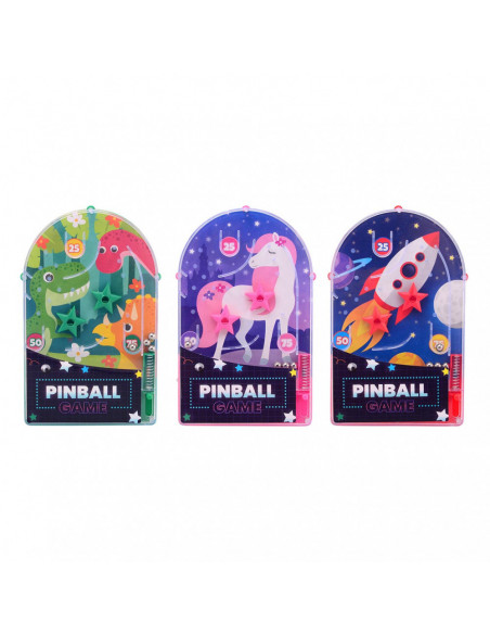 Flipperspelletje van Johntoy met dino-, eenhoorn- en ruimtethema. Afmetingen: 15,0 x 2,0 x 28,0 centimeter. Niet geschikt voor kinderen onder de 3 jaar oud.