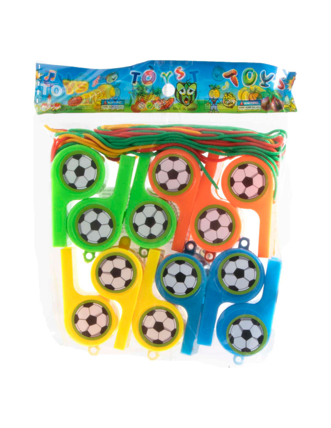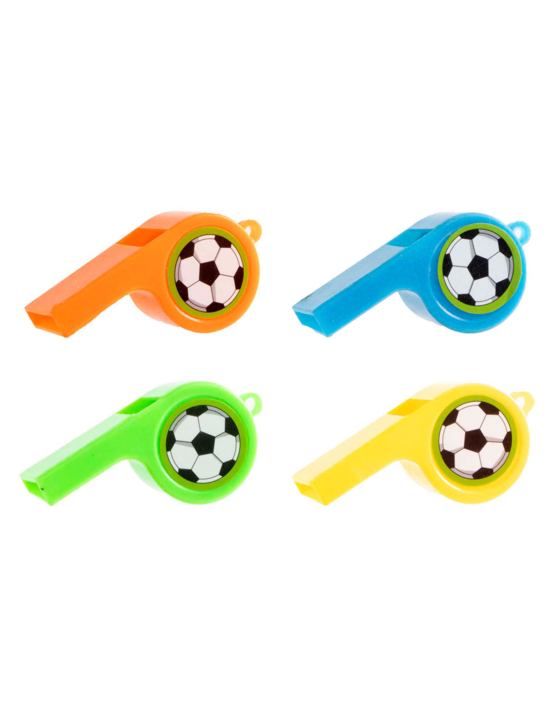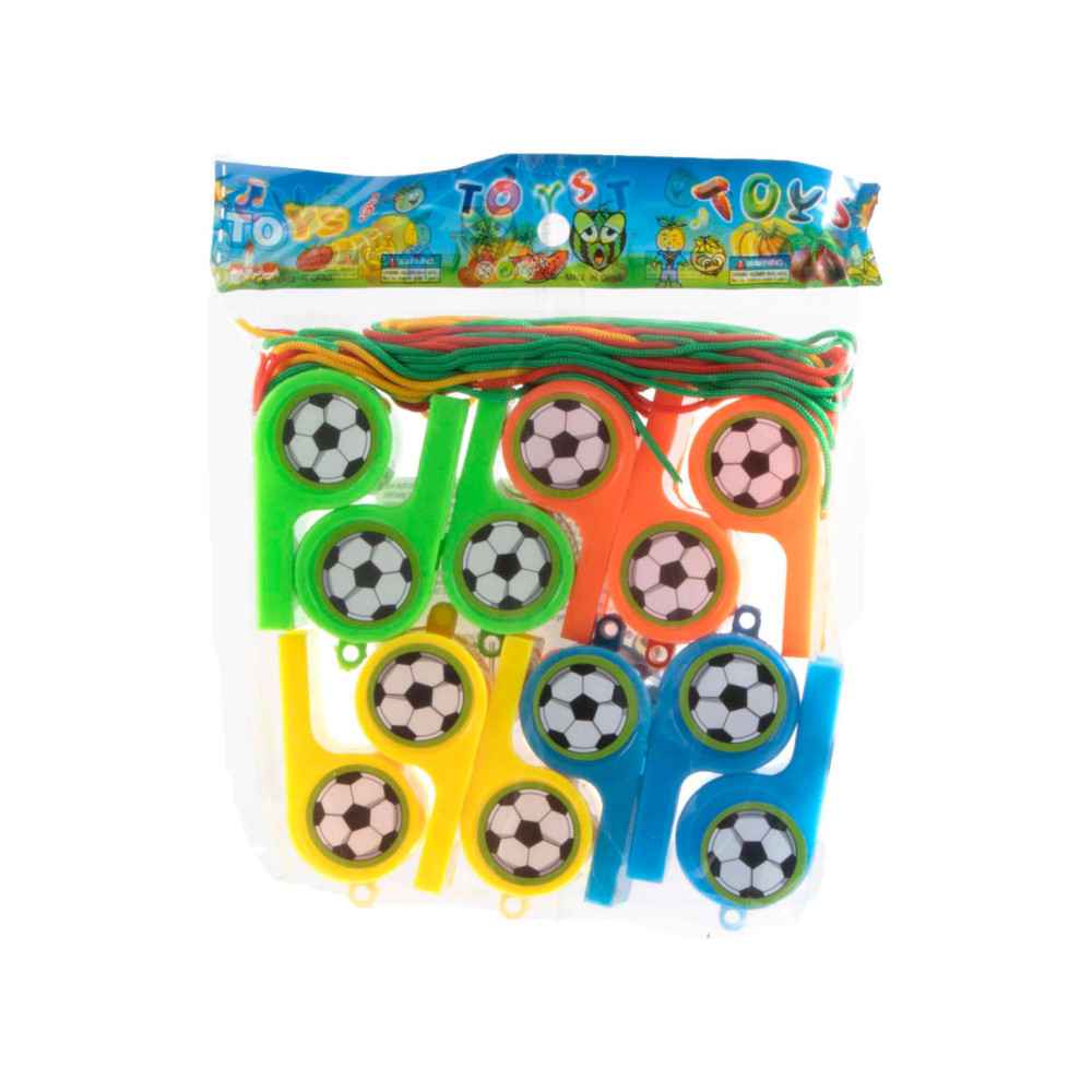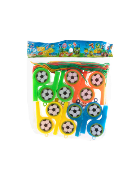 Set met 12 voetbalfluitjes + koorden. Geschikt voor kinderen vanaf 3 jaar