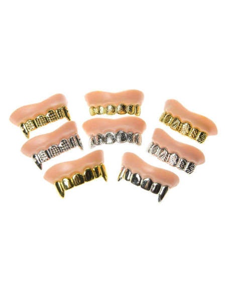 Foptanden (grillz) in goud of zilver, gemaakt van rubber. Comfortabel om te dragen. De foptanden zijn ca. 7 centimeter groot.