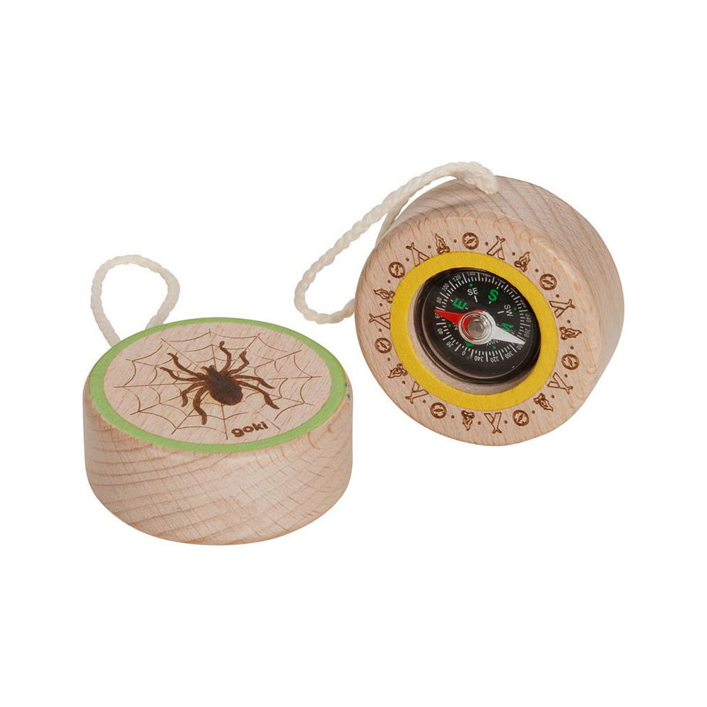 Houten kompas van Goki. Op de achterkant van het kompas staat een grote spin afgebeeld. Doormiddel van het geïntegreerde koord is het ook mogelijk om het kompas ergens op te hangen. Geschikt voor kinderen vanaf 3 jaar.