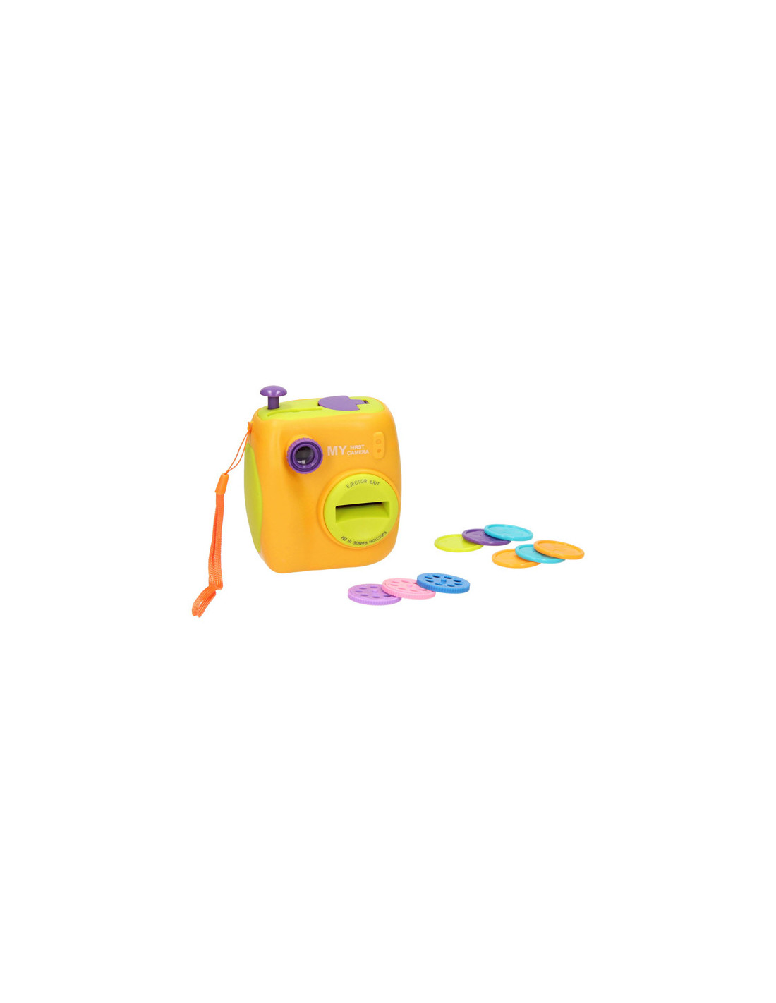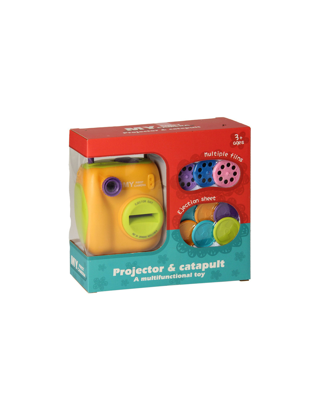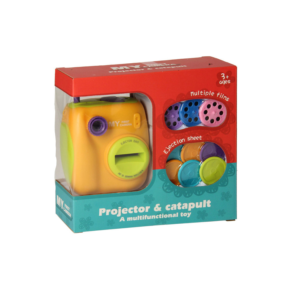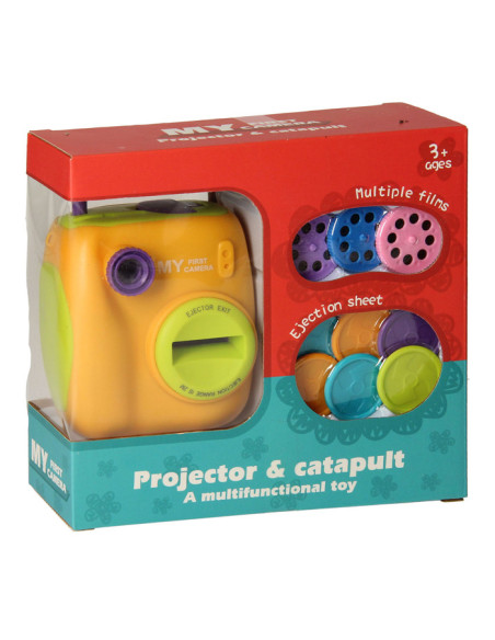 Twee keer plezier in één stuk speelgoed! Deze projector fotocamera bevat 3 schijven met verschillende leuke plaatjes om te projecten. Zet ze in de camera en projecteer op de muur. Cool! Daarnaast bevat de camera 6 gekleurde, ronde schijven die je kunt lanceren met de uitwerpknop. De camera werkt op 3 knoopcelbatterijen (AG13). Deze zijn inbegrepen. Geschikt voor kinderen van 3 jaar en ouder.