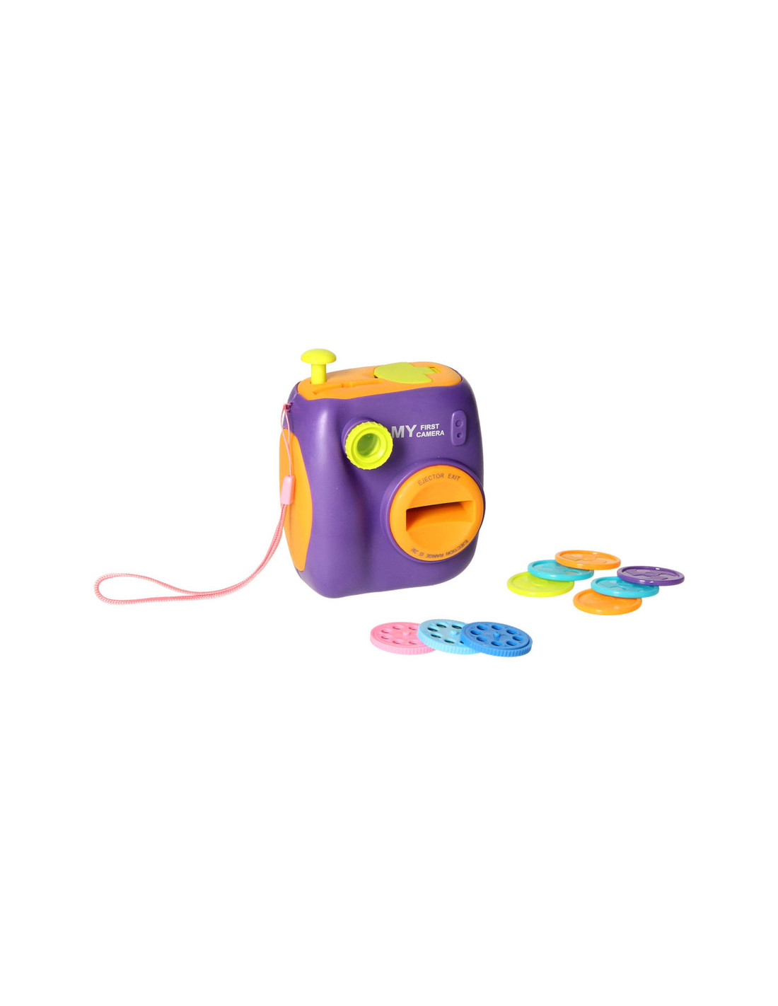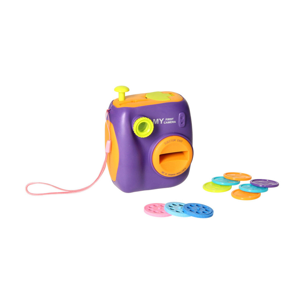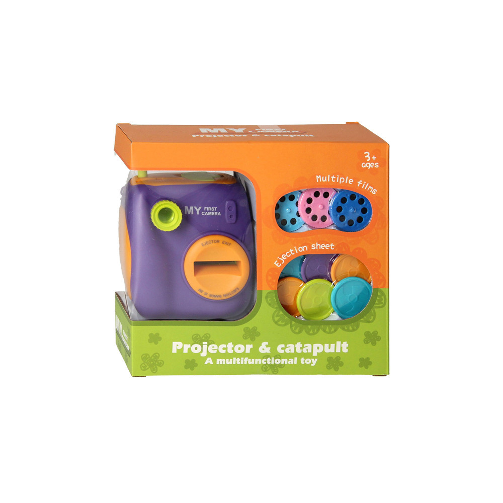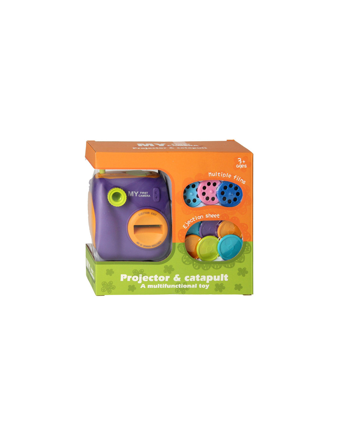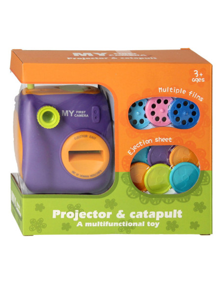Twee keer plezier in één stuk speelgoed! Deze projector fotocamera bevat 3 schijven met verschillende leuke plaatjes om te projecten. Zet ze in de camera en projecteer op de muur. Cool! Daarnaast bevat de camera 6 gekleurde, ronde schijven die je kunt lanceren met de uitwerpknop. De camera werkt op 3 knoopcelbatterijen (AG13). Deze zijn inbegrepen. Geschikt voor kinderen van 3 jaar en ouder.