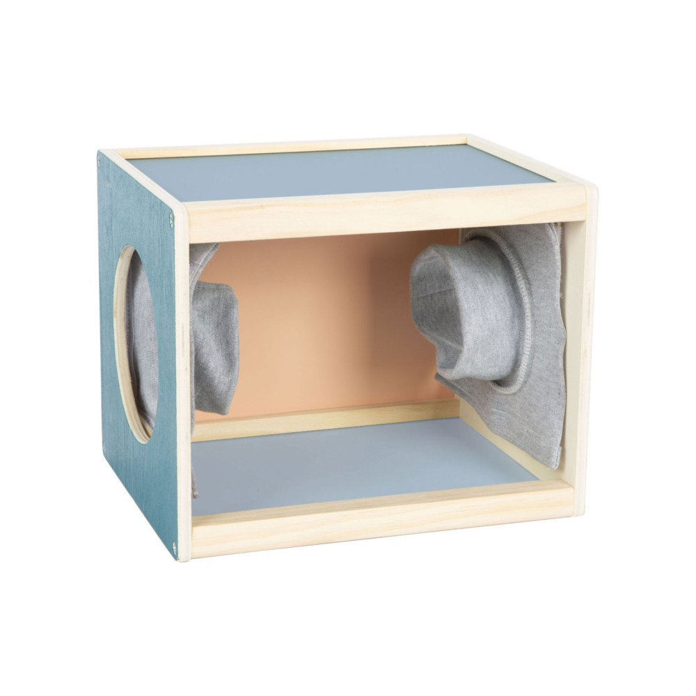 • Grote houten voeldoos met twee armopeningen om naar binnen te reiken en voorwerpen aan te raken