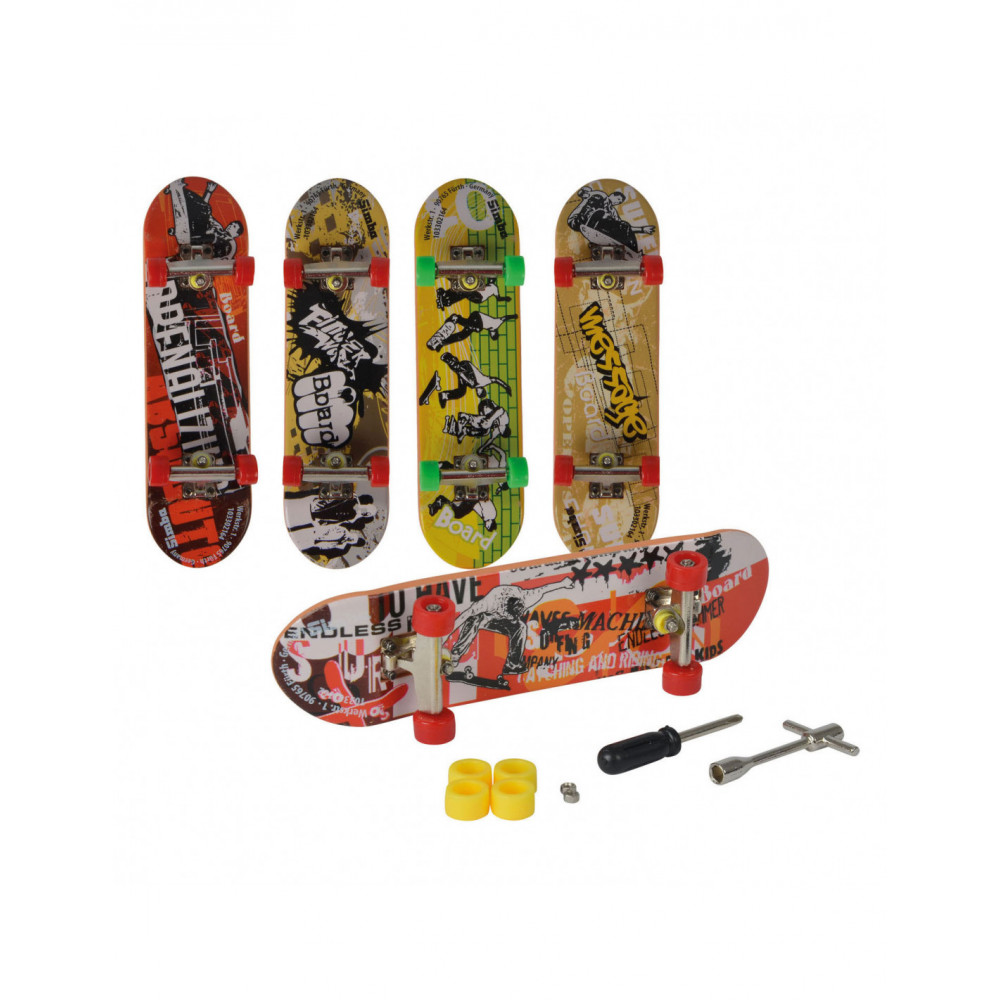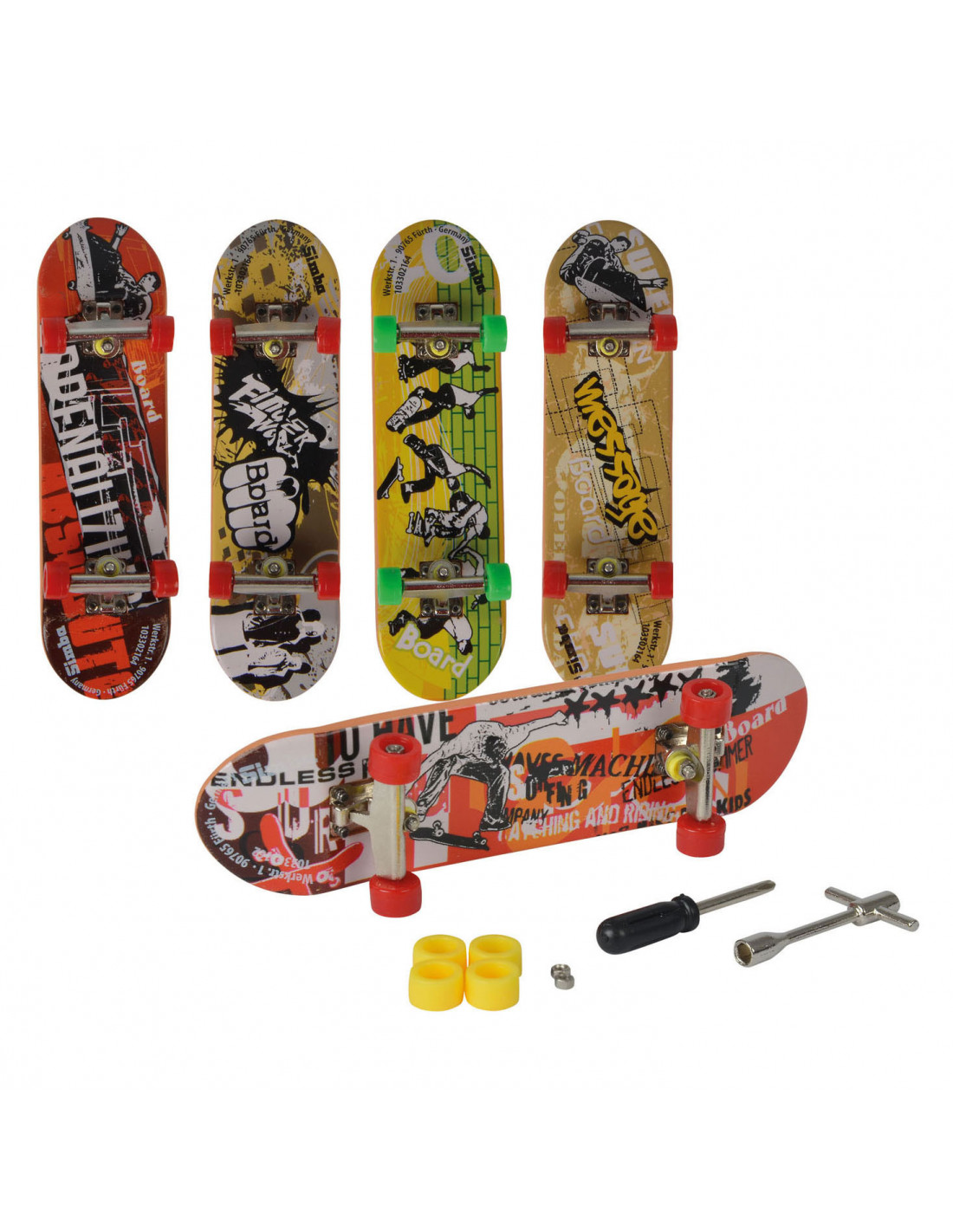 Met dit vingerskateboard van Simba stunt en race jij erop los met je vingers. Plaats je wijs- en middelvinger op het board en boarden maar! Het vingerskateboard heeft een stoere print en is ongeveer 9 centimeter groot. In de set zitten reservewieltjes die je met het bijgeleverde gereedschap en de schroefjes zelf kunt vervangen.