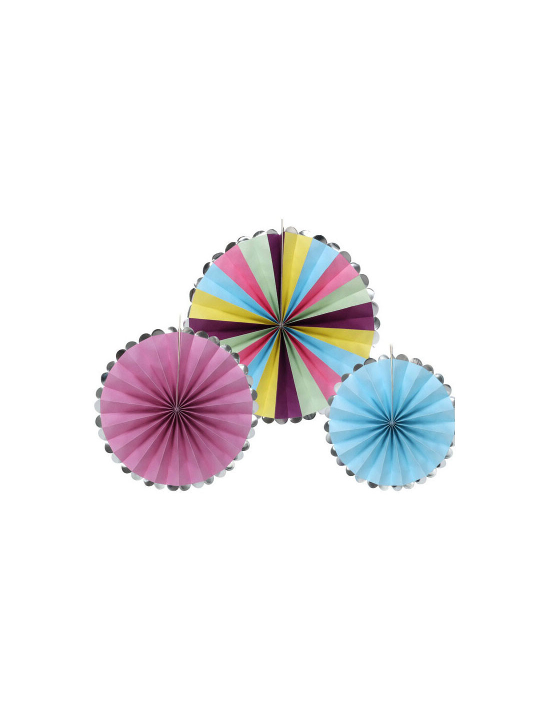 Set van 3 papieren waaiers. De waaiers zijn verschillende van grootte en kleur. De waaiers zijn afgewerkt met een zilveren randje. Het formaat van de waaiers zijn: 30 cm, 25 cm en 21 cm.