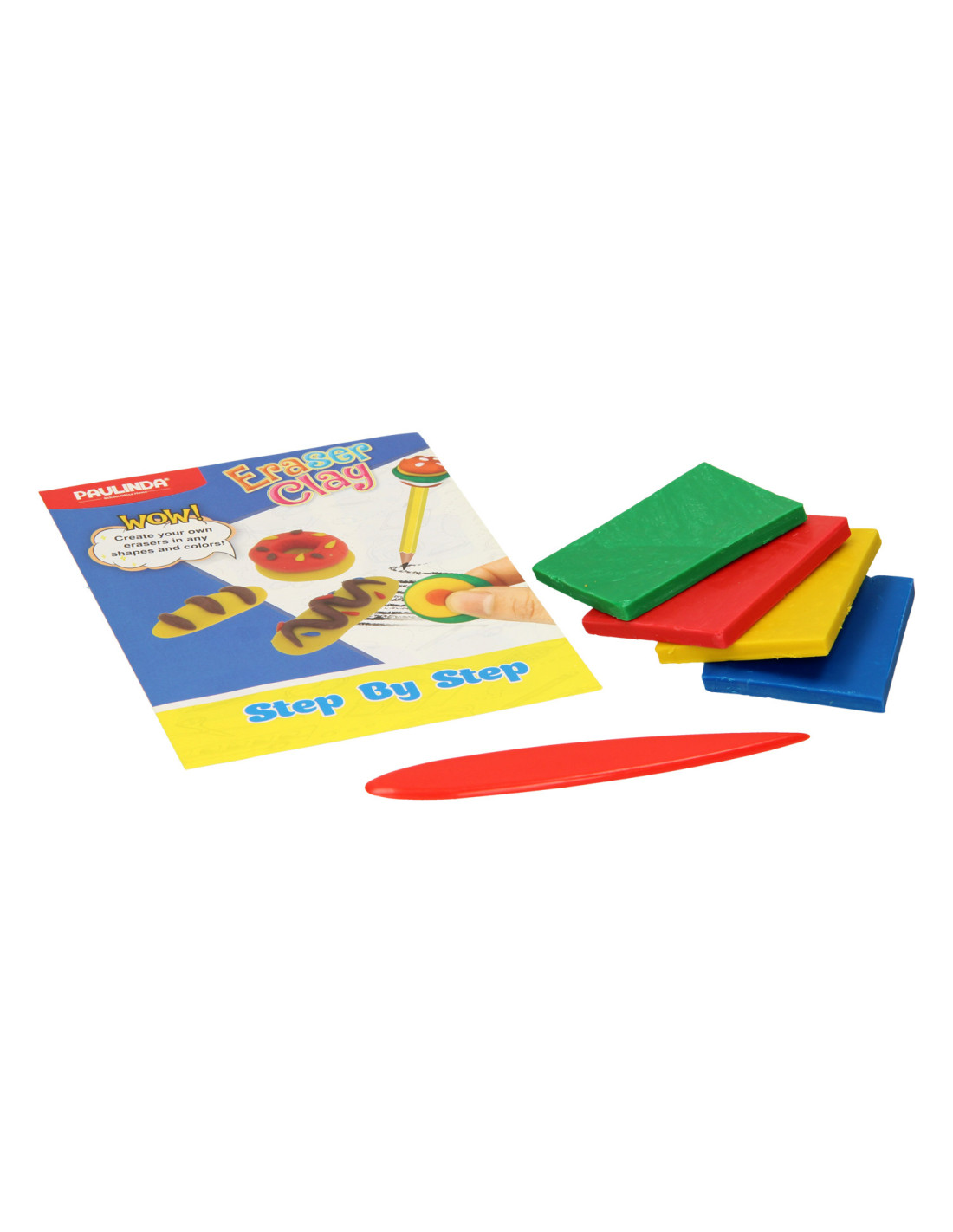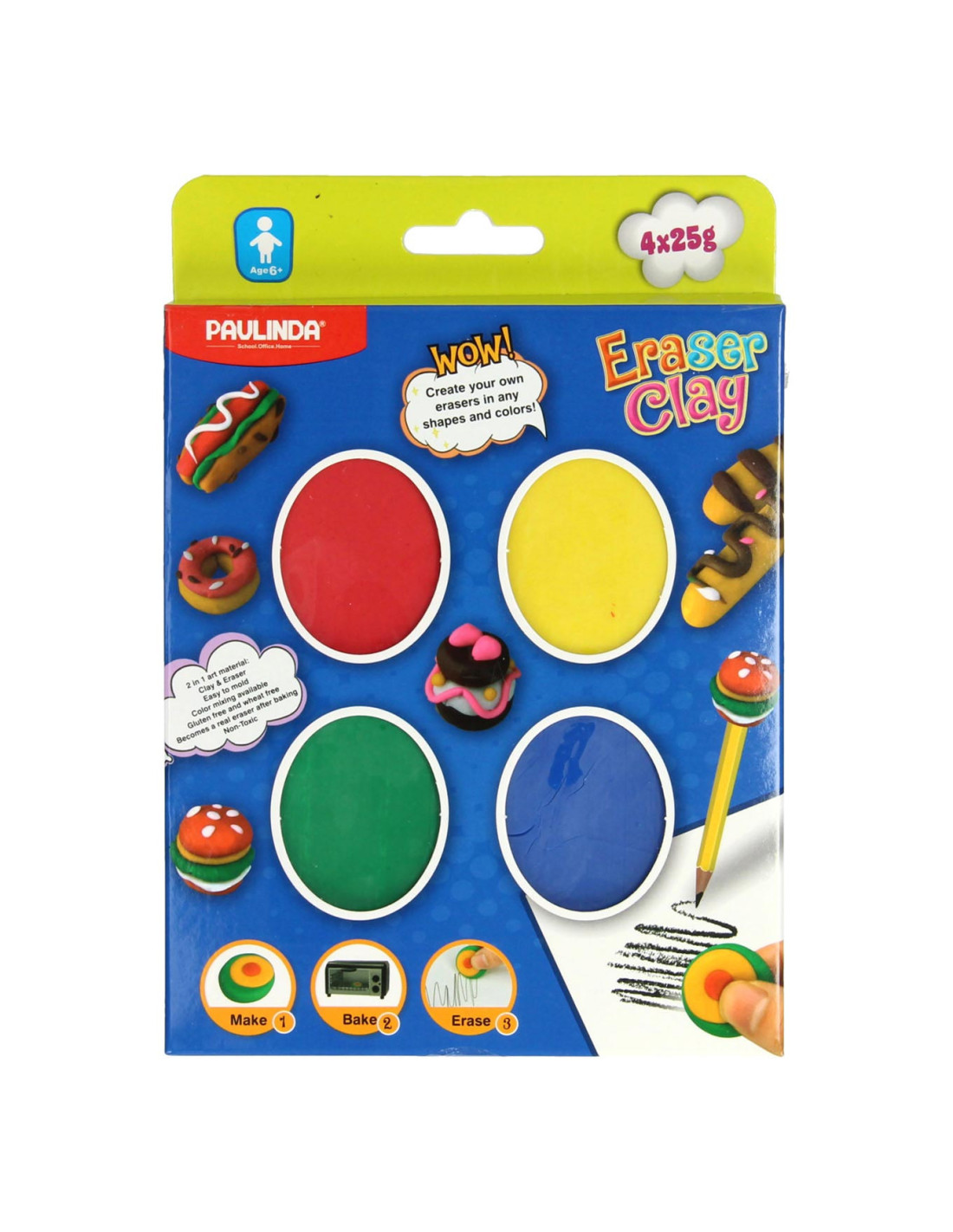 Je kunt met de klei in deze knutselset 4 echte gummen kleien. Even afbakken en de gummen kunnen gebruikt worden om foutjes mee uit te wissen. Laat je fantasie de vrije loop gaan en maak je eigen gummen. Geschikt voor kinderen vanaf 6 jaar.