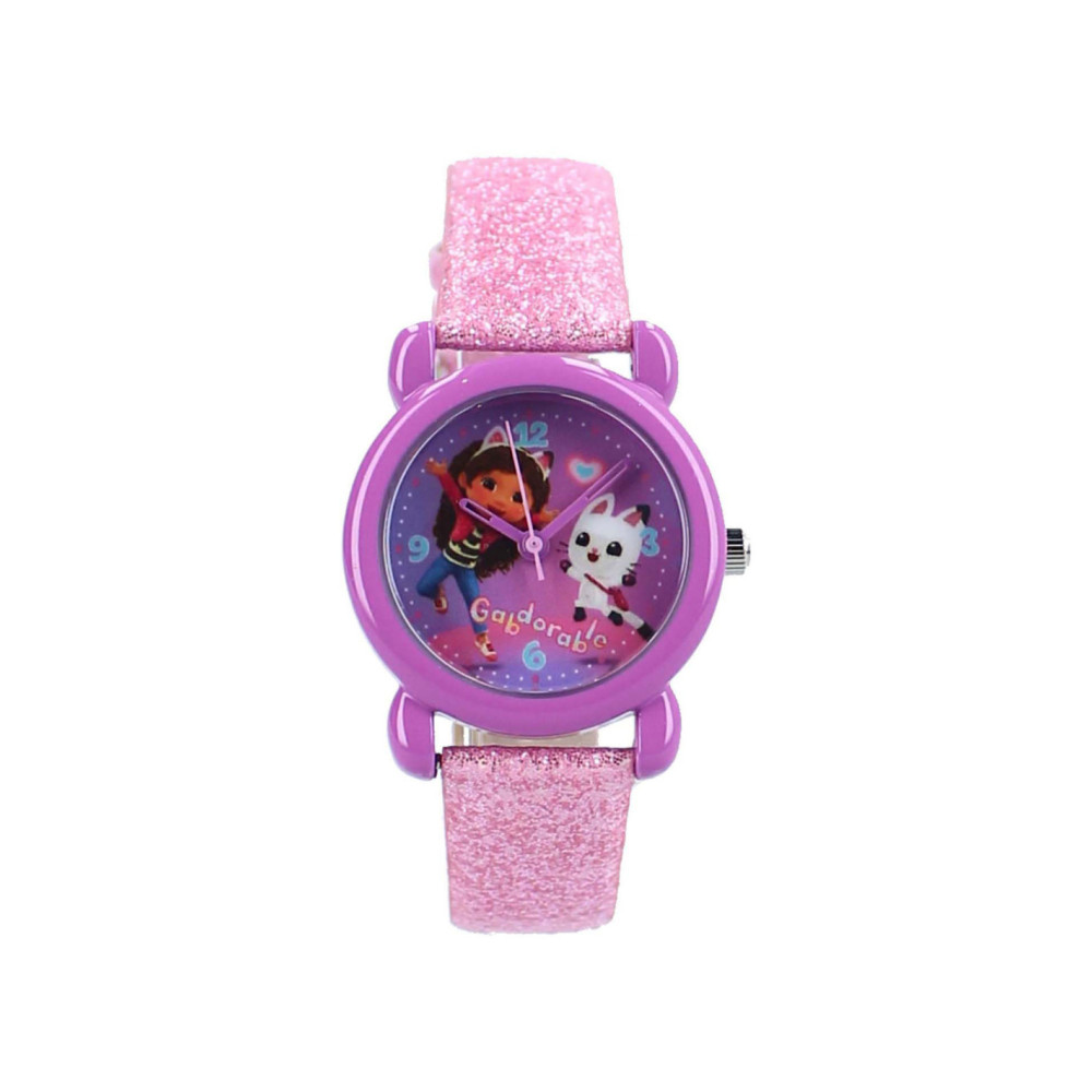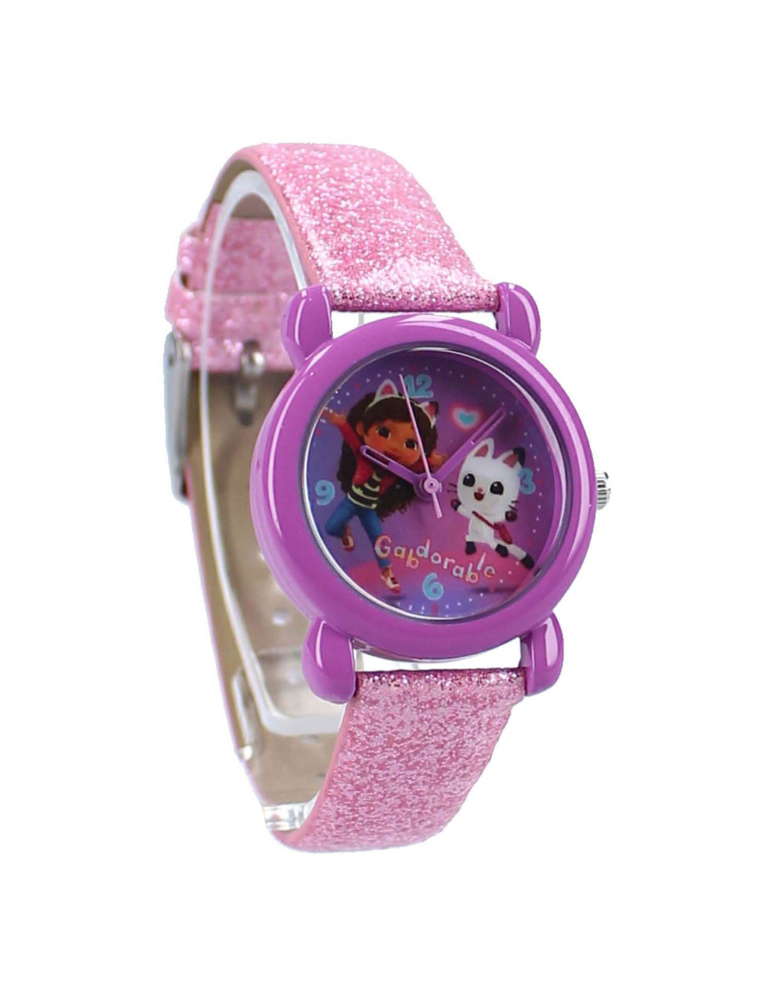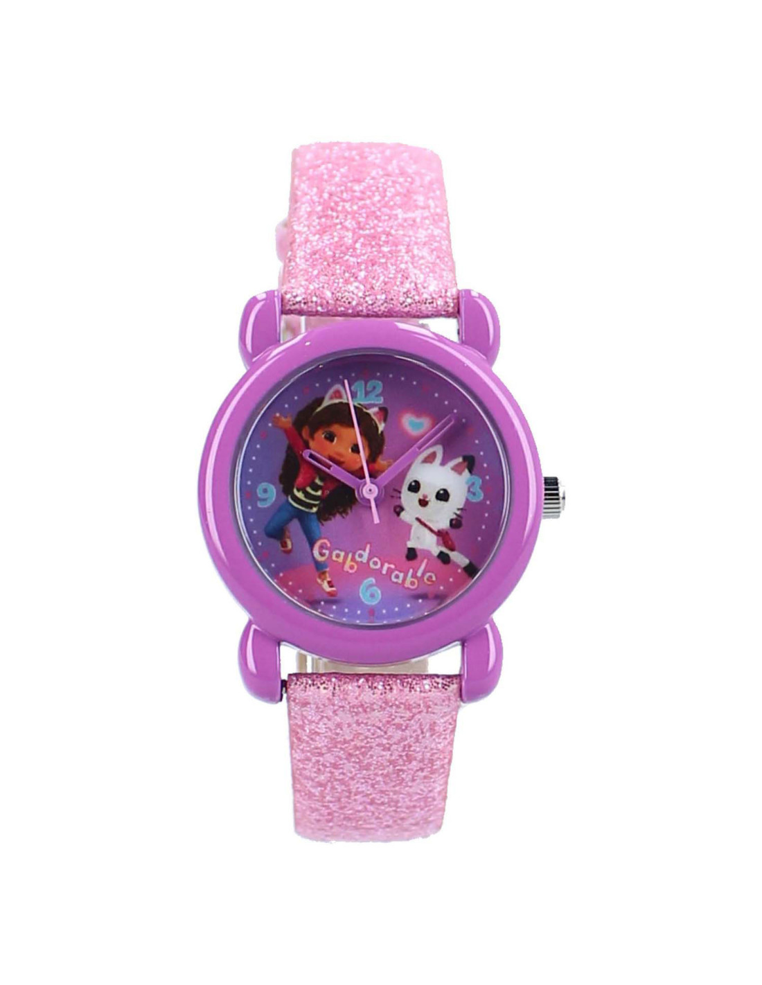 Met dit leuke Gabby's Dollhouse horloge uit de 'Kids Time!' collectie kan ieder kind supersnel de tijd lezen en tegelijkertijd zijn of haar favoriete figuur om de pols dragen. Zo komt een kind nooit meer te laat op school of bij de sportles. Dit paarse horloge is voorzien van een glitter polsband. Het horloge heeft een wijzerplaat met daarop Gabby & Pandy, hoofdpersonages uit de populaire serie, afgebeeld. De grote en kleine wijzers zijn paars van kleur. Voor elke pols is dit horloge op maat te maken, doordat de RVC gespsluiting strakker en losser te maken is. Het horloge is spatwaterdicht en heeft een garantie van 2 jaar. Het Gabby's Dollhouse horloge wordt geleverd in een mooi, op maat gemaakt doosje zodat het horloge niet beschadigd.