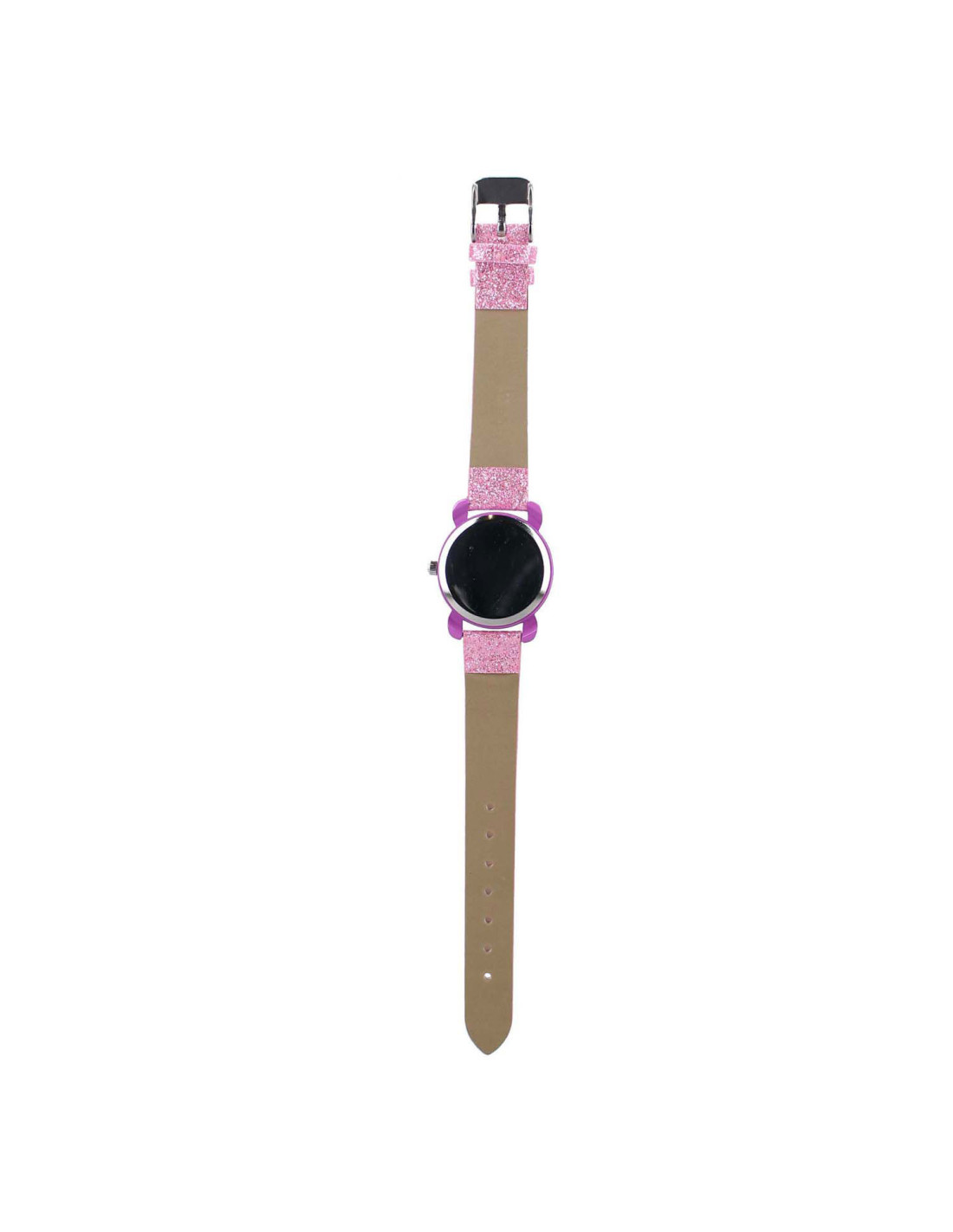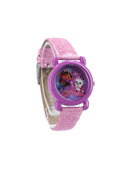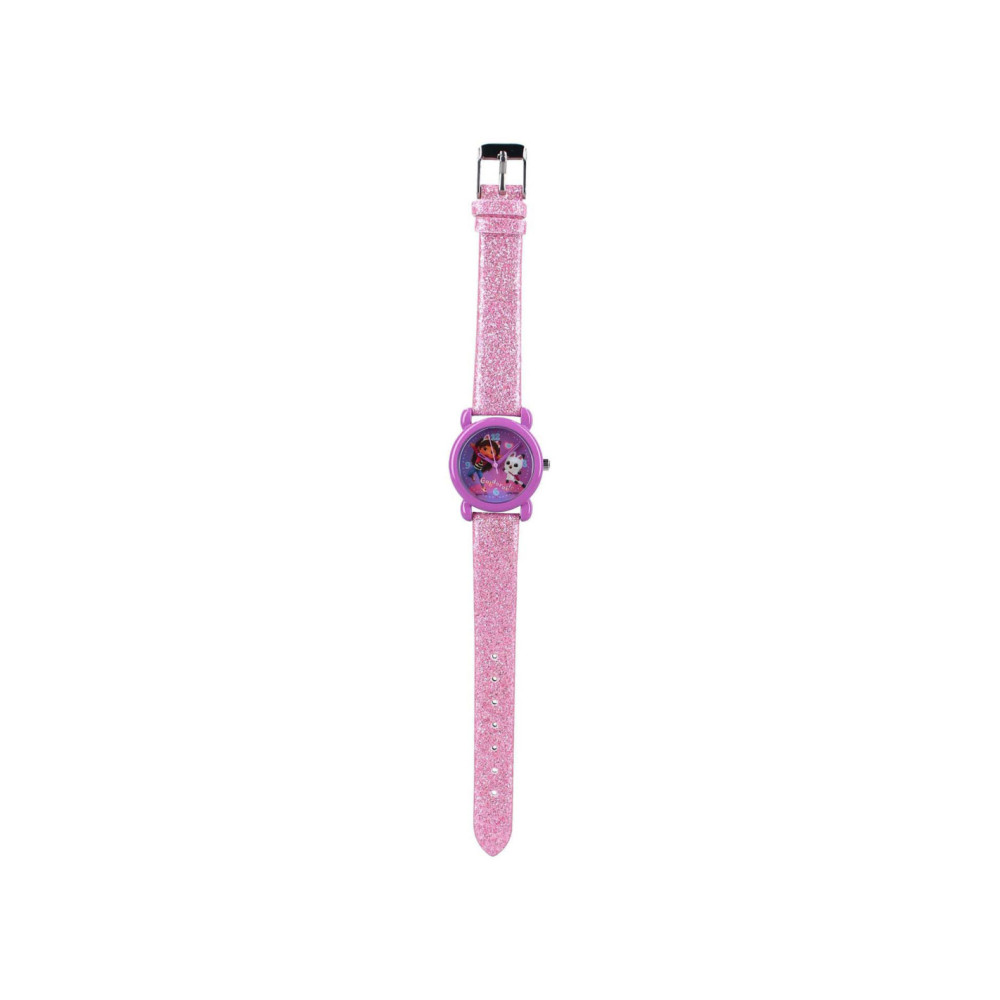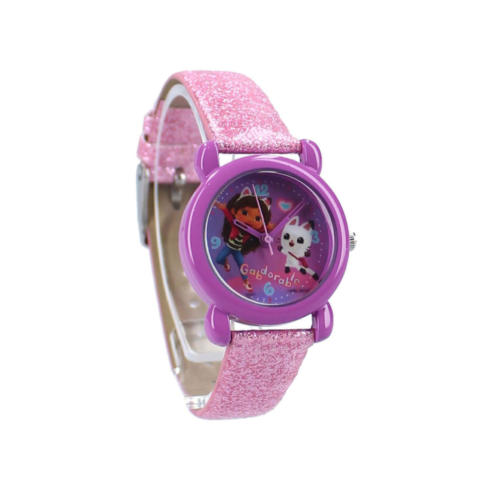 Met dit leuke Gabby's Dollhouse horloge uit de 'Kids Time!' collectie kan ieder kind supersnel de tijd lezen en tegelijkertijd zijn of haar favoriete figuur om de pols dragen. Zo komt een kind nooit meer te laat op school of bij de sportles. Dit paarse horloge is voorzien van een glitter polsband. Het horloge heeft een wijzerplaat met daarop Gabby & Pandy, hoofdpersonages uit de populaire serie, afgebeeld. De grote en kleine wijzers zijn paars van kleur. Voor elke pols is dit horloge op maat te maken, doordat de RVC gespsluiting strakker en losser te maken is. Het horloge is spatwaterdicht en heeft een garantie van 2 jaar. Het Gabby's Dollhouse horloge wordt geleverd in een mooi, op maat gemaakt doosje zodat het horloge niet beschadigd.