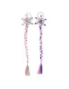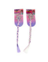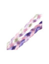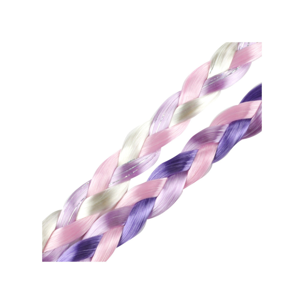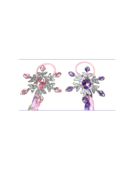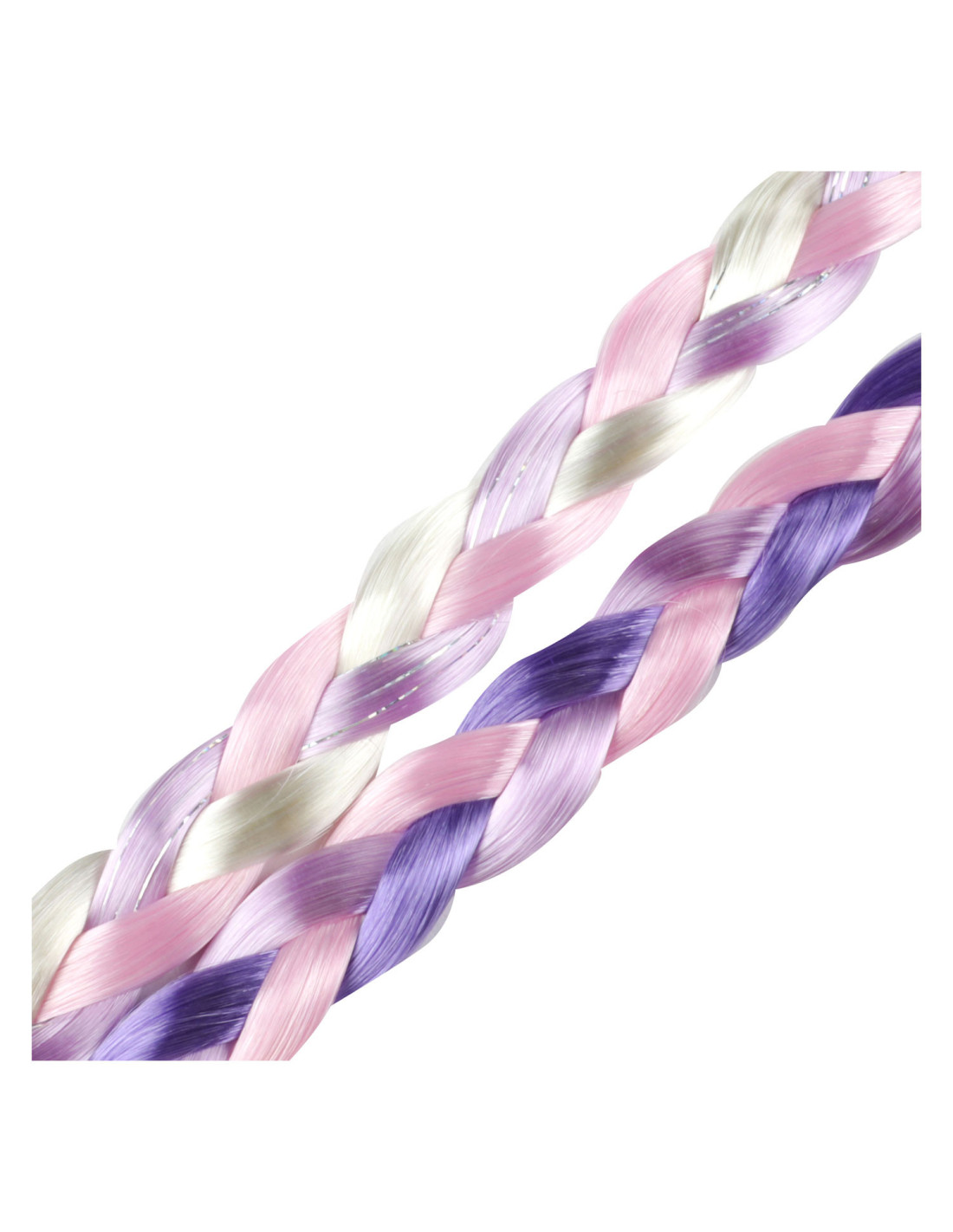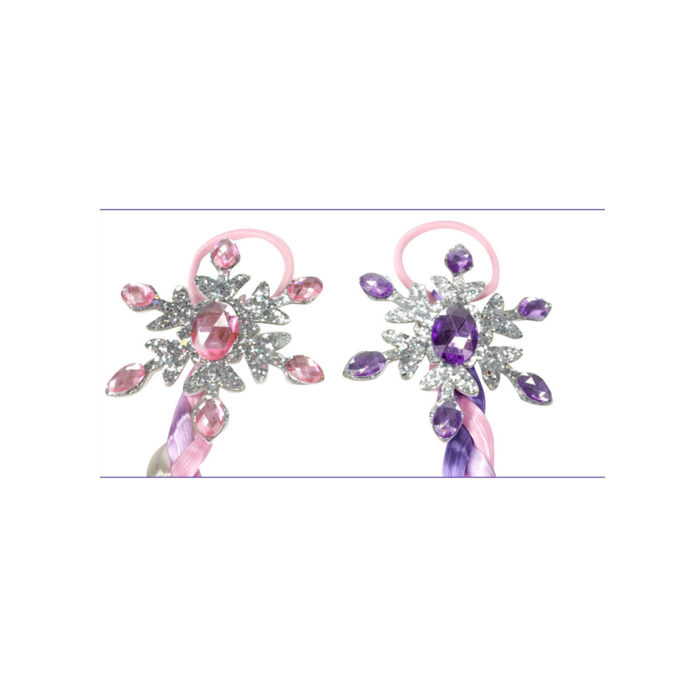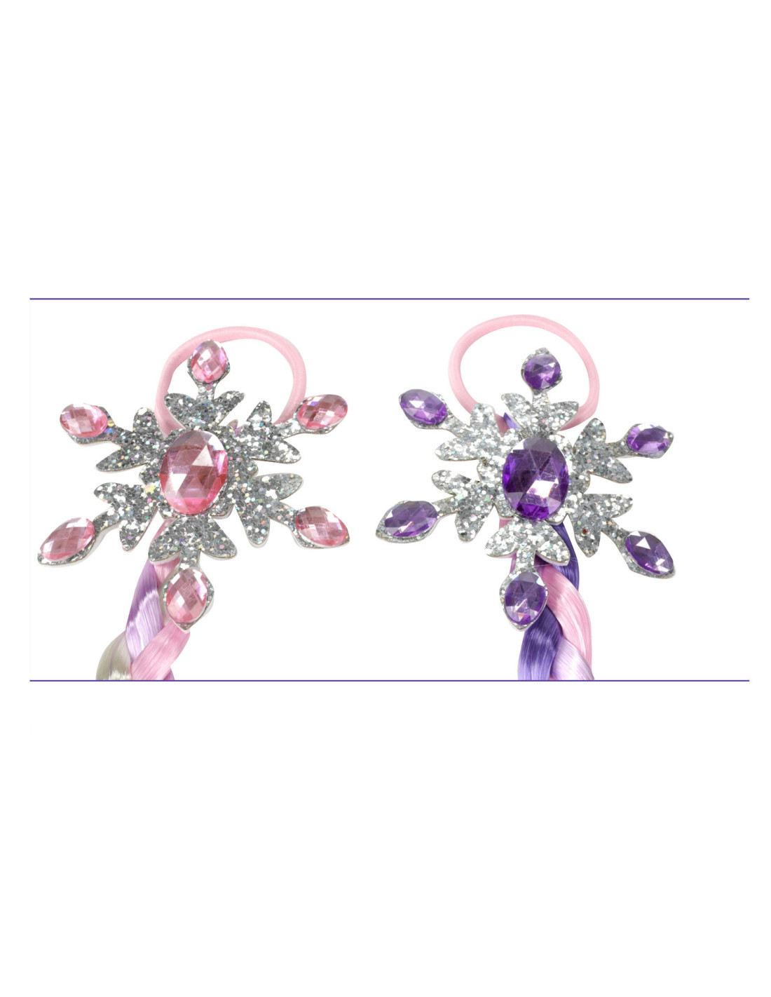 Driekleurige prinsessenvlecht met glinsterend sieraad aan haarelastiek. Verkrijgbaar in roze en paars. Geschikt vanaf 3 jaar.