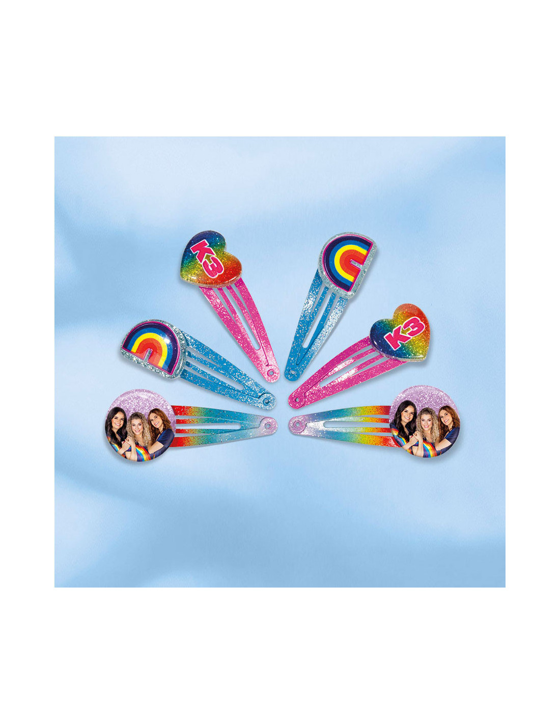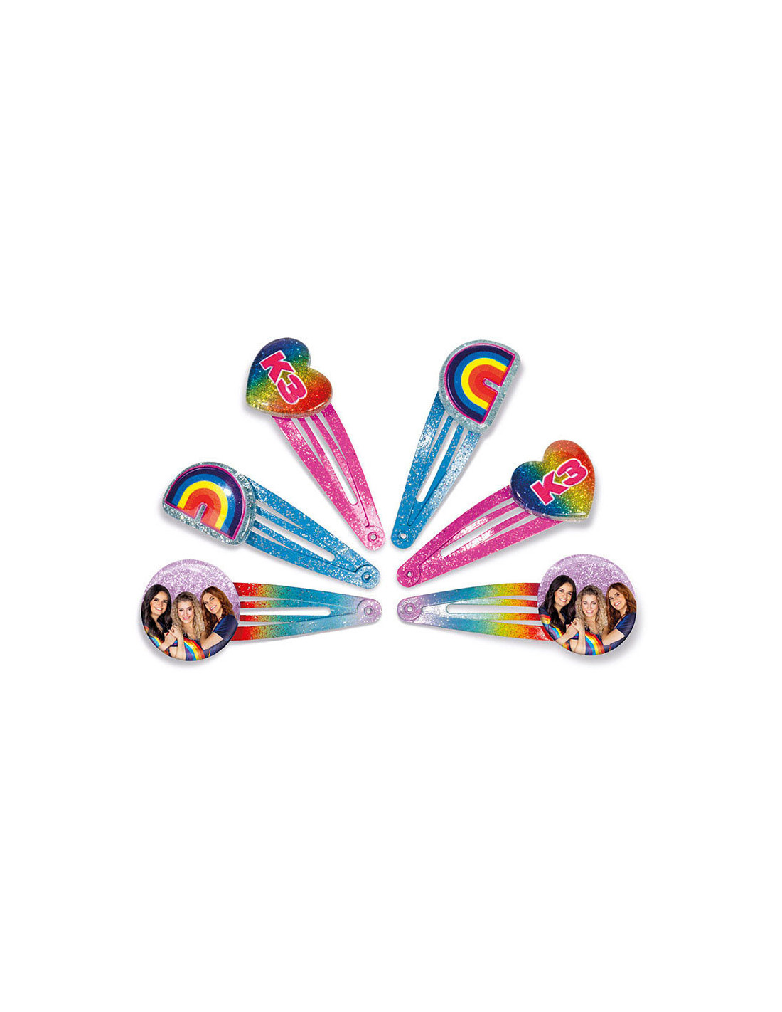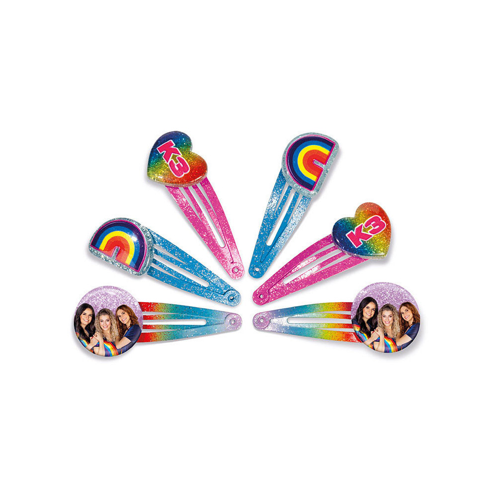 Set van 6 vrolijke K3-haarclips met 3 verschillende emblemen (K3-meiden, hartjes en regenbogen). Met glitters. Geschikt voor kinderen vanaf 3 jaar.