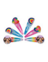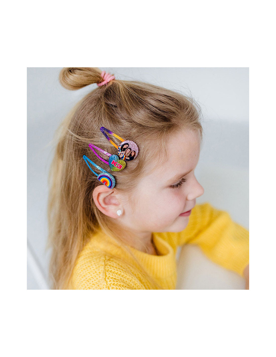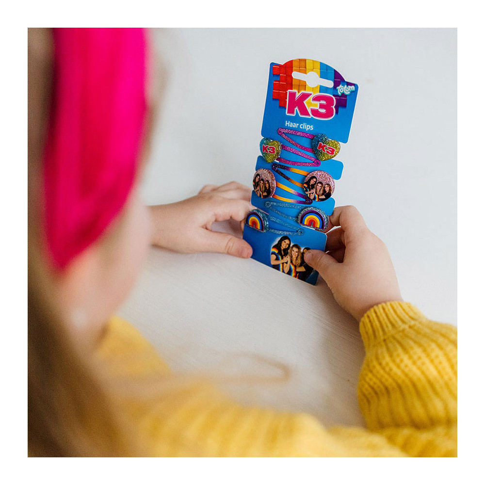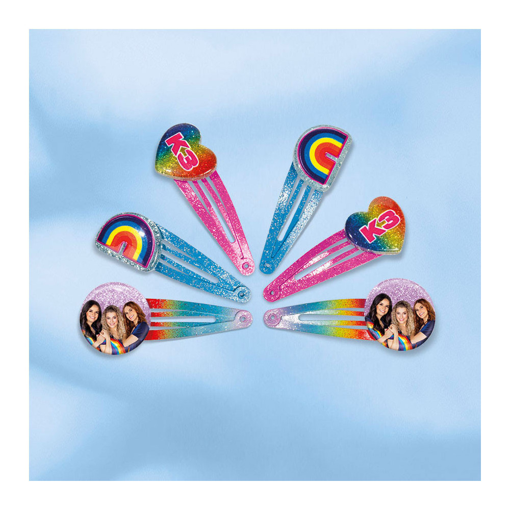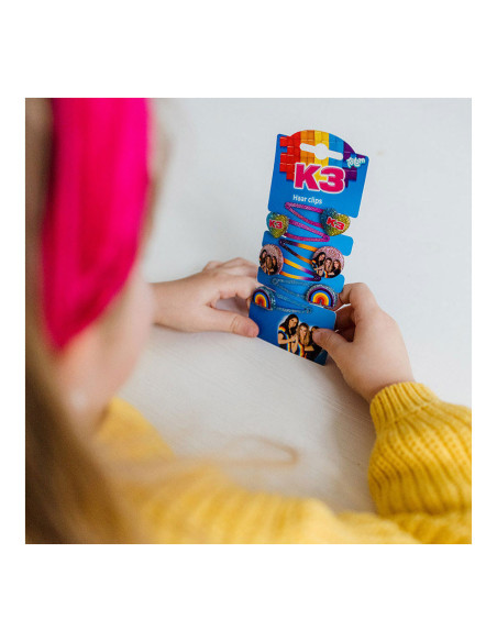 Set van 6 vrolijke K3-haarclips met 3 verschillende emblemen (K3-meiden, hartjes en regenbogen). Met glitters. Geschikt voor kinderen vanaf 3 jaar.