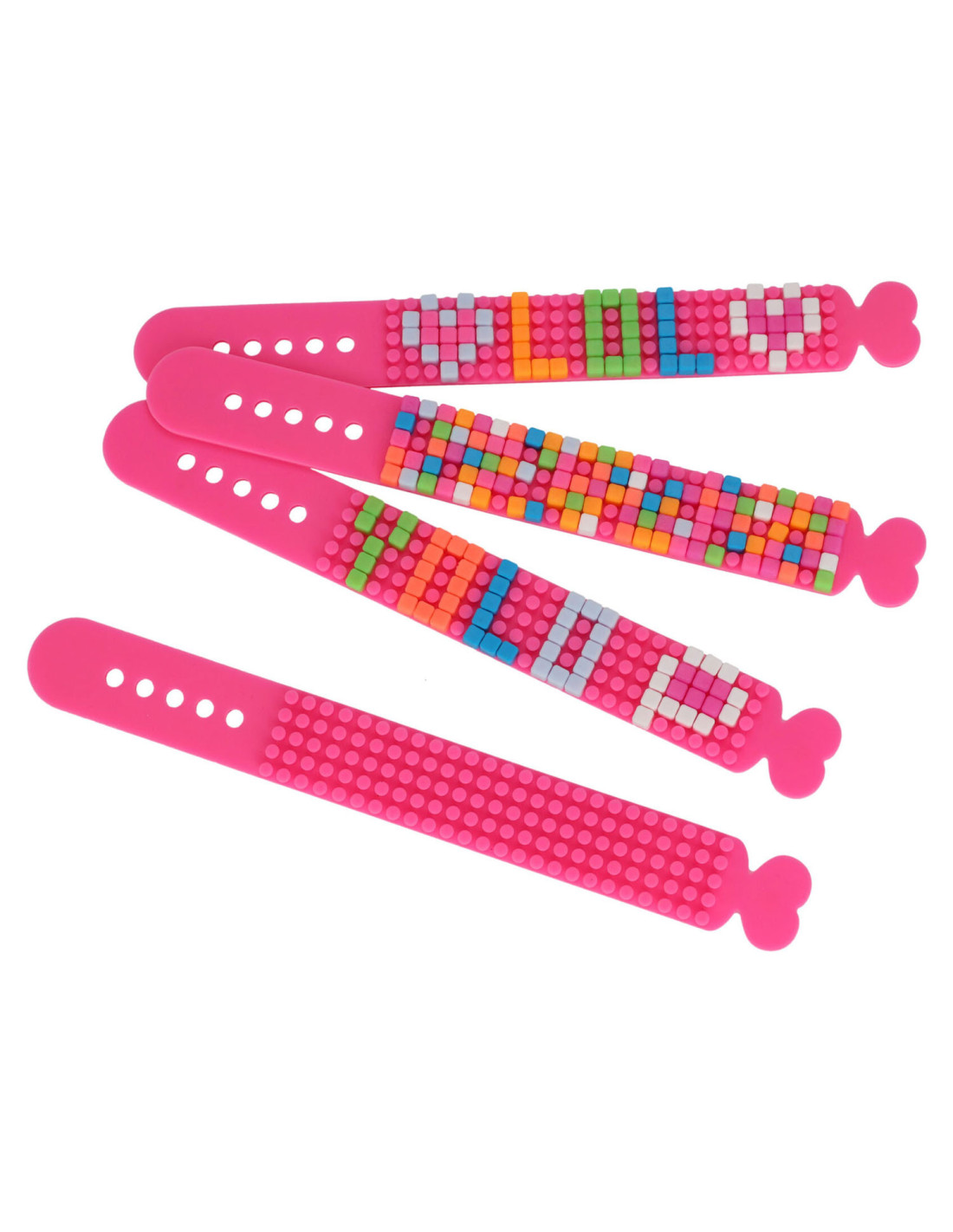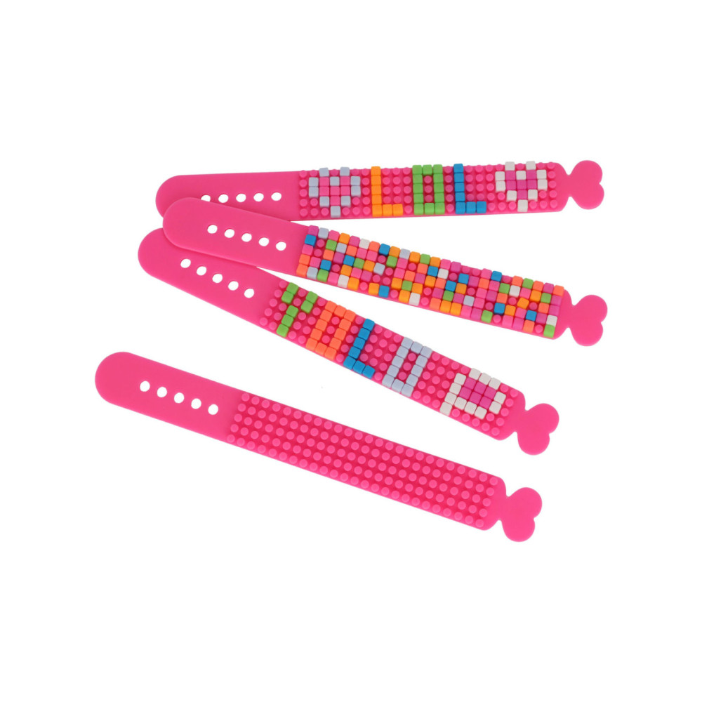 Roze DIY-armband om zelf te versieren met de meegeleverde, gekleurde blokjes. Afmetingen: 22 x 2,5 centimter, in lengte verstelbaar. Adviesleeftijd: 5+