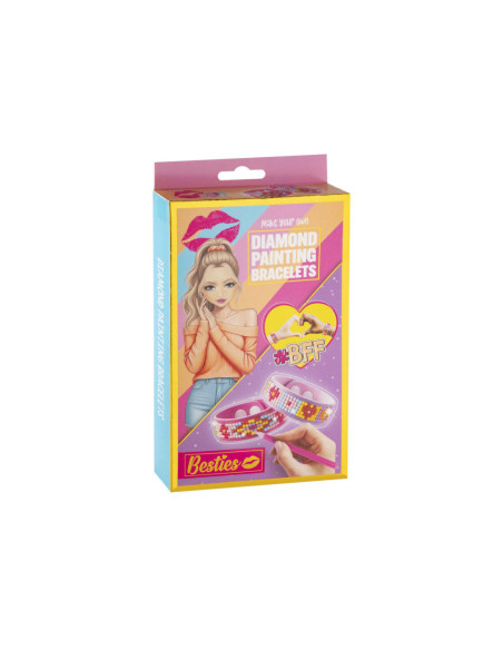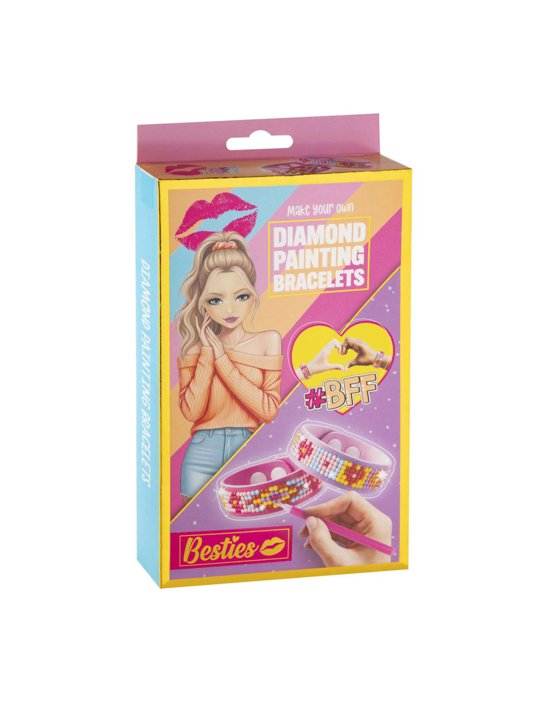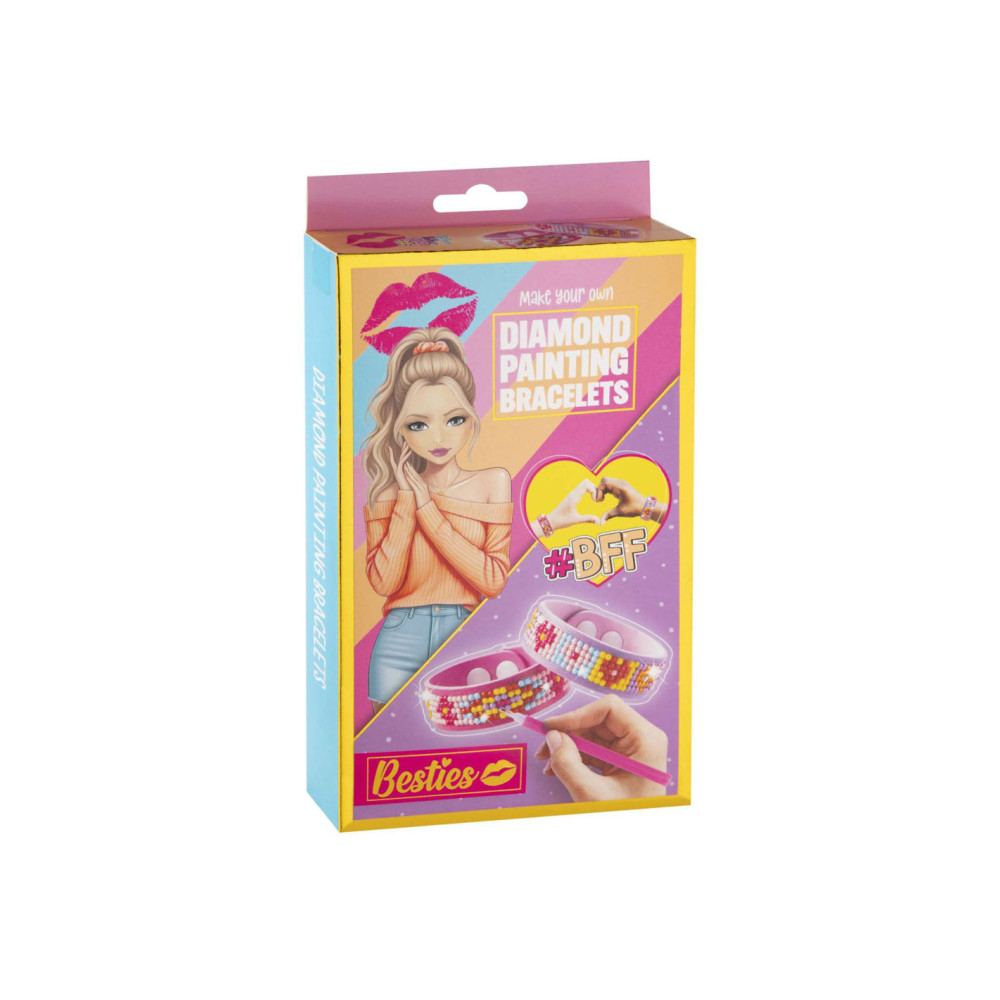 Besties Diamond Painting BFF Armbandjes maken. In de doos zitten 2 vriendschapsarmbandjes, plaksteentjes, een pennetje en een tray. Geschikt vanaf 6 jaar.
