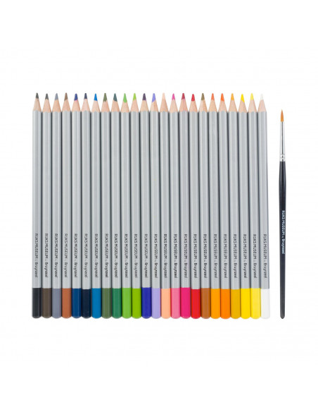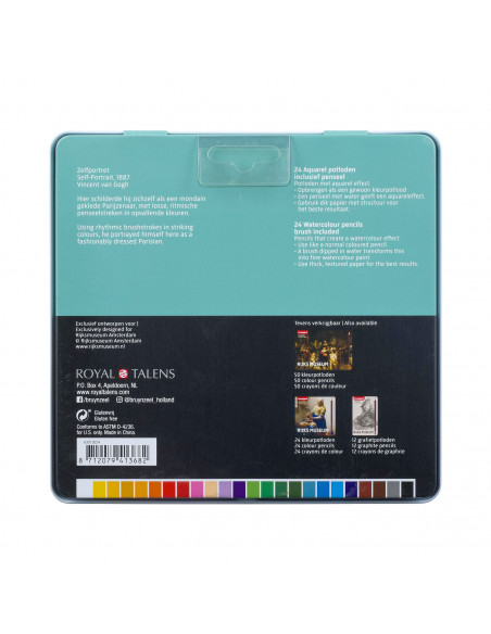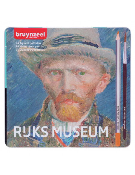 De 24 Bruynzeel Rijksmuseum Aquarelpotloden zijn ideaal om gewoon als kleurpotloden te gebruiken. Maar met het bijgeleverde penseel en een beetje water maak jij mooie aquarelschilderijen! De potloden hebben een sterke kleurkern en hoogwaardige kleurpigmenten. Door de goede kleurafgifte hoef je niet hard op het potlood te drukken. Ook zeer geschikt voor handlettering en bullet journaling. Verpakt in een mooie, stevige bewaarblik met een opdruk van een zelfportret van de beroemde schilder Vincent van Gogh.