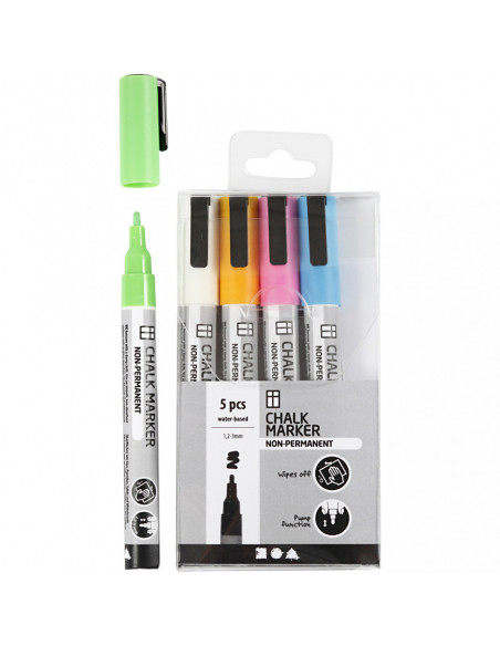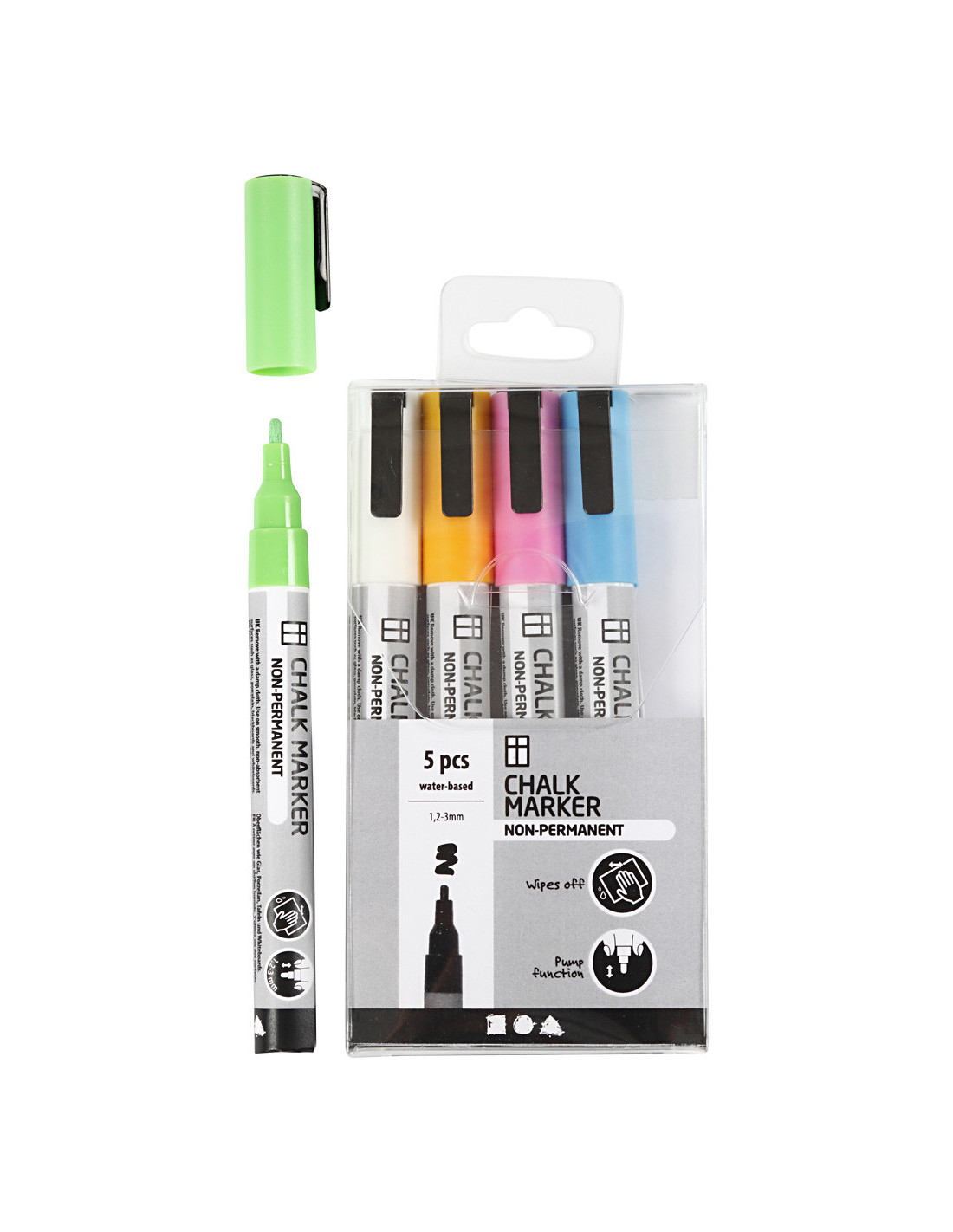 Voor gebruik dient de stift 20 seconden goed geschud te worden. Door de stift een beetje in te duwen bij de punt tegen het oppervlak, komt er vloeibaar krijt uit en kun je tekenen.