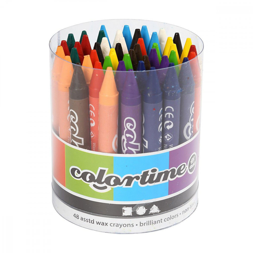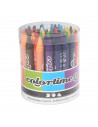 Goede kwaliteit Colortime kleurkrijt - bijzonder geschikt voor kleine kinderen. Geleverd in een kunststof emmer met 12 verschillende kleuren, van elk 4 stuks. Afmeting: dikte 11 mm, lengte 10 cm.
