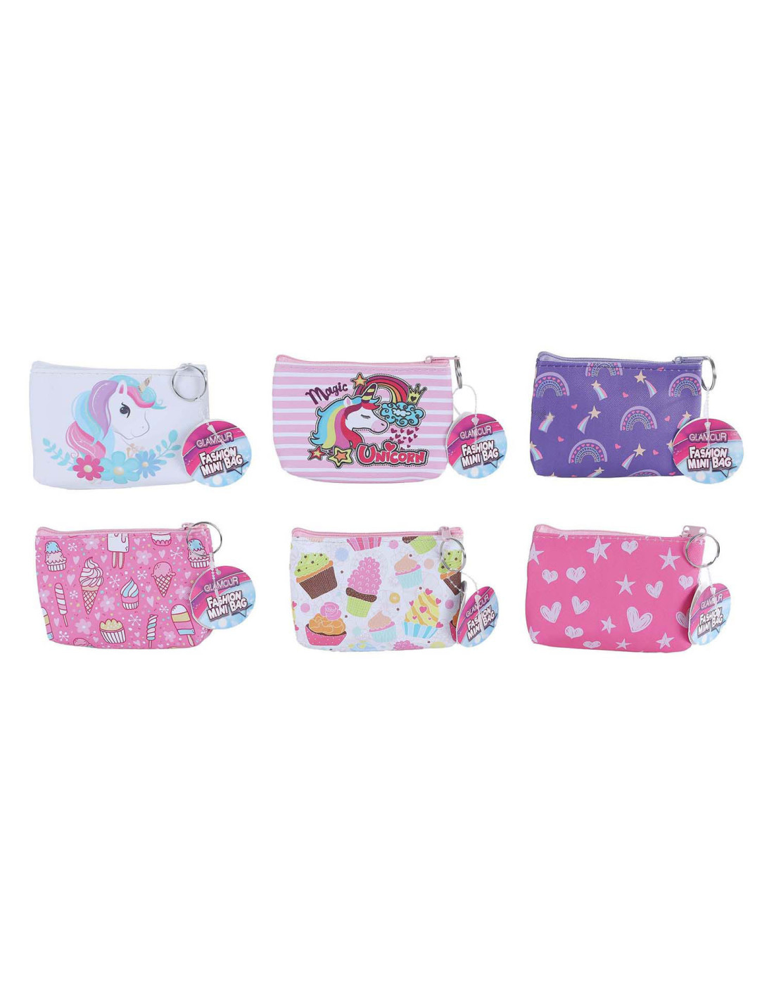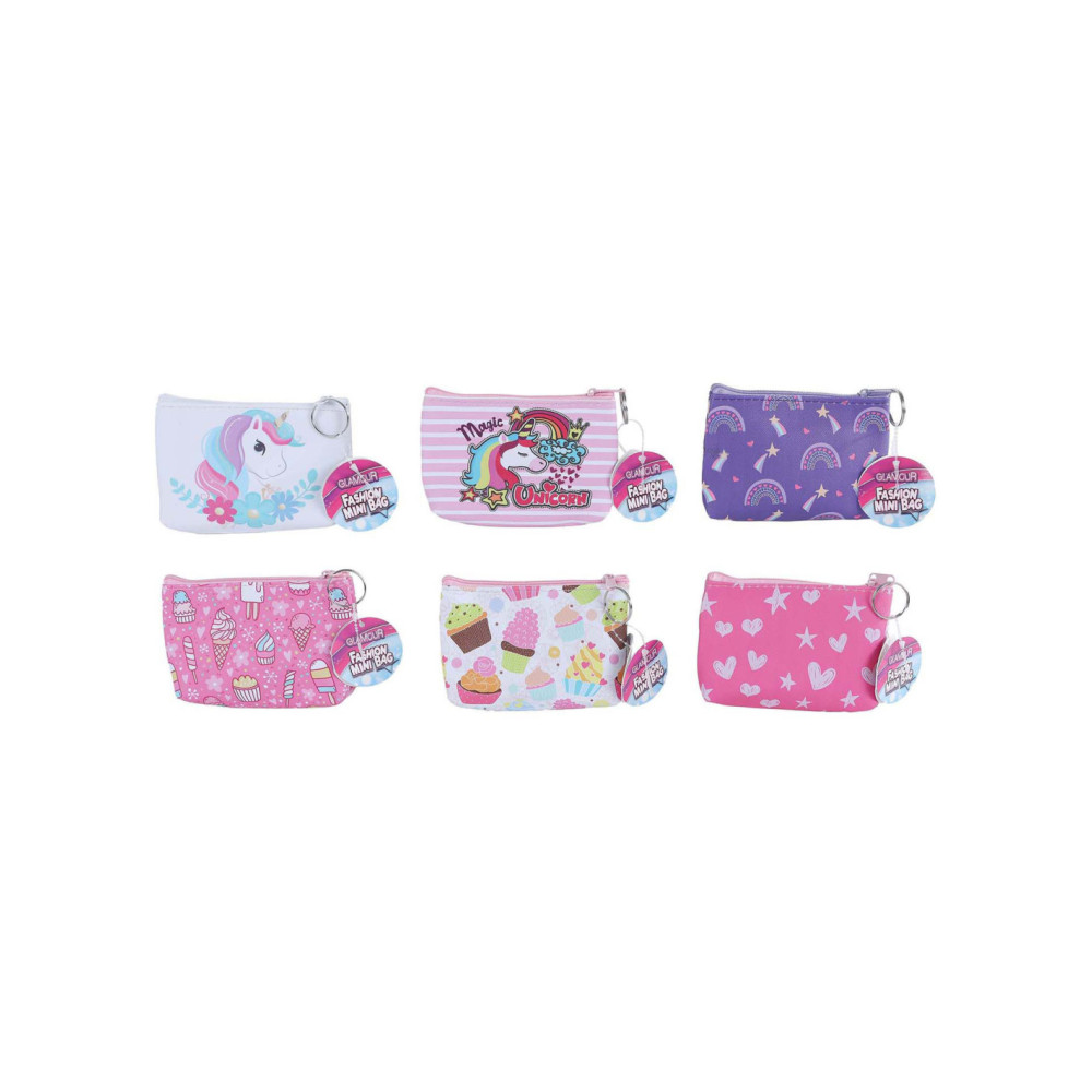 Glamour portemonneetasje in verschillende printjes met rits en sleutelhanger.