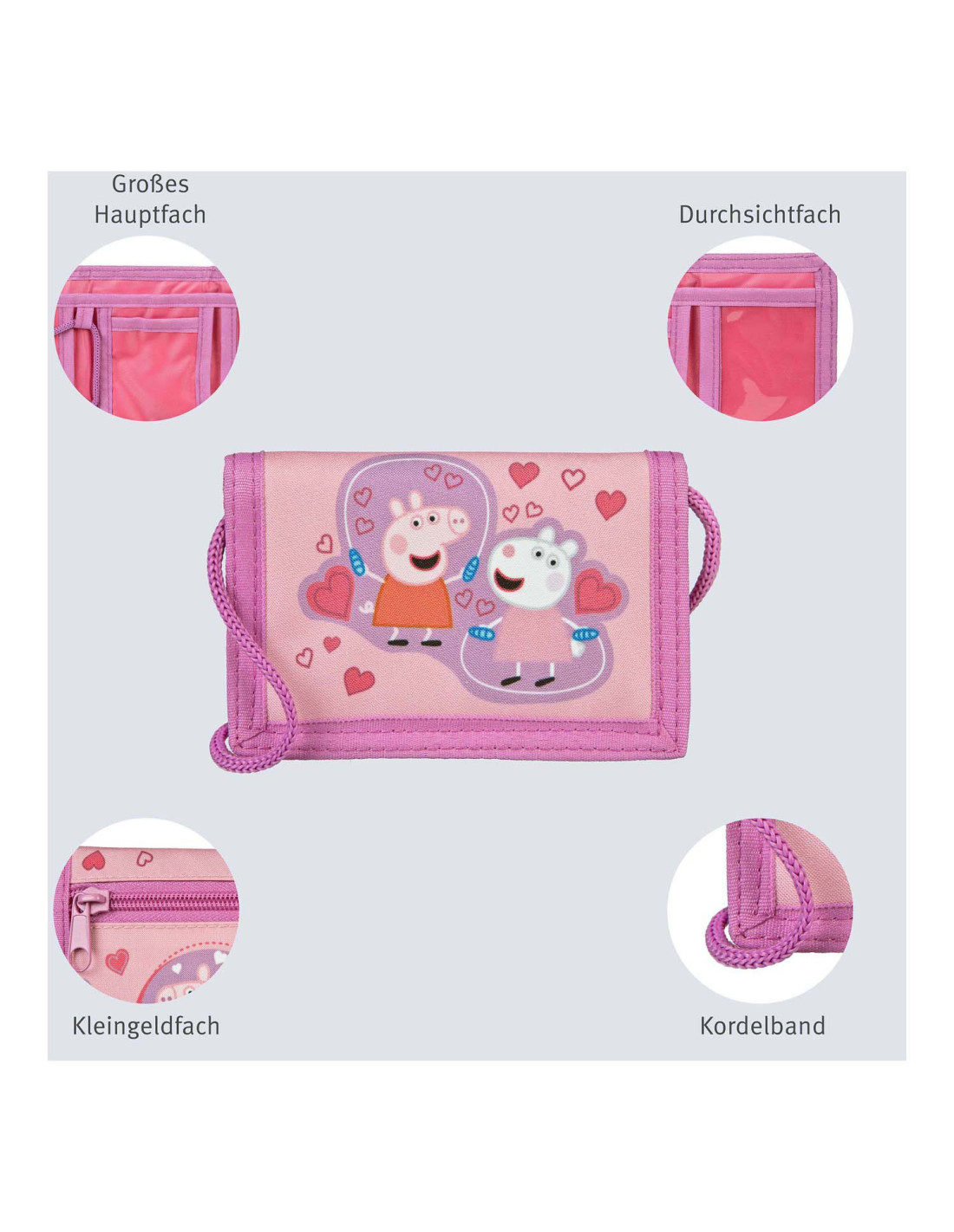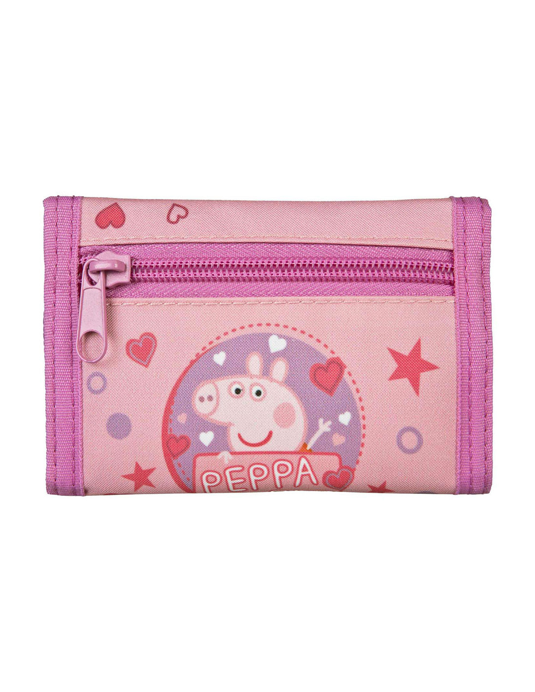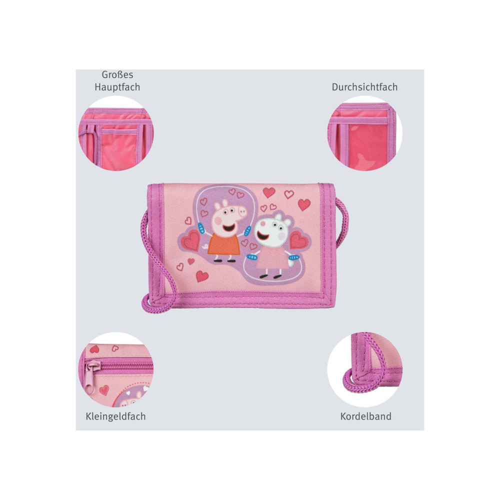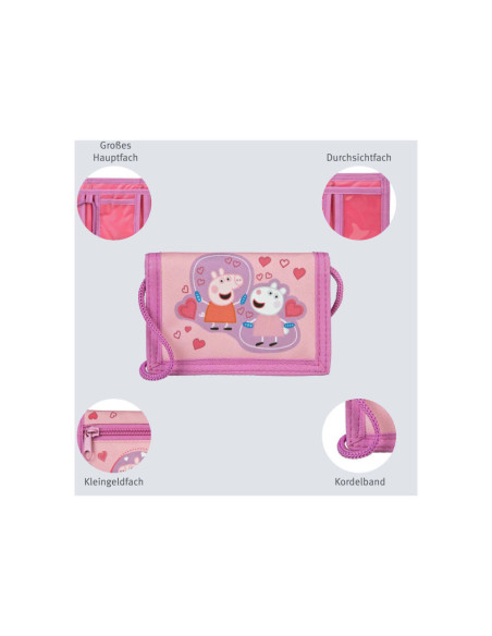 Peppa Pig Portemonnee met klittenbandsluiting, muntvak met rits en nekkoord. Afmetingen: 13 x 9 x 2 centimeter.