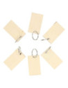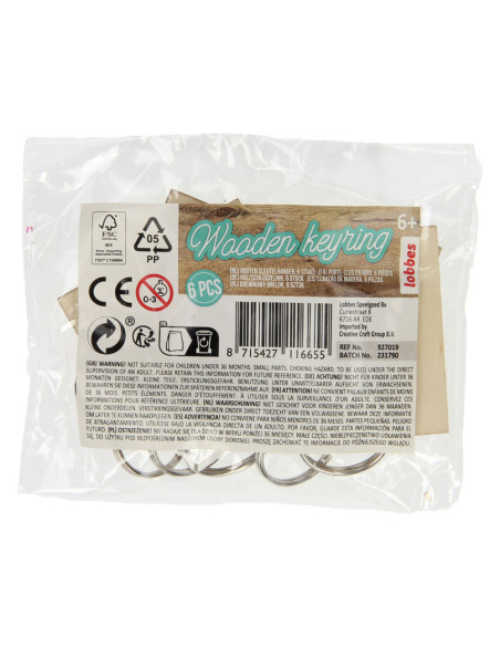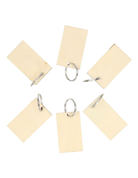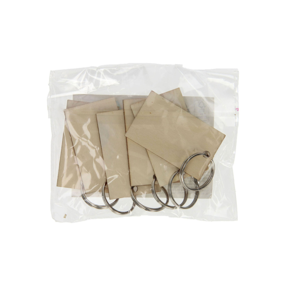 Set van 6 houten sleutelhangers om zelf te versieren. Elke sleutelhanger is 5 x 3 centimeter groot en heeft een metalen sleutelring. Geschikt vanaf 3 jaar.