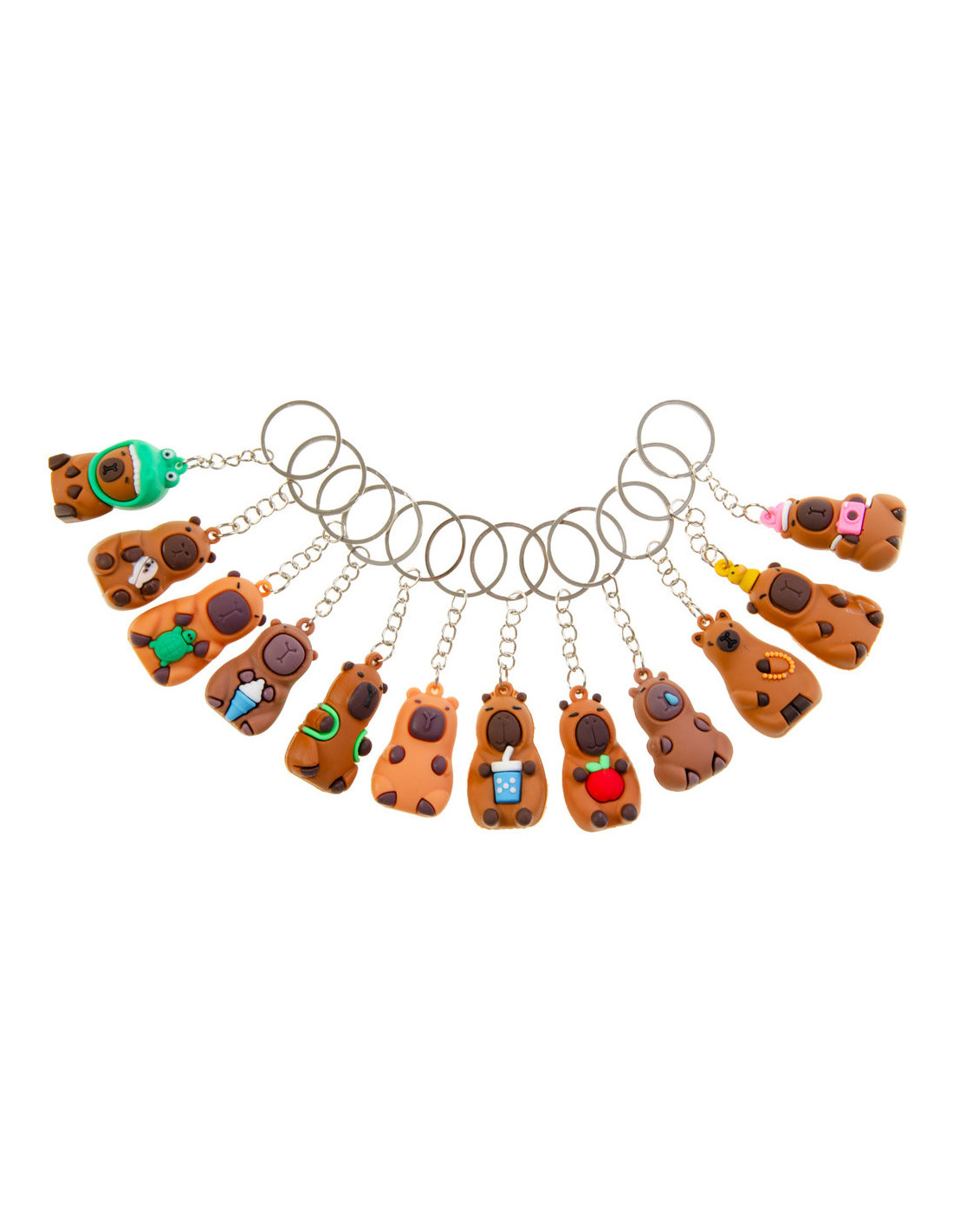 Grappige sleutelhanger in de vorm van een capibara met een schattige uitstraling. De capibara is gemaakt van zacht rubberachtig materiaal en heeft een speels ontwerp met verschillende details, zoals een appel of een beker in zijn pootjes. Door het soepele materiaal voelt de hanger prettig aan en blijft hij mooi, ook bij dagelijks gebruik. De stevige metalen ketting zorgt ervoor dat de capibara goed vastzit aan een sleutelbos, tas of rugzak. Deze sleutelhanger is een leuk klein cadeautje of traktatie en past perfect bij iedereen die houdt van vrolijke accessoires met een unieke look. Door het vrolijke ontwerp is het ook een leuk item om cadeau te doen of als klein extraatje bij een verrassing te voegen. Verschillende uitvoeringen/kleuren worden door elkaar geleverd.