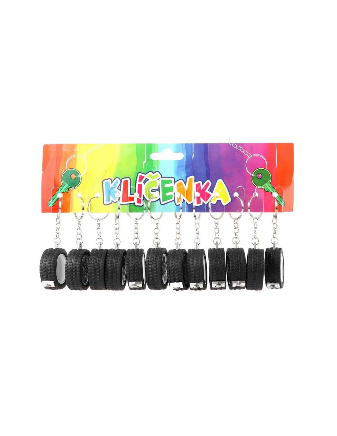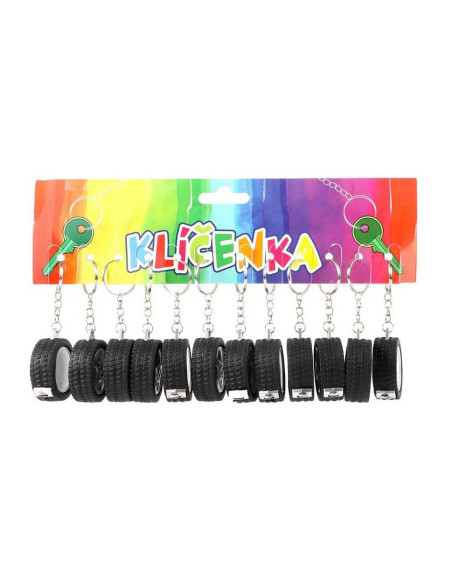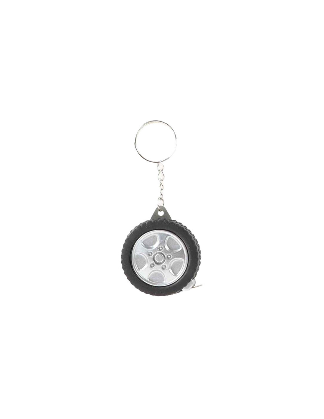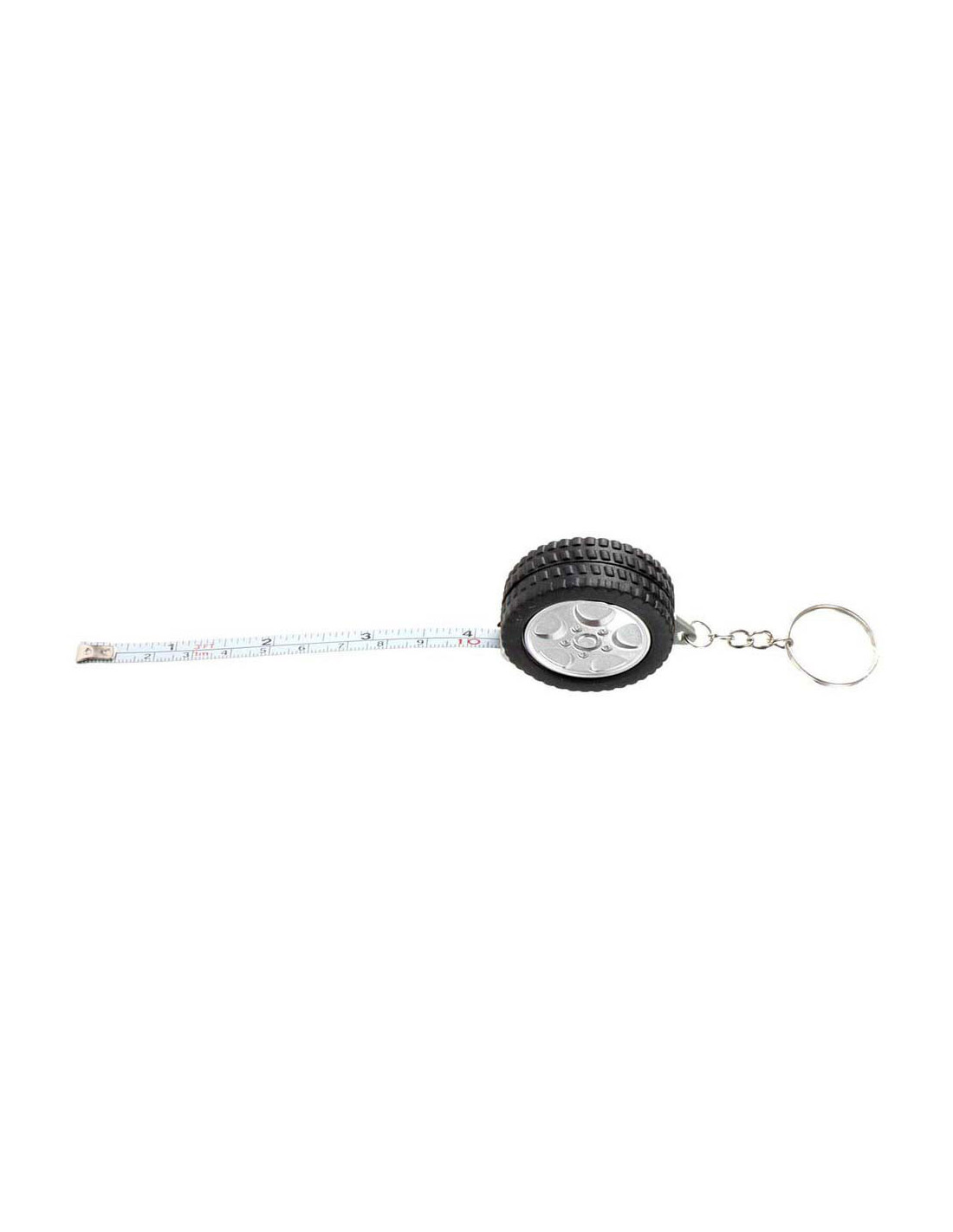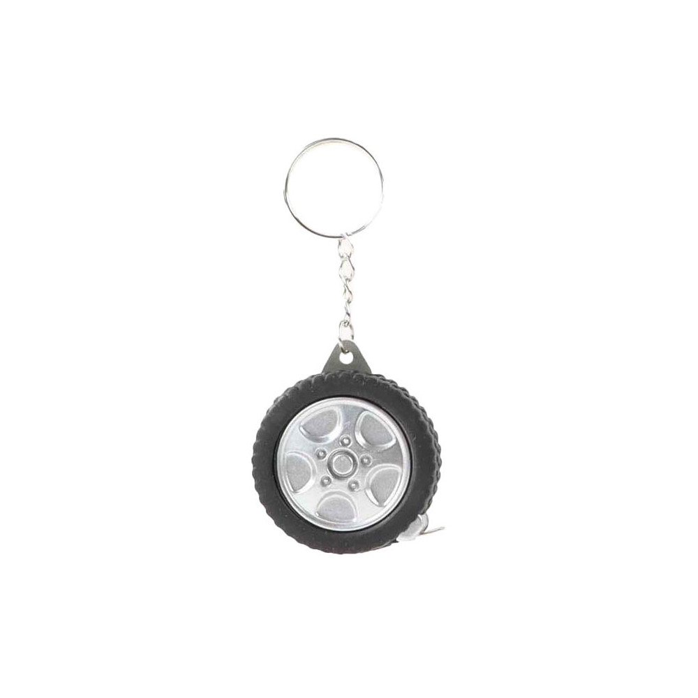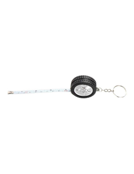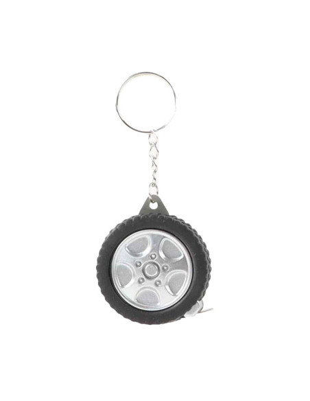 Sleutelhanger in de vorm van een autoband, met daarin een meetlint van 1 meter lang. Afmetingen: 4,5 cm.