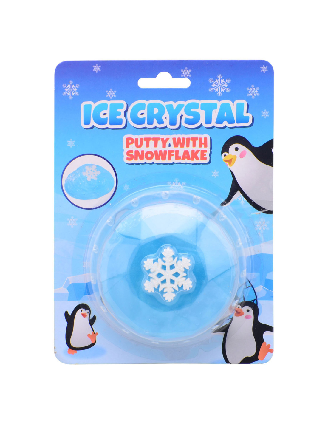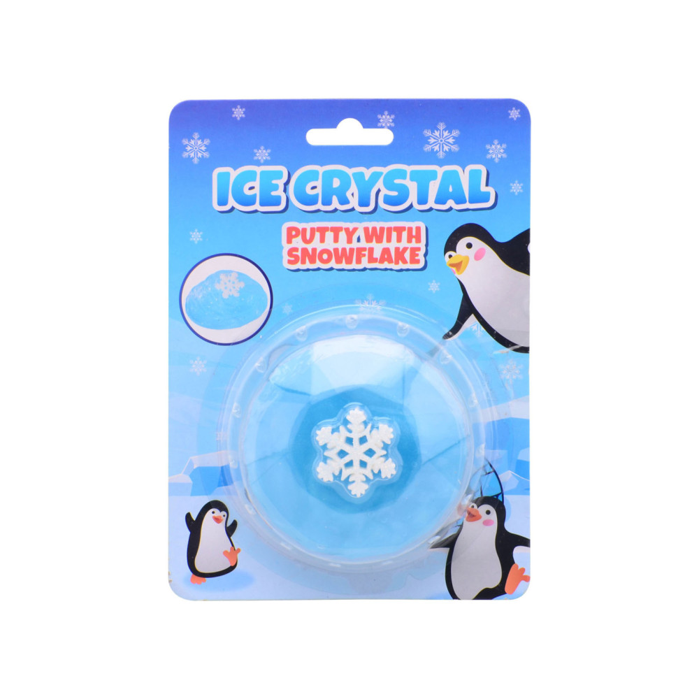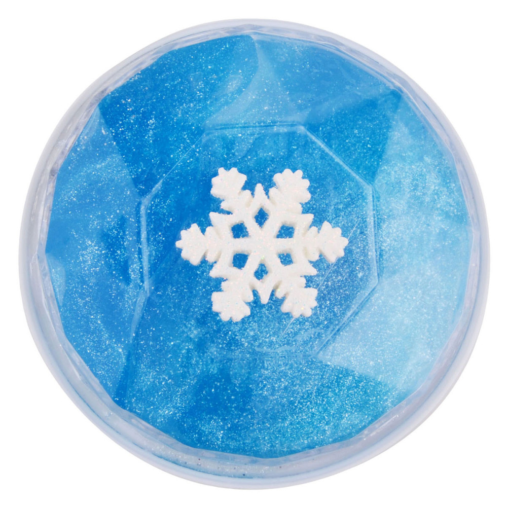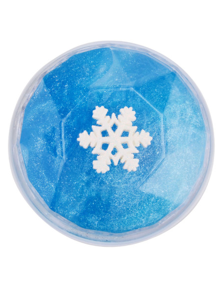 Blauwe, glinterende ijsputty met een sneeuwvlok/ijskristal vanbinnen. Geschikt vanaf 3 jaar.
