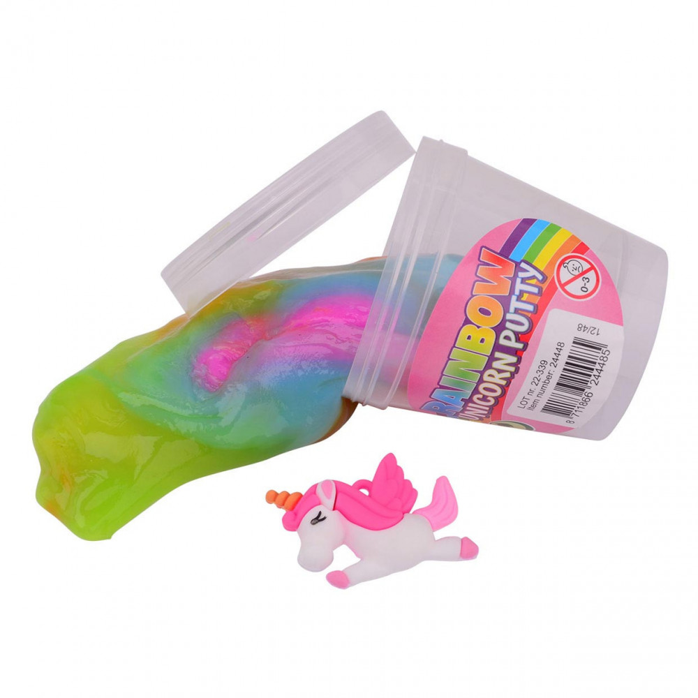 Regenboog putty met een mini speelgoed eenhoorn erin.