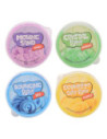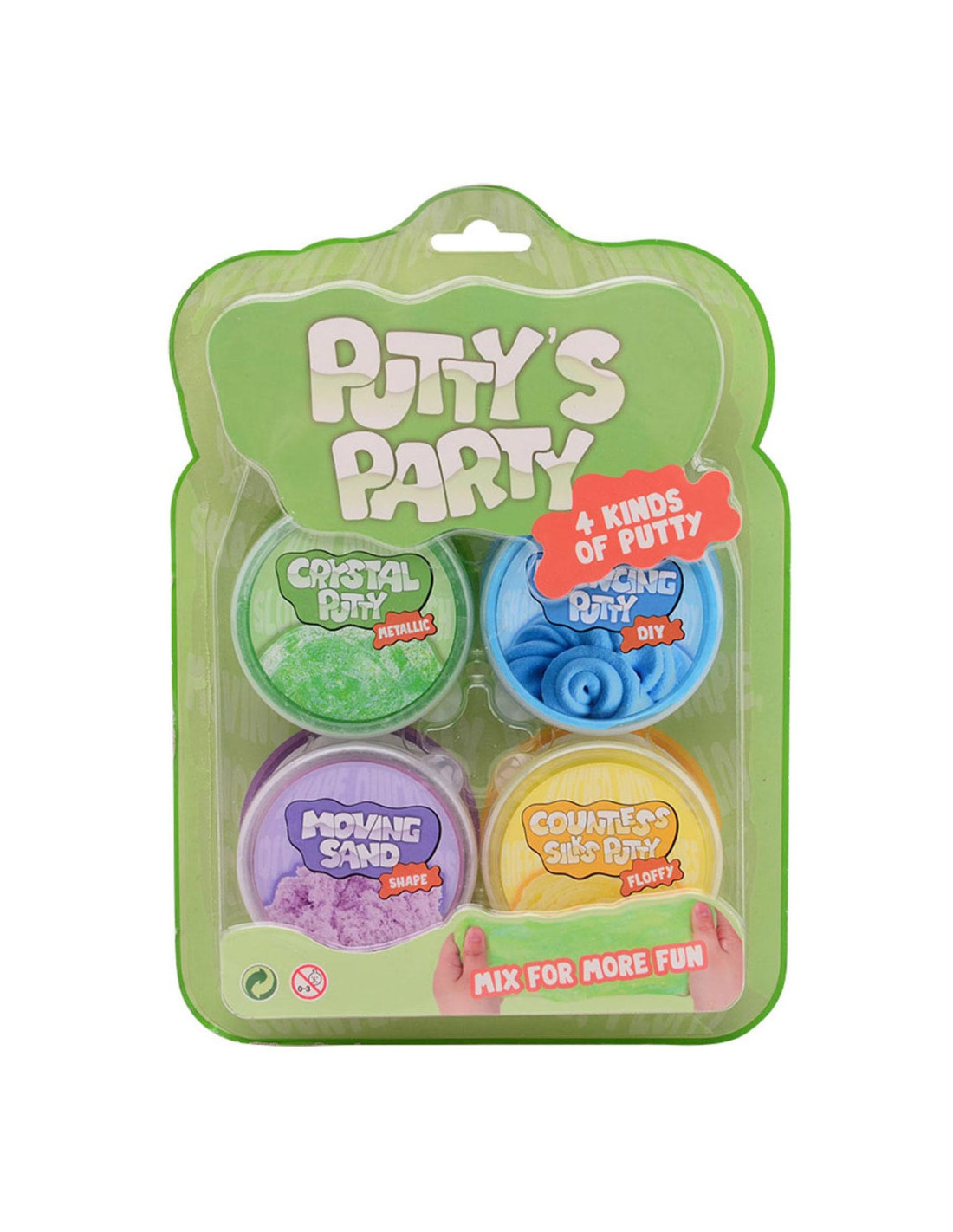 Set van 4 kleine potjes putty in verschillende varianten en kleuren. Inhoud: paars zand, groen kristalputty, blauw stuiterputty en geel zijdeputty. Niet geschikt voor kinderen onder de 3 jaar oud.