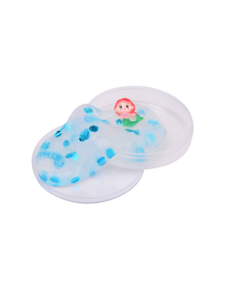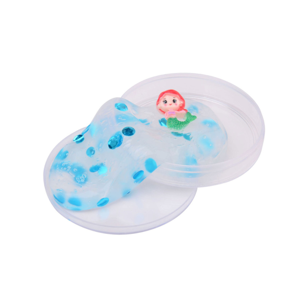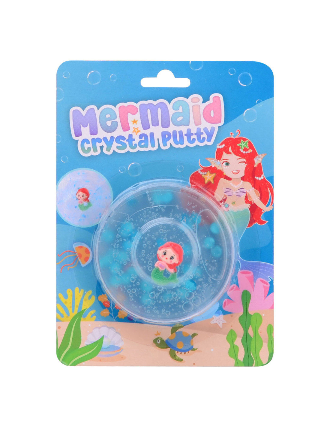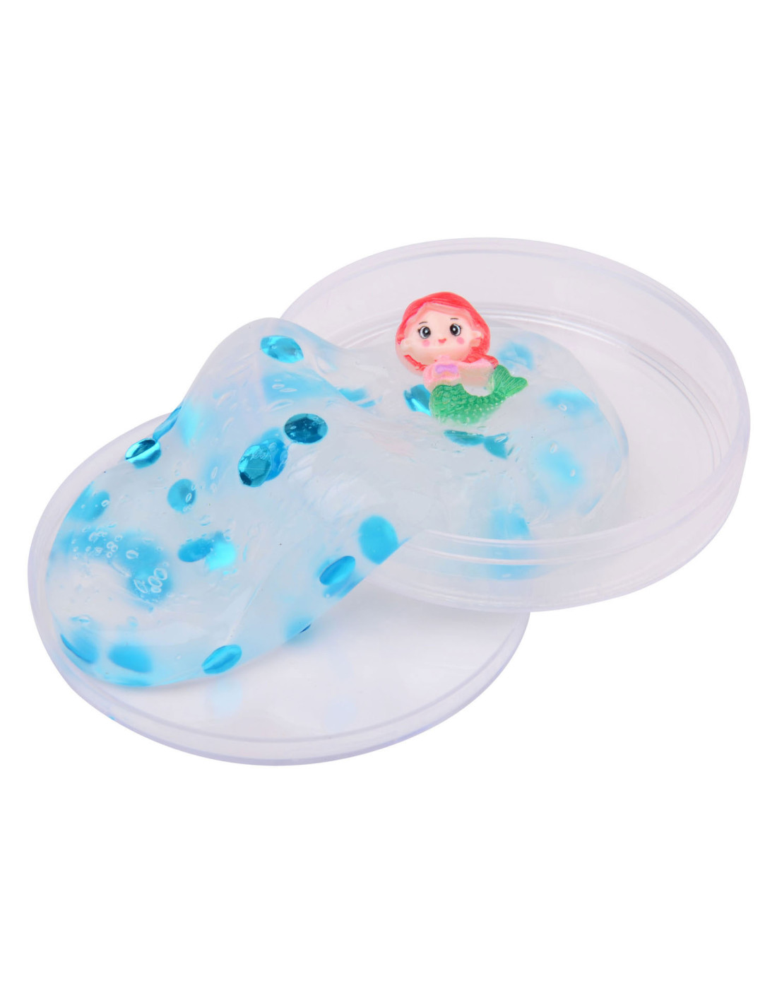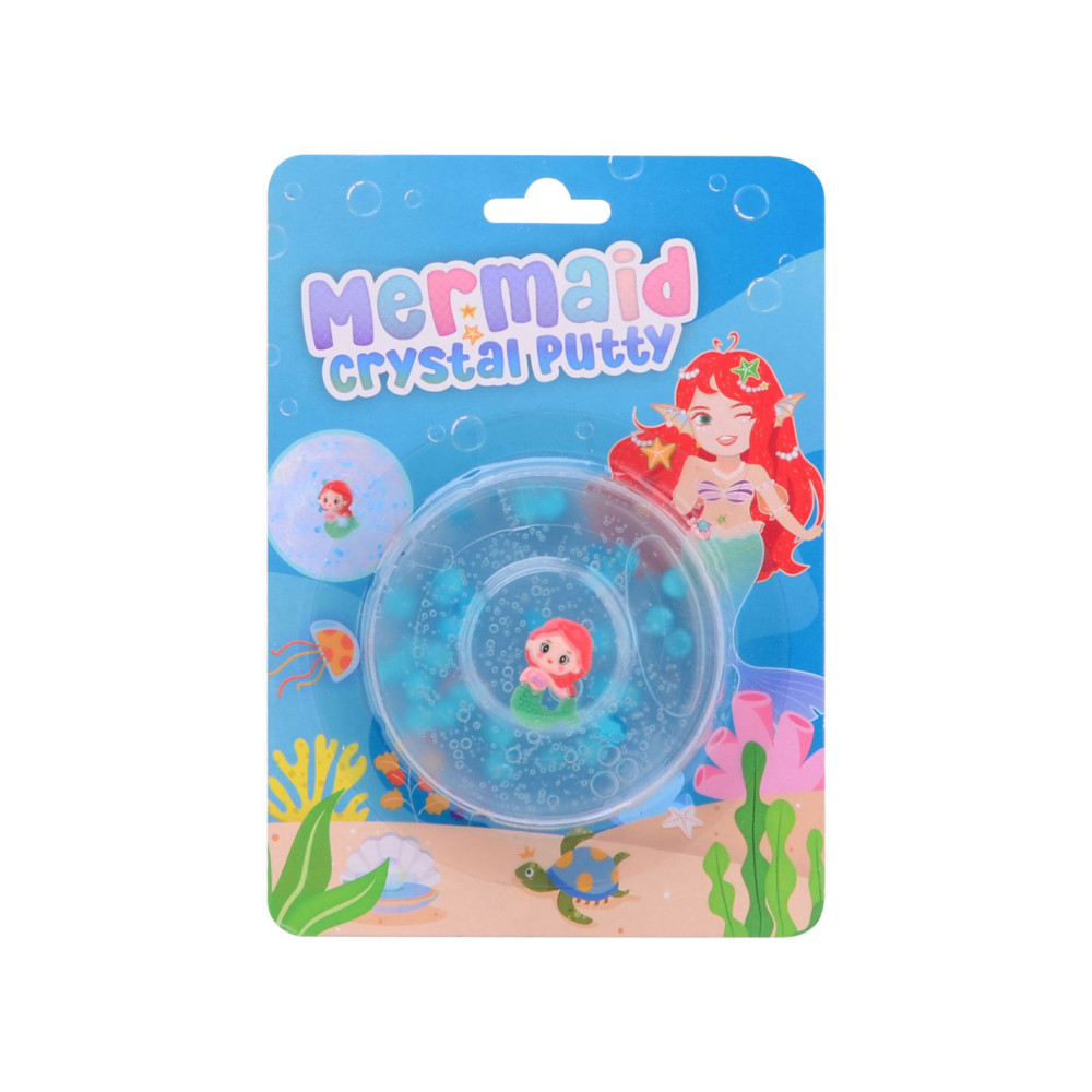 Zeemeermin kristalputty met blauwe glitters en een mini zeemeermin vanbinnen. Heerlijk om door je handen te laten gaan, het te stretchen of in te knijpen. Geschikt voor kinderen vanaf 3 jaar.