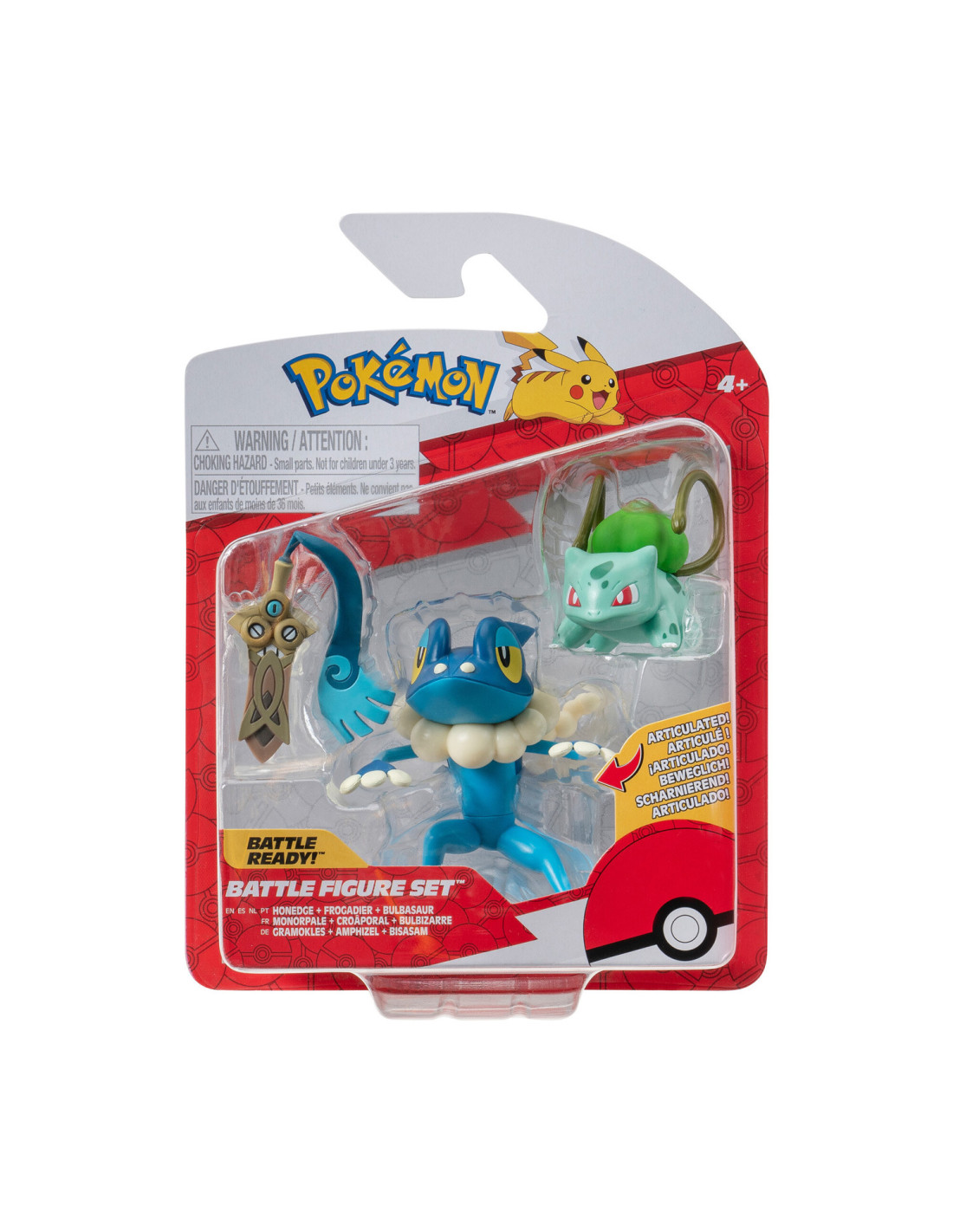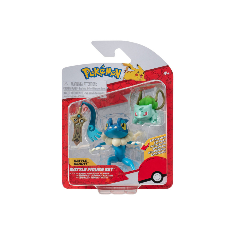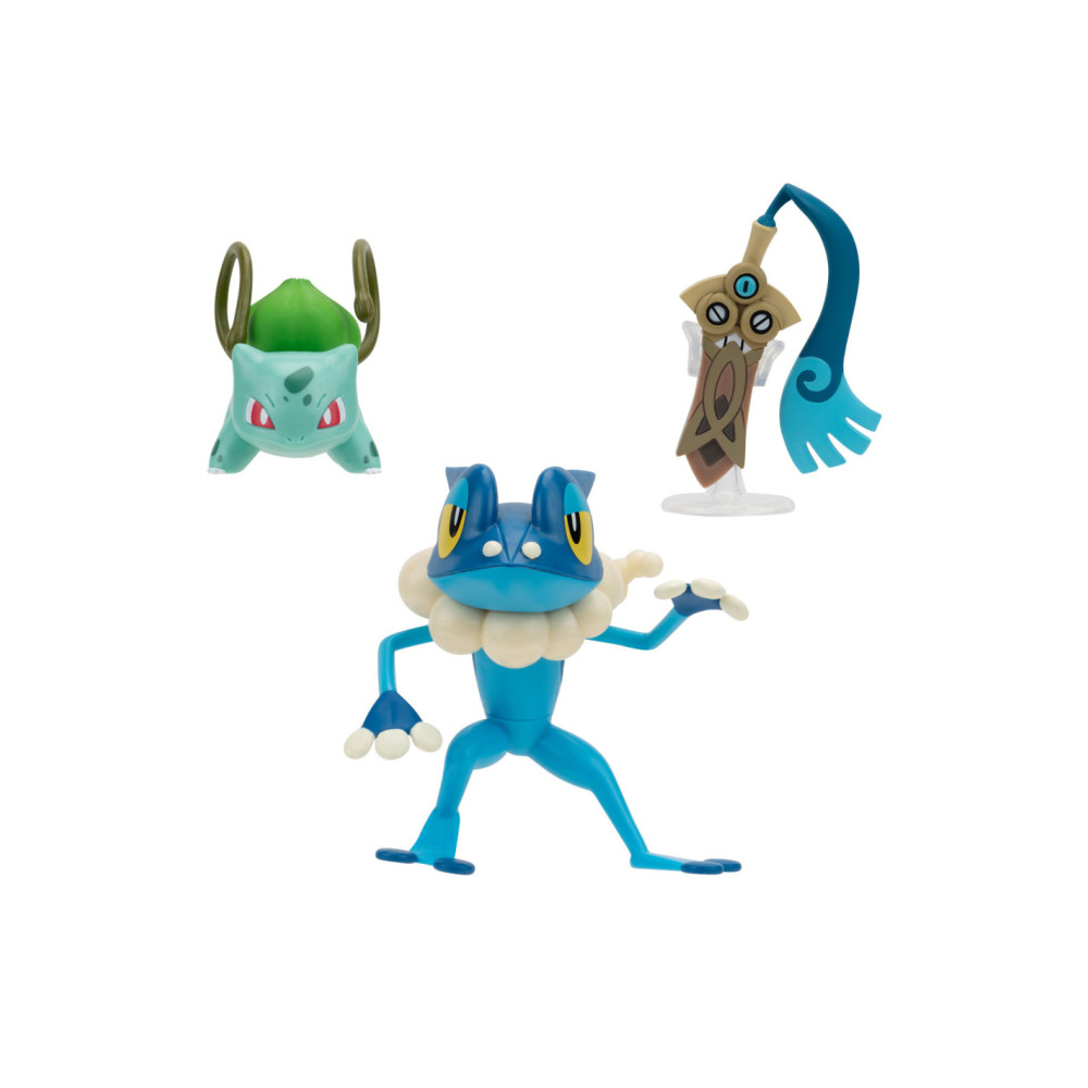 Deze set van drie figuren bevat Honedge, een mysterieuze spook- en staaltype Pokemon, Bulbasaur, een klassieke starter-Pokemon, en Frogadier, de ontwikkelde vorm van Froakie. Perfect voor fans van verschillende generaties Pokemon-spellen en -series.