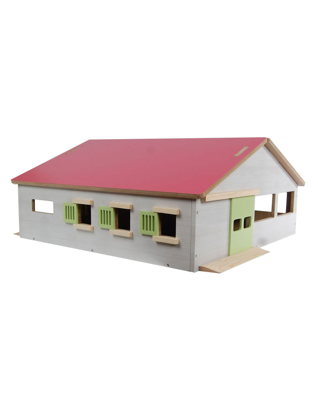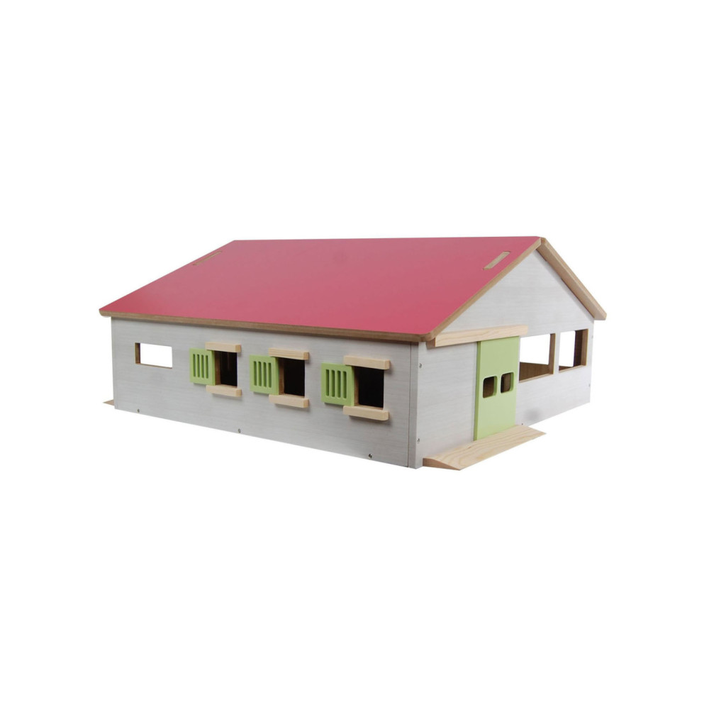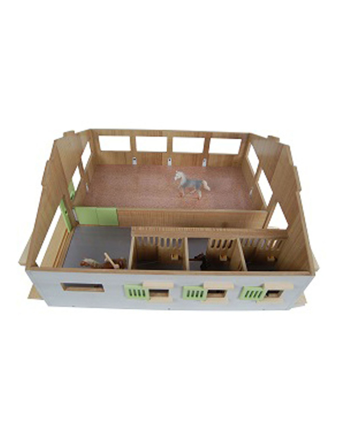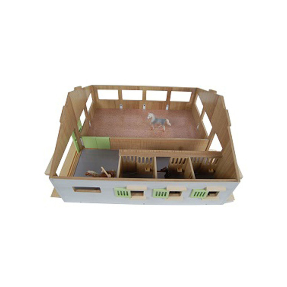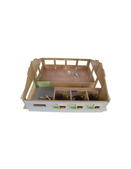 Luxe houten paardenstal van Kids Globe met boxen voor 3 paarden en een binnenbak. Afmeting: 62 bij 56 bij 26 cm.