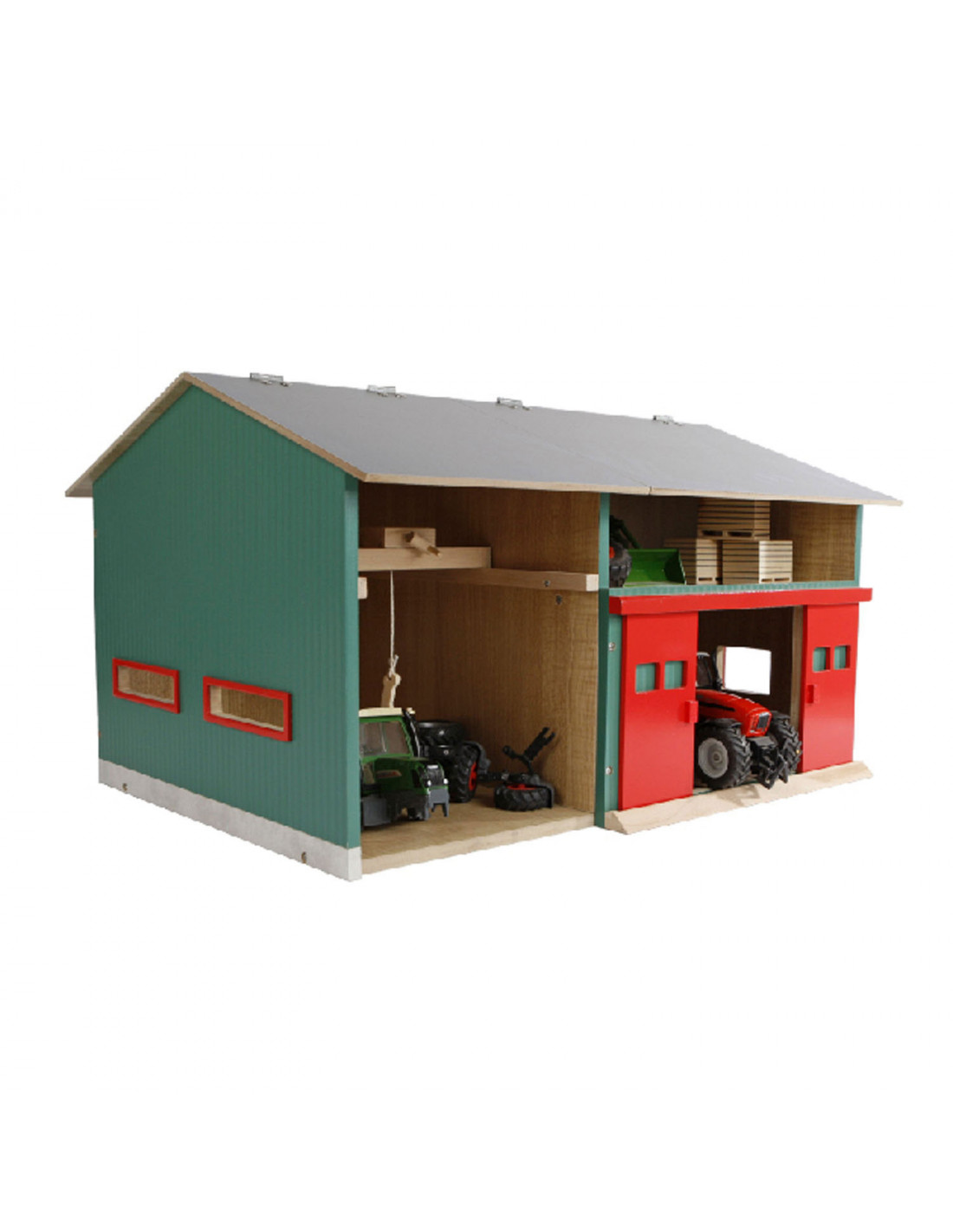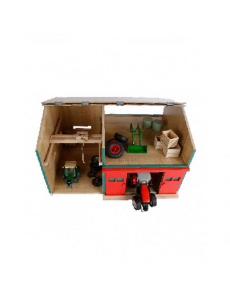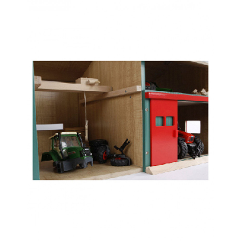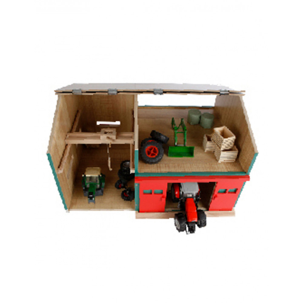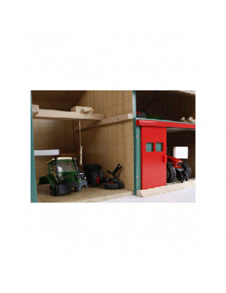 De Werkplaats met Berging heeft een open en gesloten gedeelte, waardoor kinderen de mogelijkheid hebben om realistische boerderijscenario's na te spelen. Aan de linkerkant bevindt zich een handige haak waarmee van alles getakeld kan worden, wat de speelmogelijkheden nog verder uitbreidt. Het rechtergedeelte biedt ruimte voor twee landbouwmachines in schaal 1:32. Laat de machines via de grote rode schuifdeuren naar binnen rijden en start met het 'onderhoud' in de werkplaats.