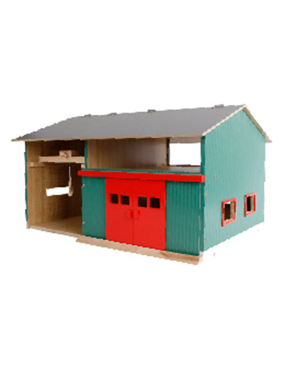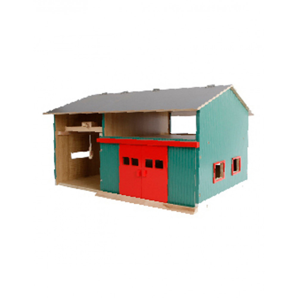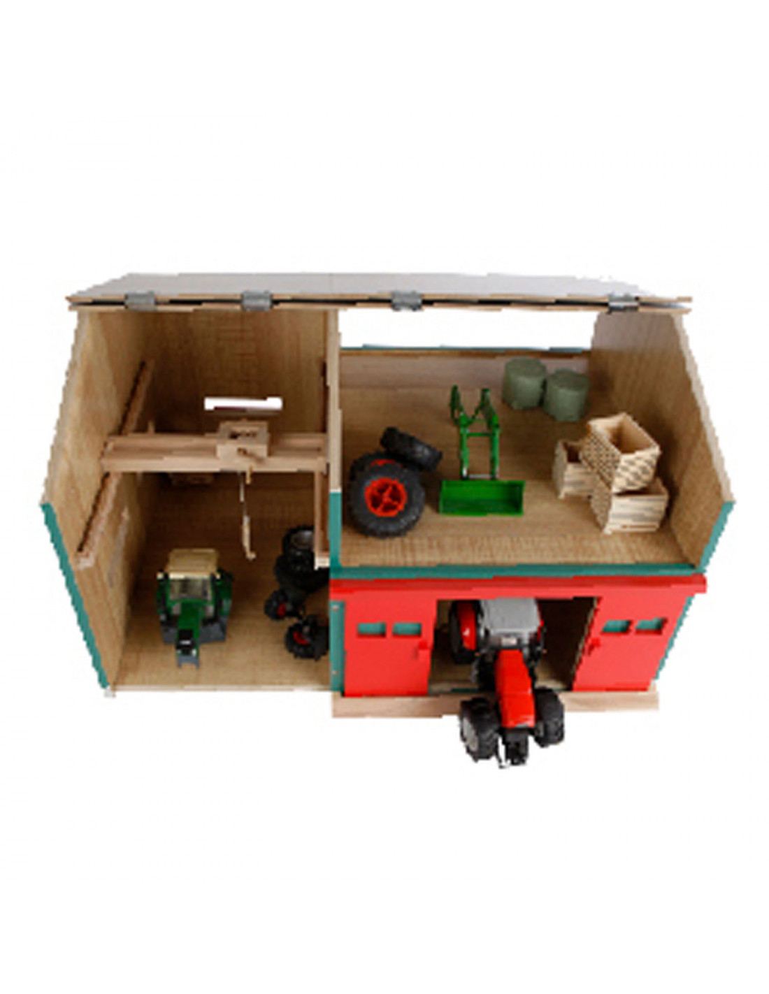 De Werkplaats met Berging heeft een open en gesloten gedeelte, waardoor kinderen de mogelijkheid hebben om realistische boerderijscenario's na te spelen. Aan de linkerkant bevindt zich een handige haak waarmee van alles getakeld kan worden, wat de speelmogelijkheden nog verder uitbreidt. Het rechtergedeelte biedt ruimte voor twee landbouwmachines in schaal 1:32. Laat de machines via de grote rode schuifdeuren naar binnen rijden en start met het 'onderhoud' in de werkplaats.
