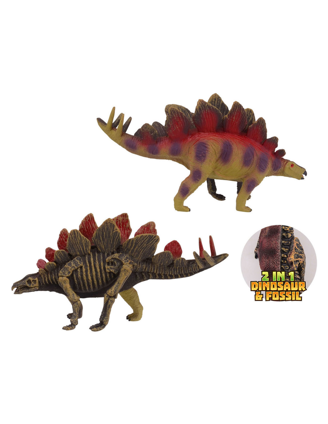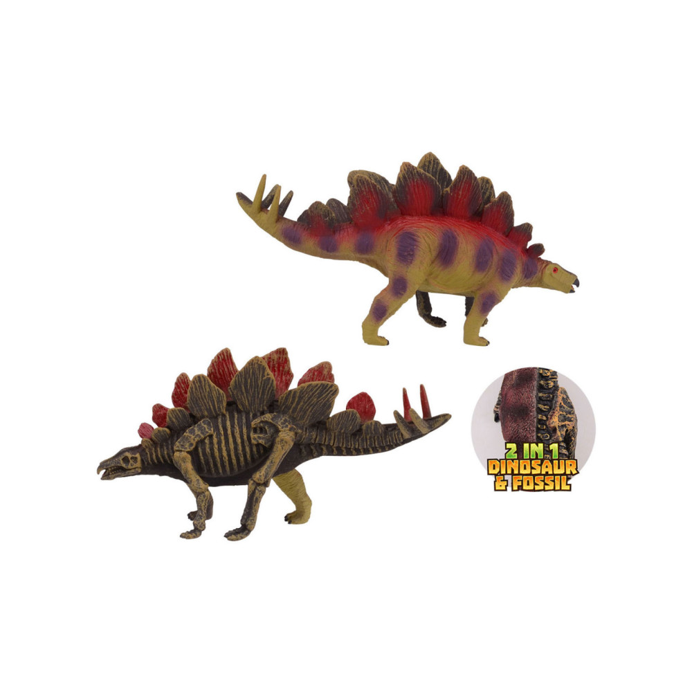 Tweezijdige speelfiguur van een spinosaurus. Aan de ene kant zie je de dino zoals hij eruitzag toen hij leefde, aan de andere kant kun je zijn skelet bestuderen zoals we die vandaag de dag zouden opgraven. Afmetingen: 23 x 8 x 14 centimeter. Geschikt vanaf 3 jaar.