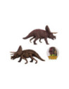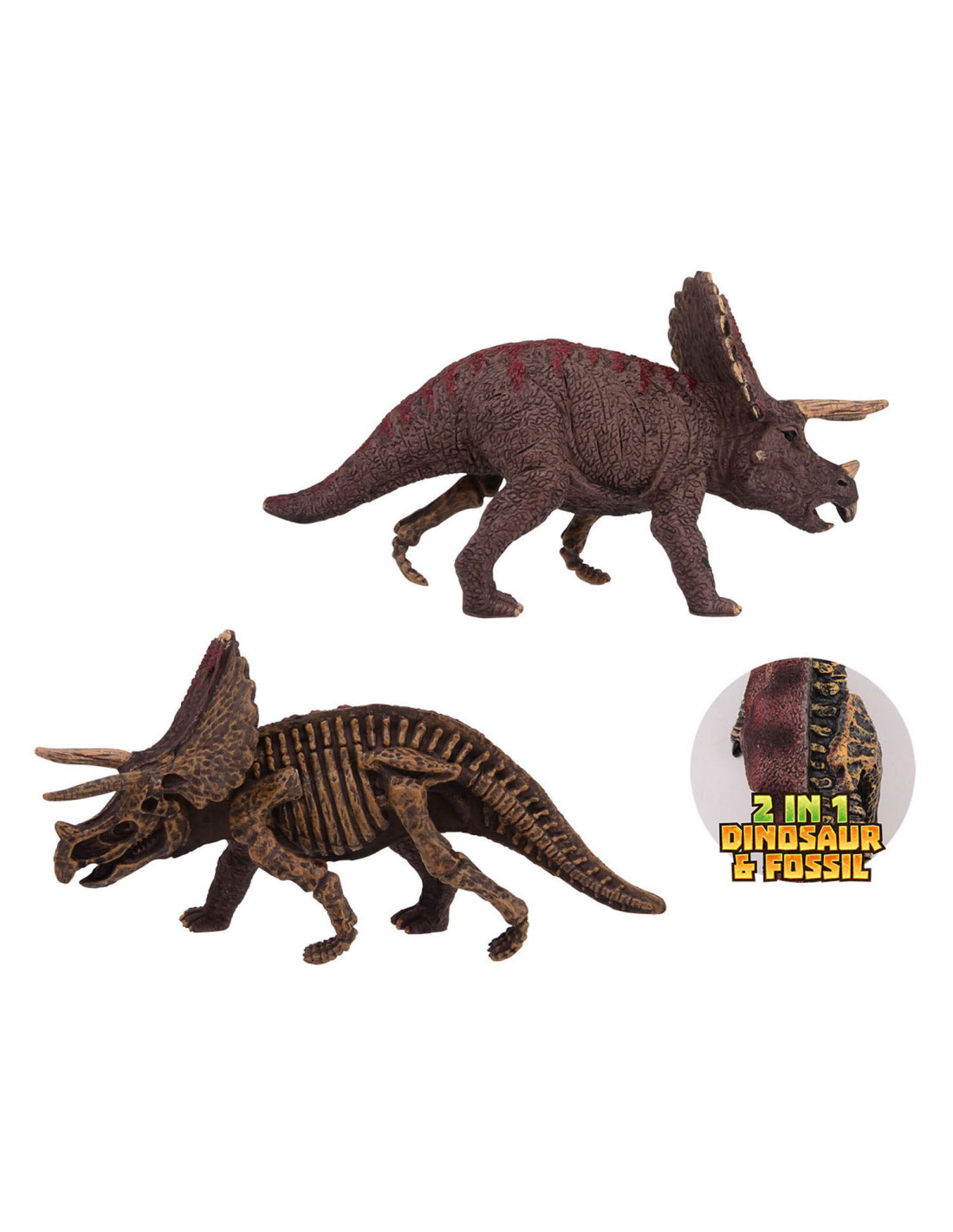 Tweezijdige speelfiguur van een triceratops. Aan de ene kant zie je de dino zoals hij eruitzag toen hij leefde, aan de andere kant kun je zijn skelet bestuderen zoals paleontologen hem nu zouden opgraven. Afmetingen: 23 x 8 x 14 centimeter. Geschikt vanaf 3 jaar.