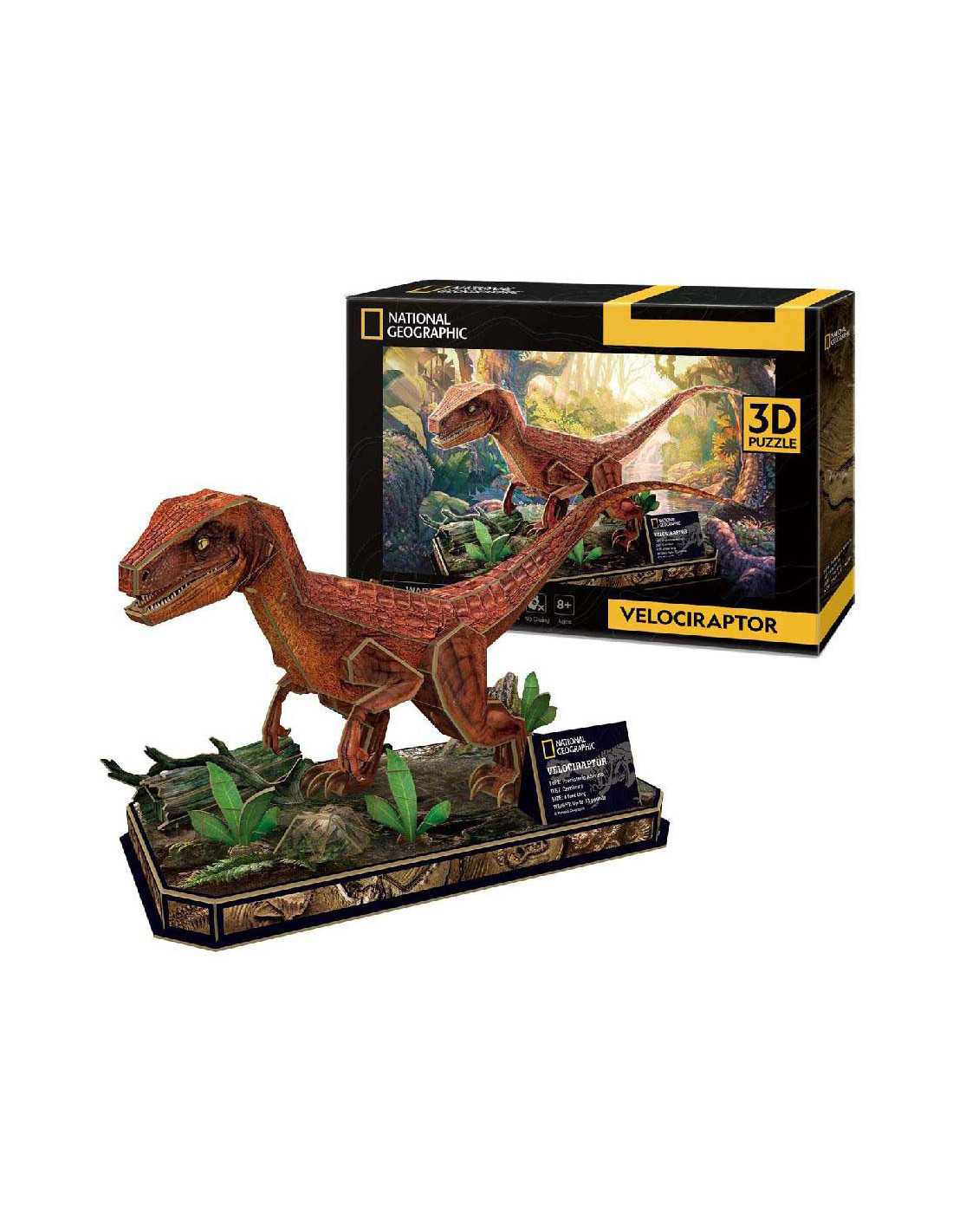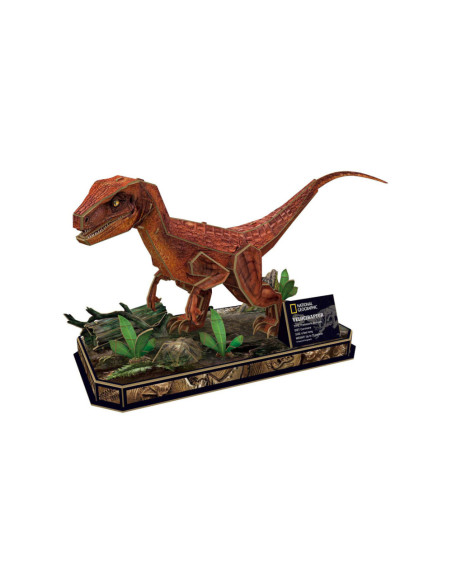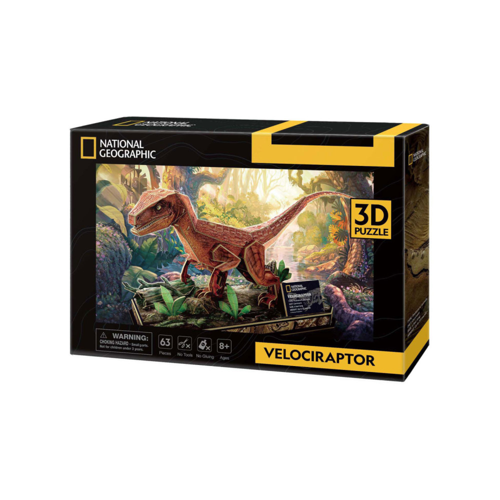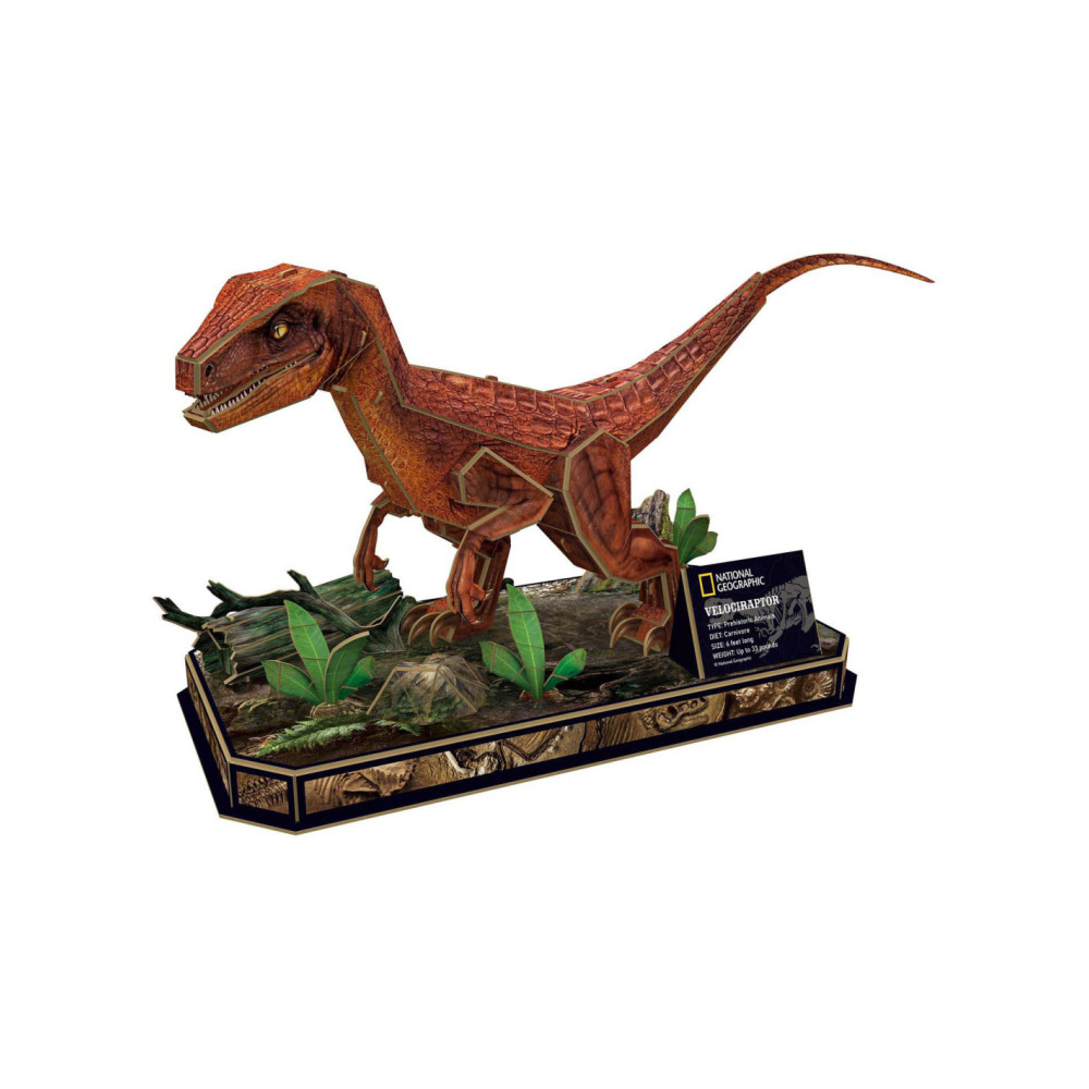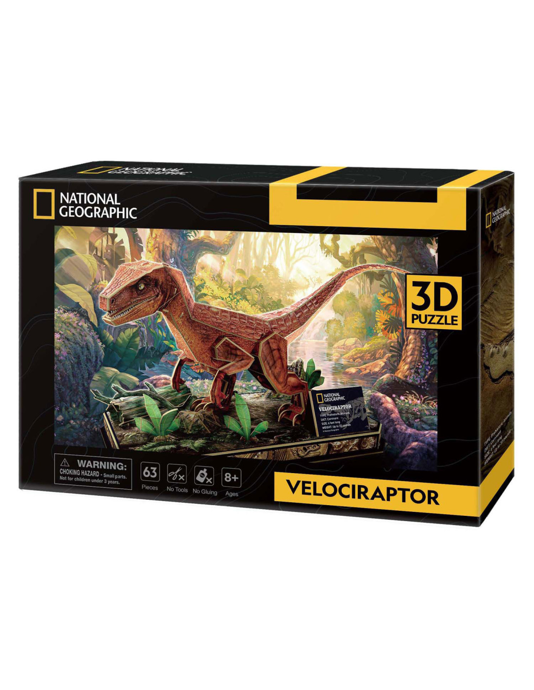 National Geographic 3D puzzel Velociraptor dinosaurus bouwpakket. Houten dinosaurus 3D puzzel om zelf in elkaar te zetten, met instucties. Materiaal: licht hout (triplex). Bestaat uit 63 onderdelen. Er is geen gereedschap of lijm nodig. Verpakt in een fraaie doos. Geschikt voor kinderen vanaf 8 jar.