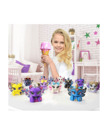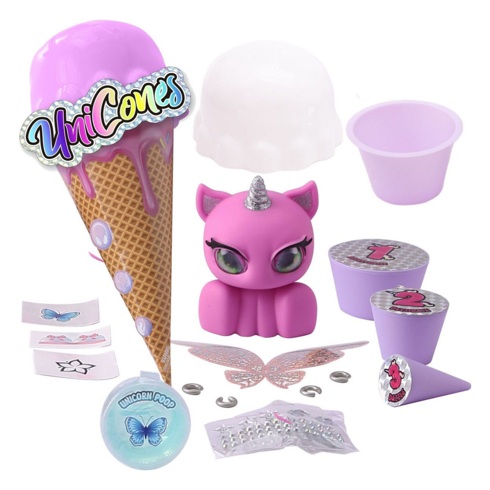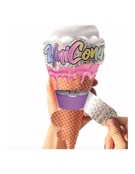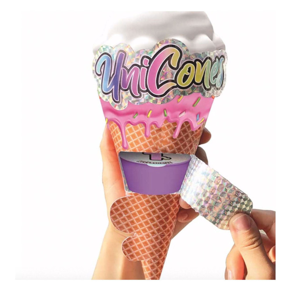 Maak kennis met de schattige, sprankelende Unicones, die verborgen zitten in een kleurrijk ijshoorntje! Beleef een leuke unboxing ervaring met de Unicones IJsjes, want door het afpellen van de vakjes op het hoorntje ontdek je 1 van de 12 Unicorns en nog eens 7 verrassingen om je Unicorn mee aan te kleden en te versieren! De Unicorns voelen zacht aan, hebben mooi gedetailleerde vleugels en leuke stickers, accessoires en decoraties. Een van de verrassingen is een slijmige verrassing: Unicorn poep! Haal de accessoires tevoorschijn en kleed je nieuwe vriend aan! Er zijn 12 verschillende Unicorns te verzamelen, allemaal met een eigen naam en hun eigen unieke accessoires. Welke Unicorn unbox jij? 1 ding is zeker: ze zijn allemaal kleurrijk en leuk! Leeftijdsindicatie: 5 jaar+.