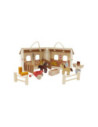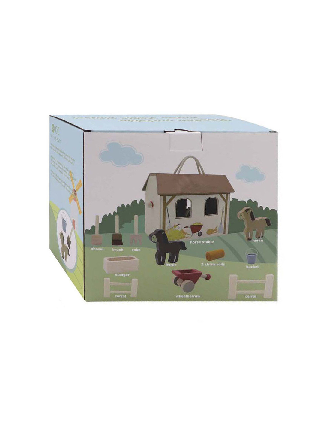13-delige houten paardenstal speelset, inclusief verschillende accessoires.